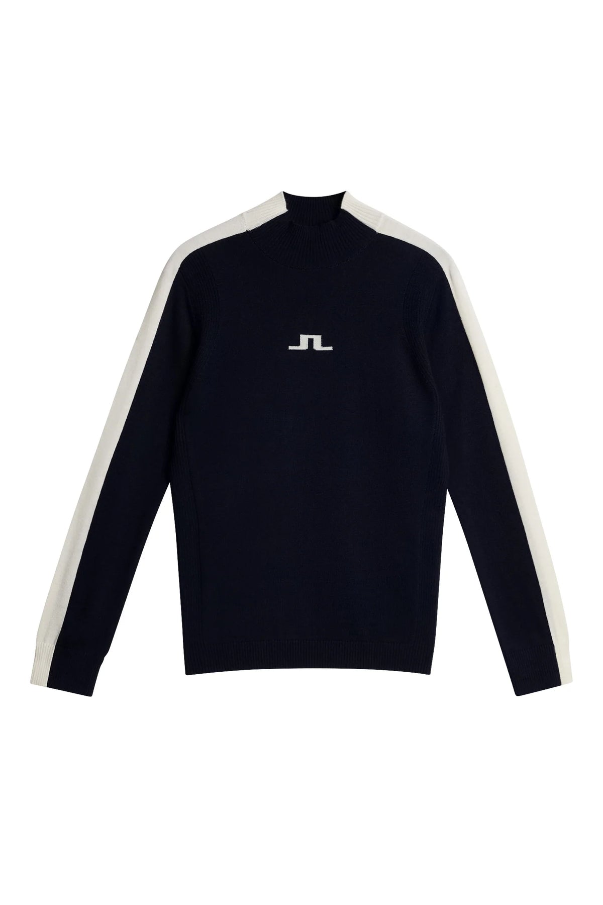 Adeline Knitted Sweater fra J.Lindeberg. Adeline Knitted Sweater fra J.Lindeberg kombinerer sporty funksjonalitet med et luksuriøst uttrykk. Genseren er laget i en myk ullblanding som holder deg varm uten å føles tung, med kontraststriper langs ermene og det ikoniske JL-logoet på brystet. Perfekt både til golfbanen og til hverdags for en stilren athleisure-look.