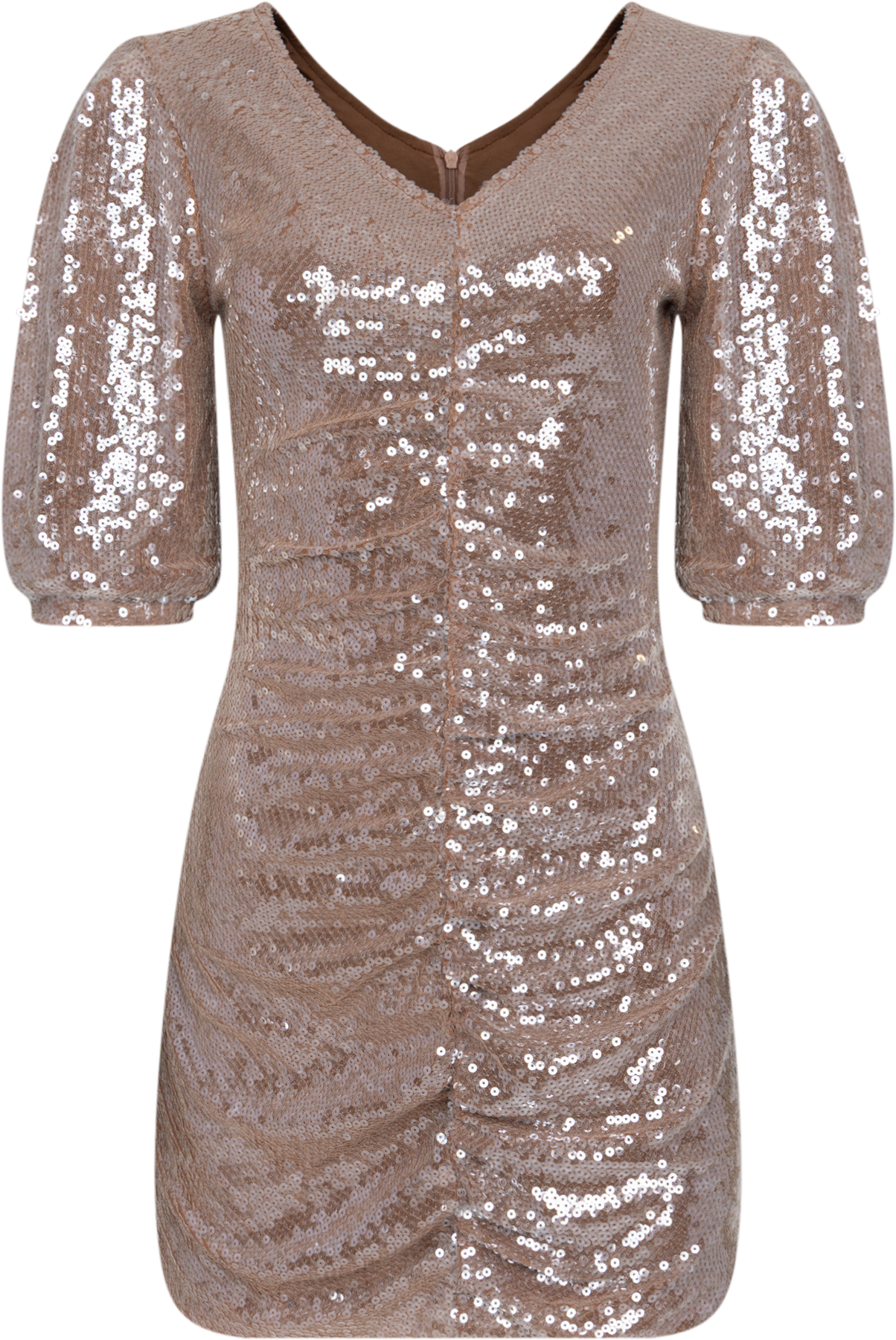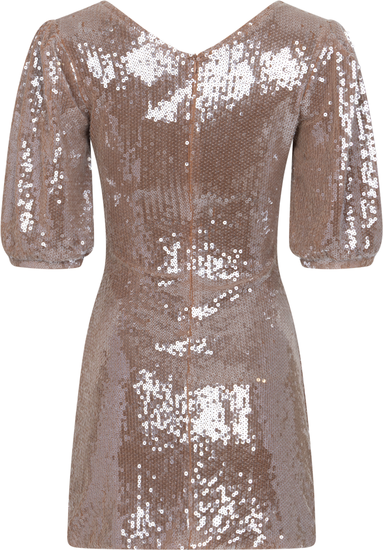 Aliceic Dress fra BYIC. Glitrende minikjole fra BYIC dekket av paljetter. Aliceic Dress har v-utringning, lett puffede ermer og flatterende rynkedetaljer som former silhuetten. Den skinnende overflaten gir et luksuriøst uttrykk – perfekt til julebord, bursdag eller en kveld ute.