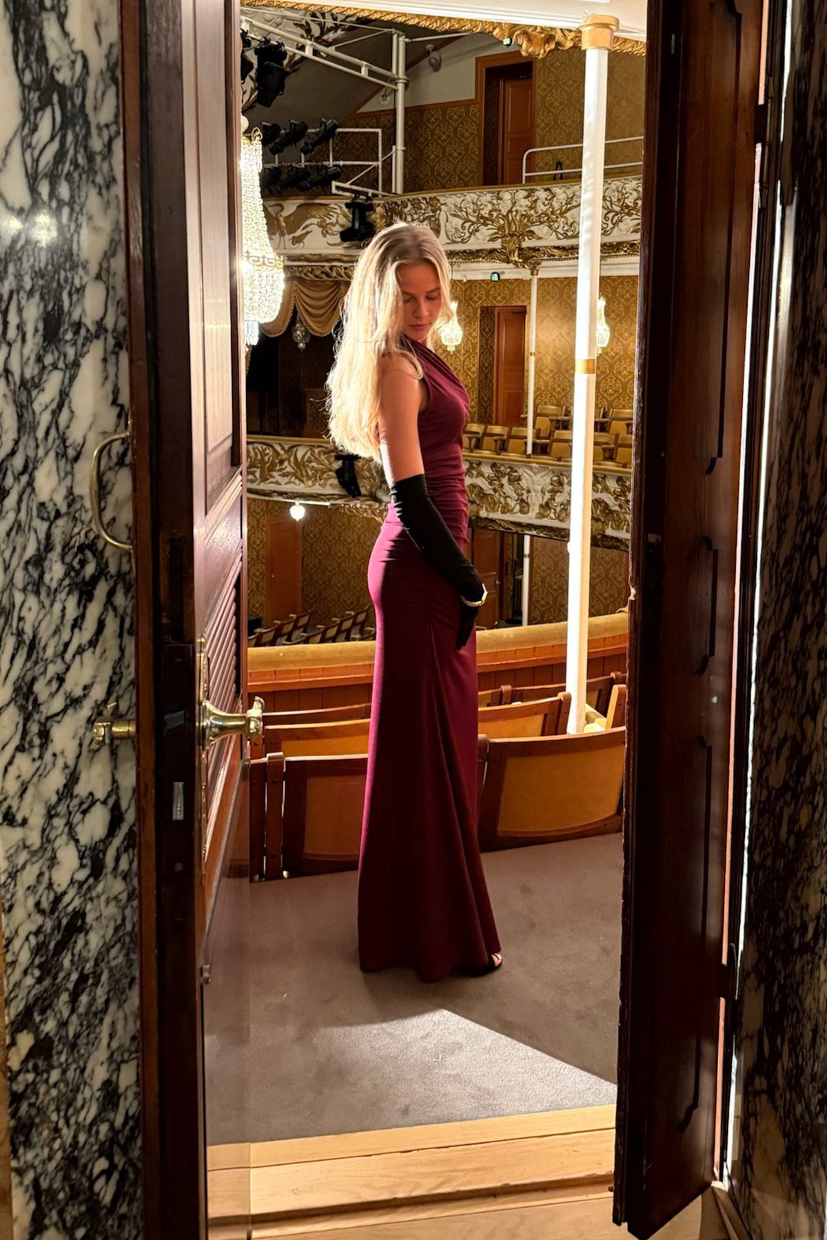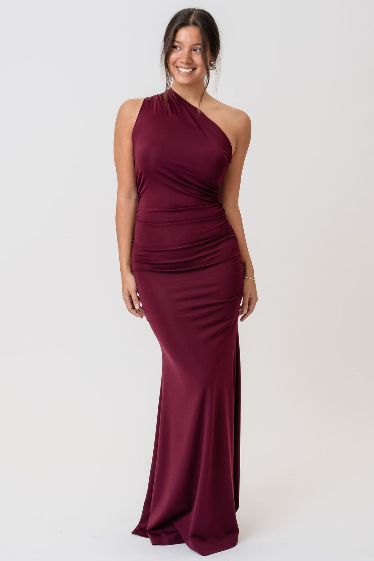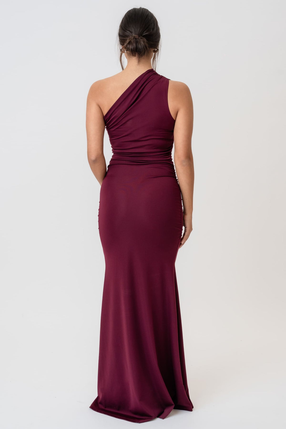 Den har lekre rynkedetaljer i siden som skaper en nydelig draperingseffekt over midjen og hoftene. Det lange skjørtet faller elegant, og den dype bordeaux-fargen gjør den til et selvsagt valg for alt fra bryllup til nyttårsfeiring.