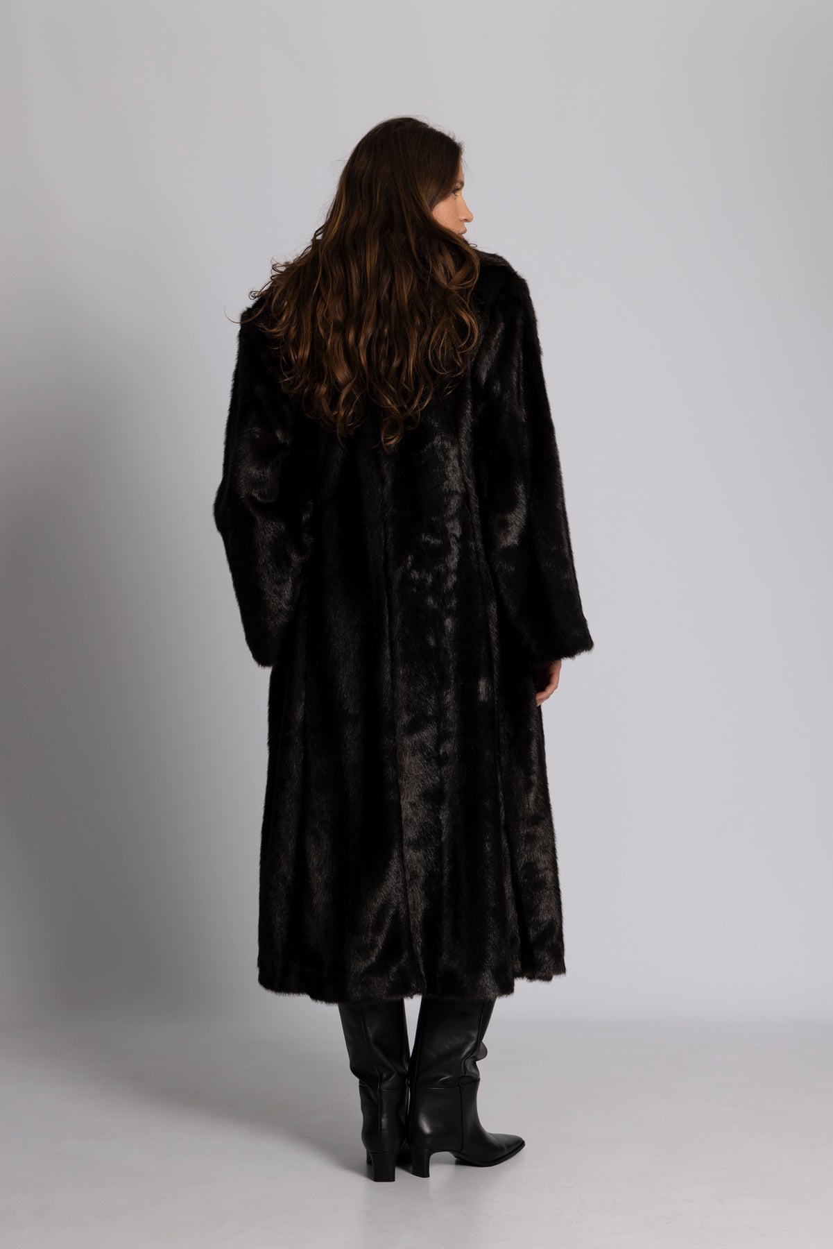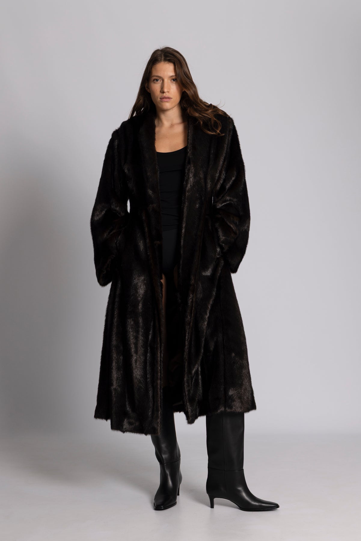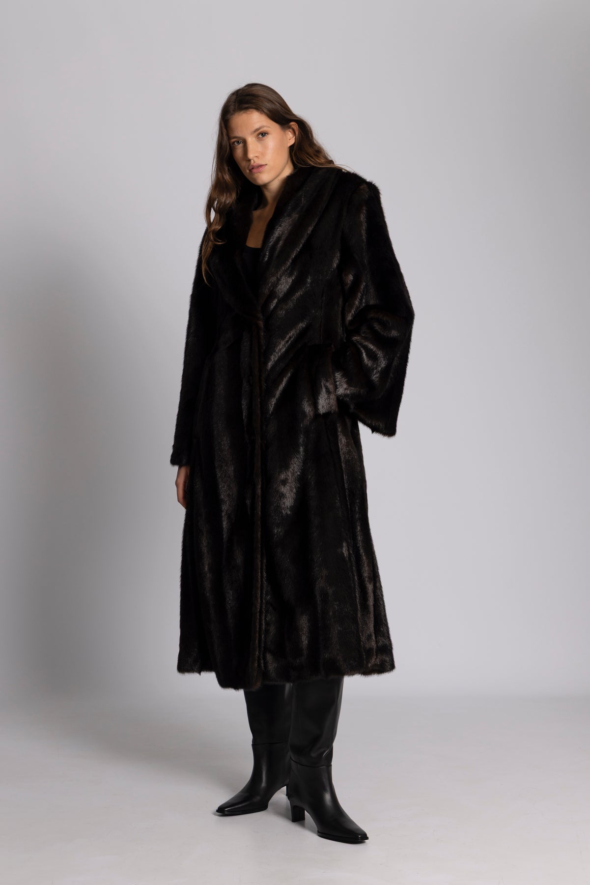 Angela Faux Fur Coat fra VILLOID av Polliani. Angela Faux Fur Coat er en dramatisk og elegant fuskepelskåpe med tidløs silhuett. Den lange fasongen og myke, glansfulle faux fur-overflaten i mørk brun gir et luksuriøst uttrykk som løfter ethvert antrekk. Med bred krage, dype lommer og en flatterende A-linjeform er dette sesongens ultimate statement coat.