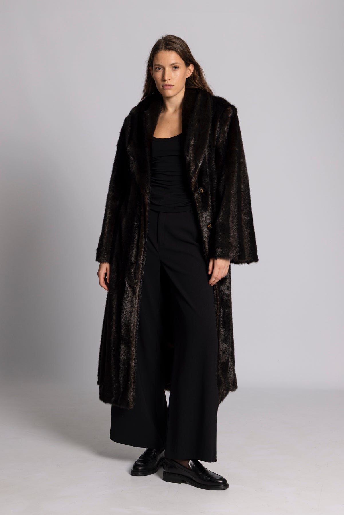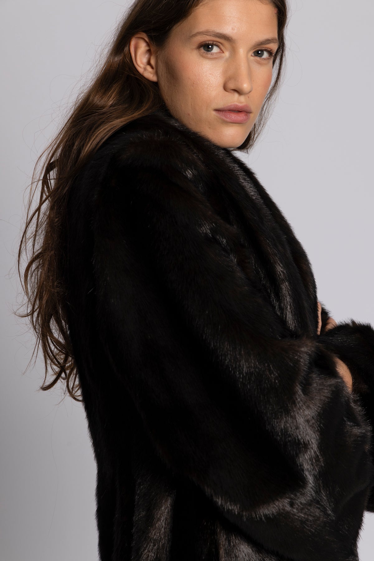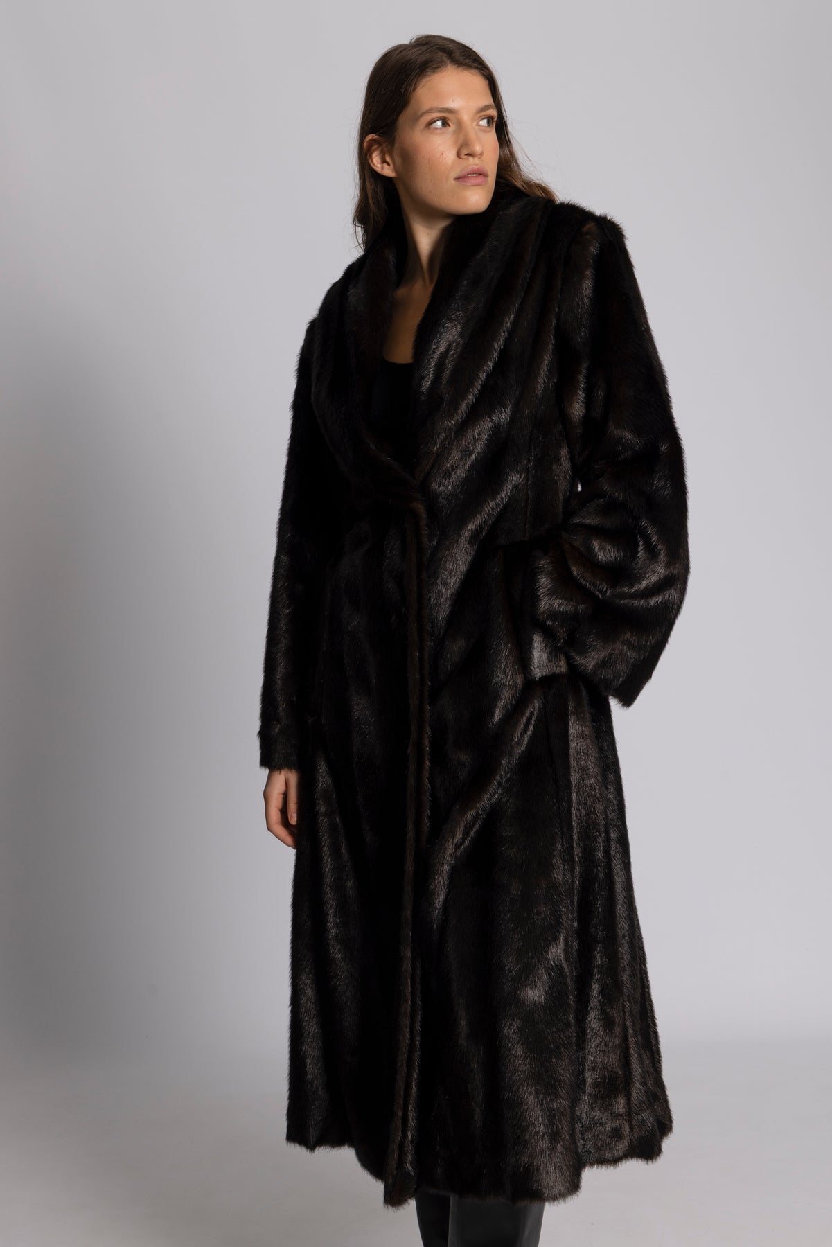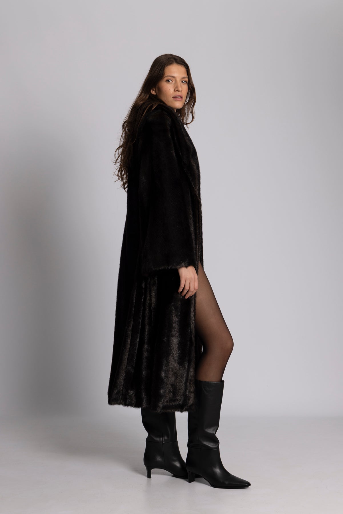 Angela Faux Fur Coat fra VILLOID av Polliani. Angela Faux Fur Coat er en dramatisk og elegant fuskepelskåpe med tidløs silhuett. Den lange fasongen og myke, glansfulle faux fur-overflaten i mørk brun gir et luksuriøst uttrykk som løfter ethvert antrekk. Med bred krage, dype lommer og en flatterende A-linjeform er dette sesongens ultimate statement coat.
