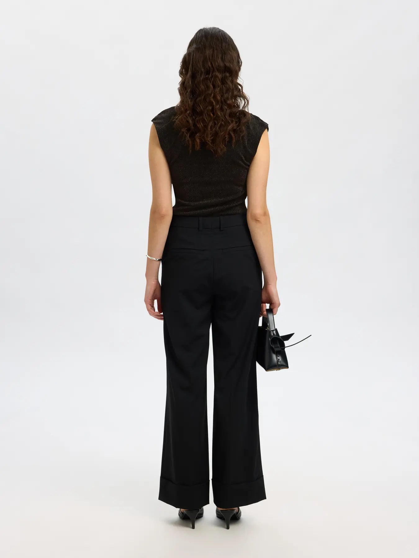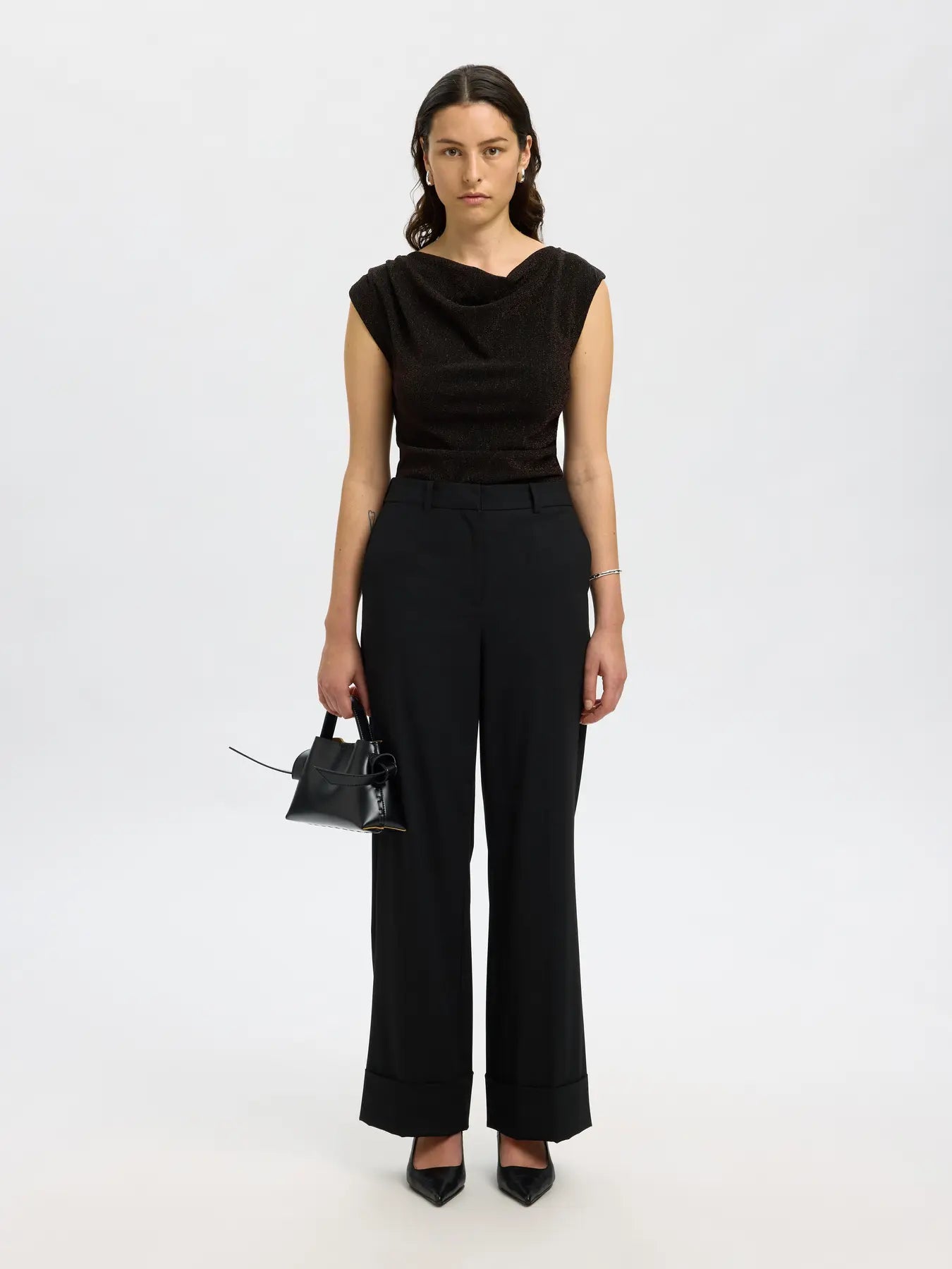 Anja Sl Slim Top fra Selected Femme. Cool topp fra Selected Femme. Anja Sl Slim Top har rund hals med flatterende drapering, korte ermer og en smal passform. Toppen kommer i sort og er dekorert med subtilt glitter som gir en elegant og pyntet look. Style den med dressbukser og en fin veske til fest!