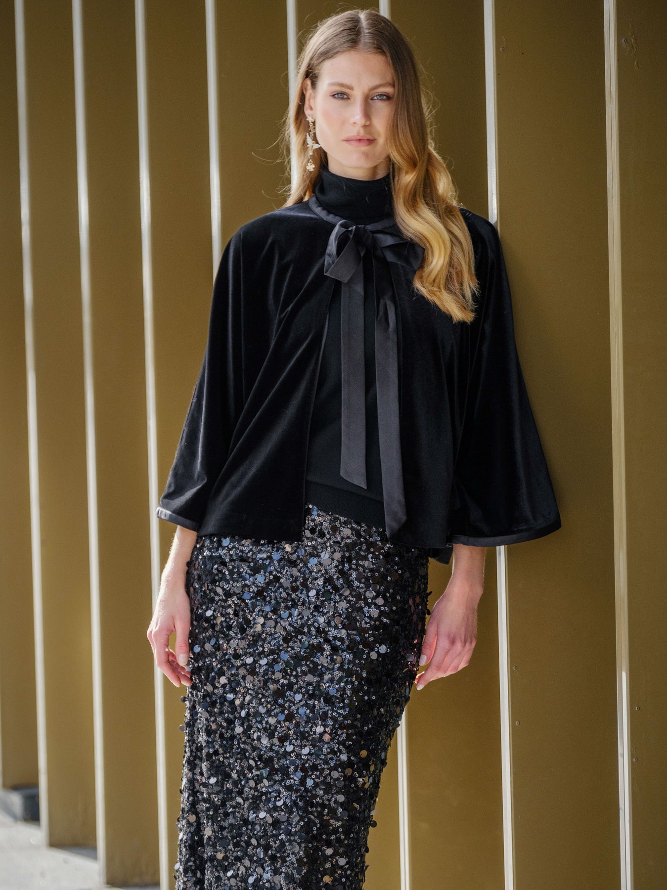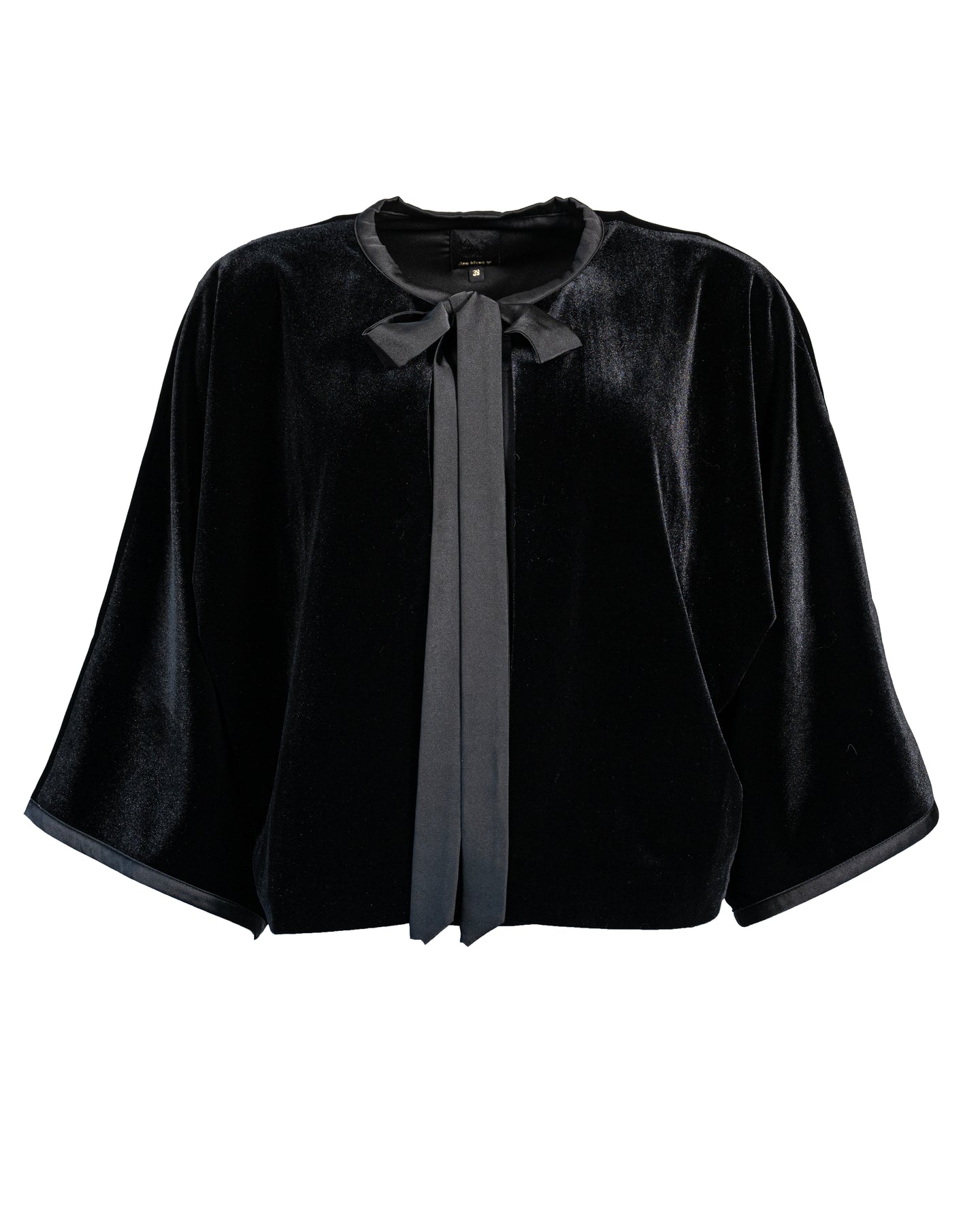 Ariel Jacket fra Ane Mone. Ariel Jacket fra Ane Mone er en luksuriøs cape-jakke i myk fløyel som gir antrekket et elegant løft. Den har en løs og flatterende passform med vide ermer og et feminint knytebånd i halsen som tilfører et sofistikert uttrykk. Perfekt å style over en kjole eller et skjørt for en moderne festlook med klassisk eleganse.