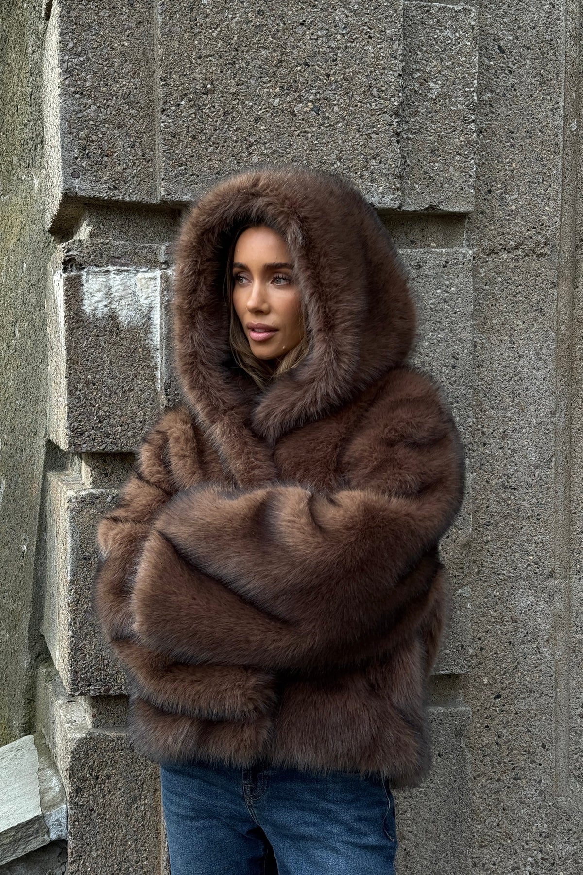 Items in cart: 0 Cart total: 0Astrid Faux Fur Jacket fra BOUVETI. Eksklusiv statement-jakke i myk fuskepels som gir en luksuriøs følelse. Jakken har en generøs, oversized passform med voluminøse ermer og en stor hette som rammer inn ansiktet. Den vakre sjokoladebrune fargen gjør den til et blikkfang, perfekt for kalde dager der du vil kombinere komfort og glam. Lukkes med skjulte hemper i front for et rent uttrykk.