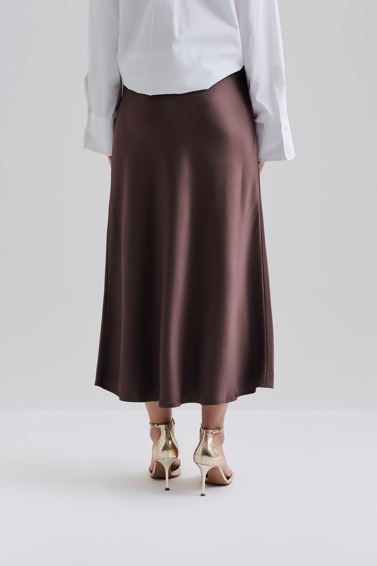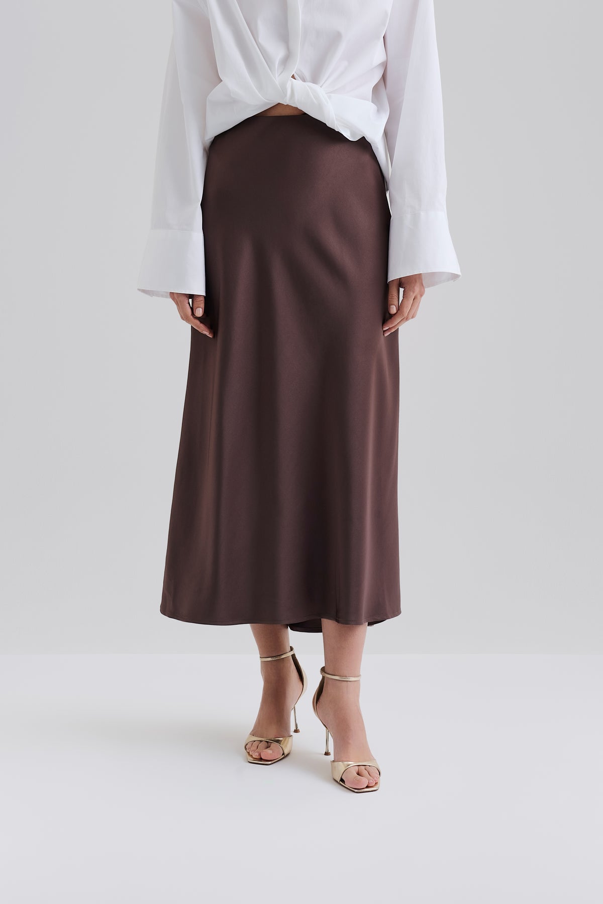 Aubree Satin Midi Skirt fra MALINA. Aubree Satin Midi Skirt er et tidløst og elegant skjørt laget i en flytende satengkvalitet som gir et luksuriøst shine og en flatterende silhuett. Skjørtet har en høy midje og et klassisk A-linje snitt som faller mykt mot leggen – perfekt både til hverdags og fest.