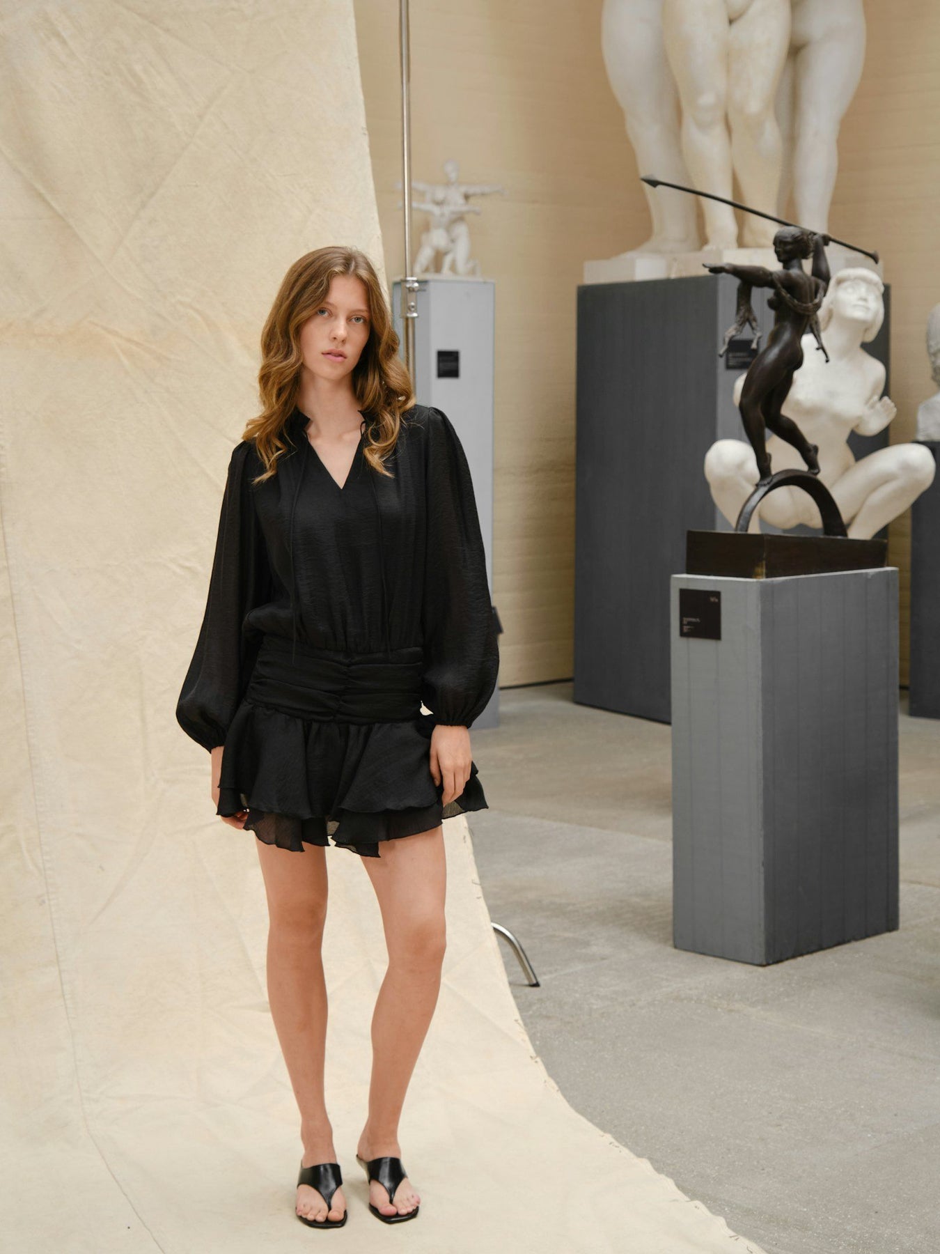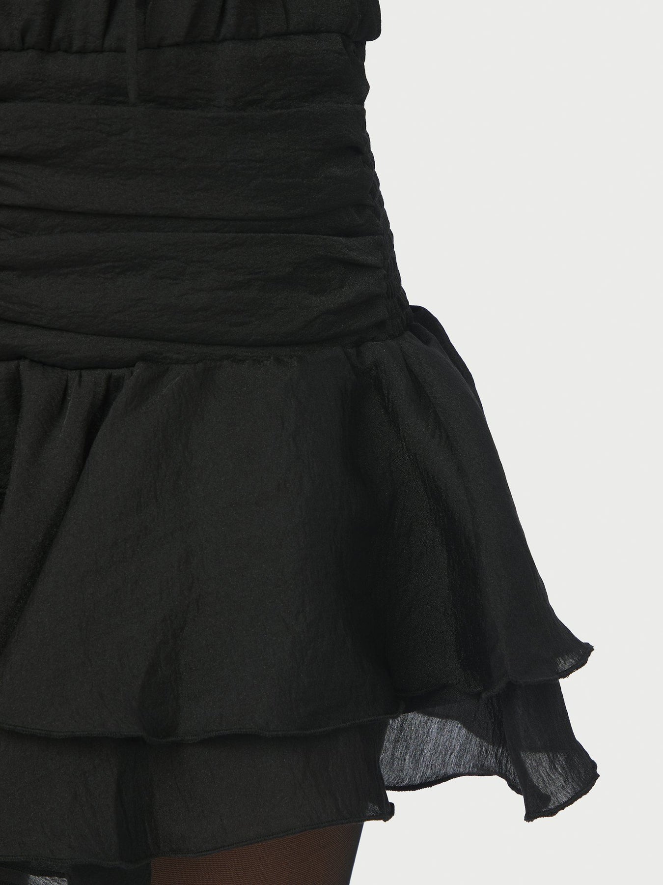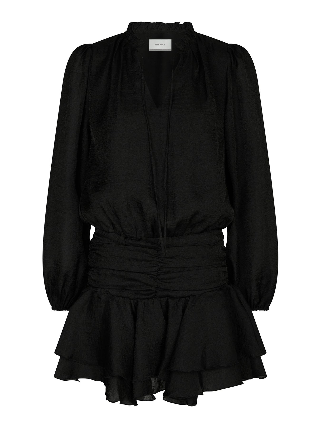 Bari Chiffon Dress er en elegant og feminin kjole fra Neo Noir, perfekt for enhver festlig anledning. Kjolen er laget i en lett og delikat chiffon-kvalitet med en subtil tekstur. Den har en flatterende V-hals med en liten rysjekrage og knytebånd, og lange, voluminøse ballongermer som gir et sofistikert uttrykk. Den brede smocken i midjen skaper en nydelig silhuett og fremhever figuren, mens det korte skjørtet med doble kapper gir et lekent og luftig preg.