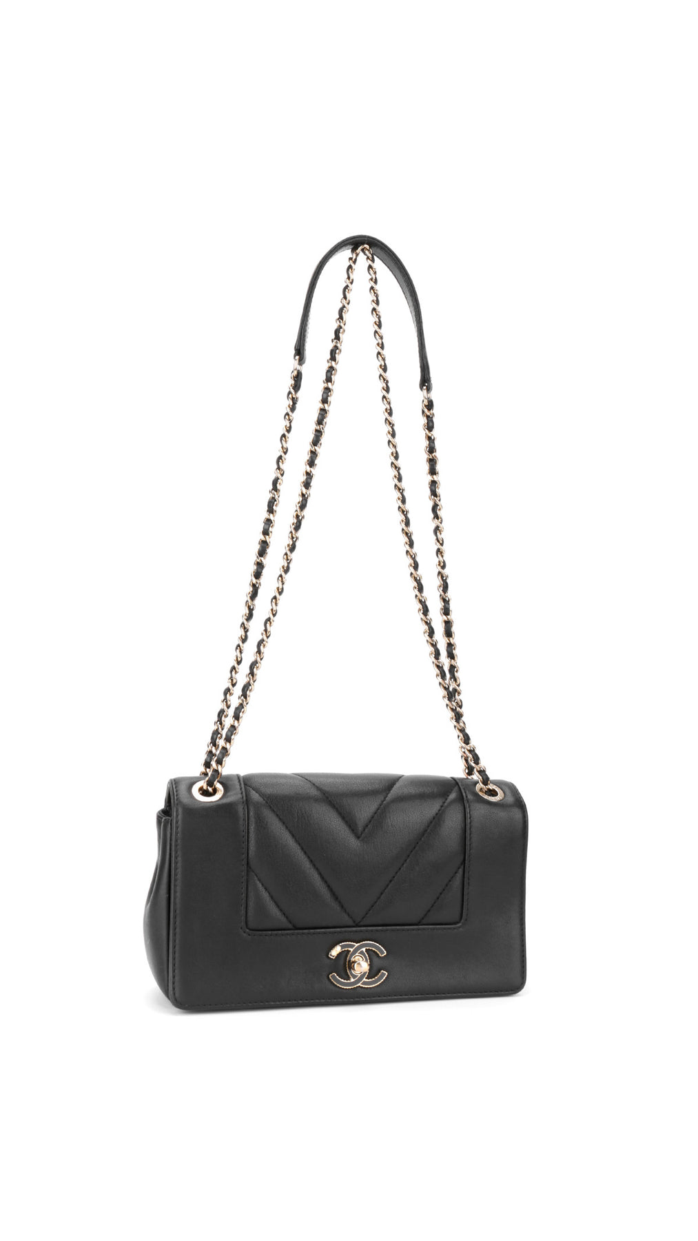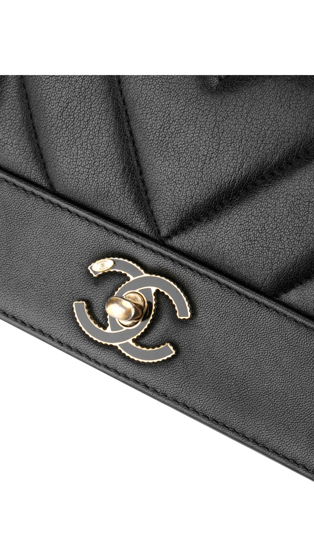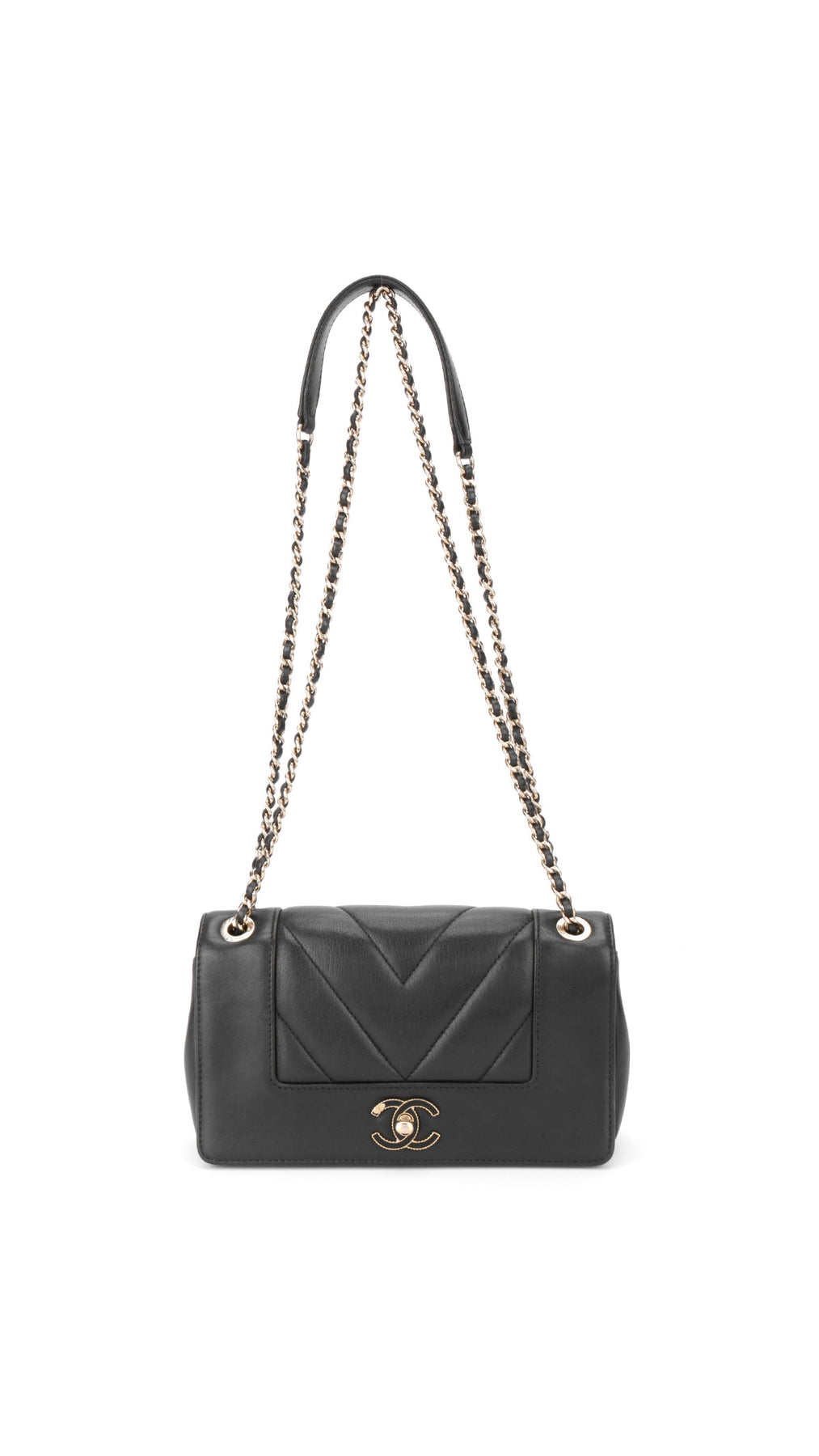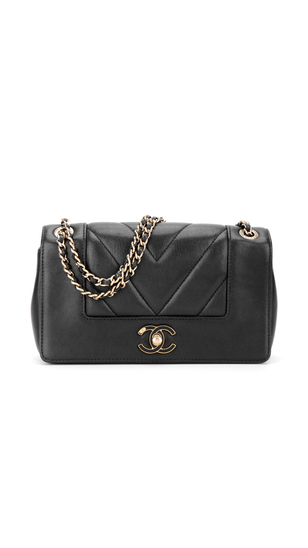 Vesken er utsmykket med den klassiske CC-vridlåsen i gullfarget metall og en kjedestropp som kan bæres både crossbody og på skulderen. En perfekt Chanel-modell for deg som ønsker en kombinasjon av klassisk eleganse og diskret eksklusivitet.