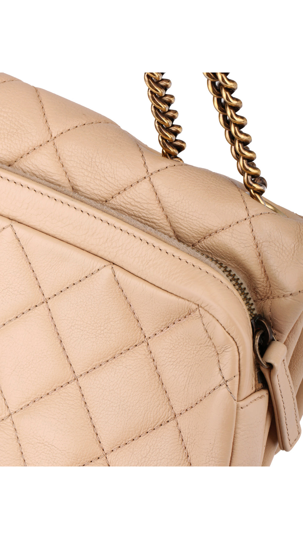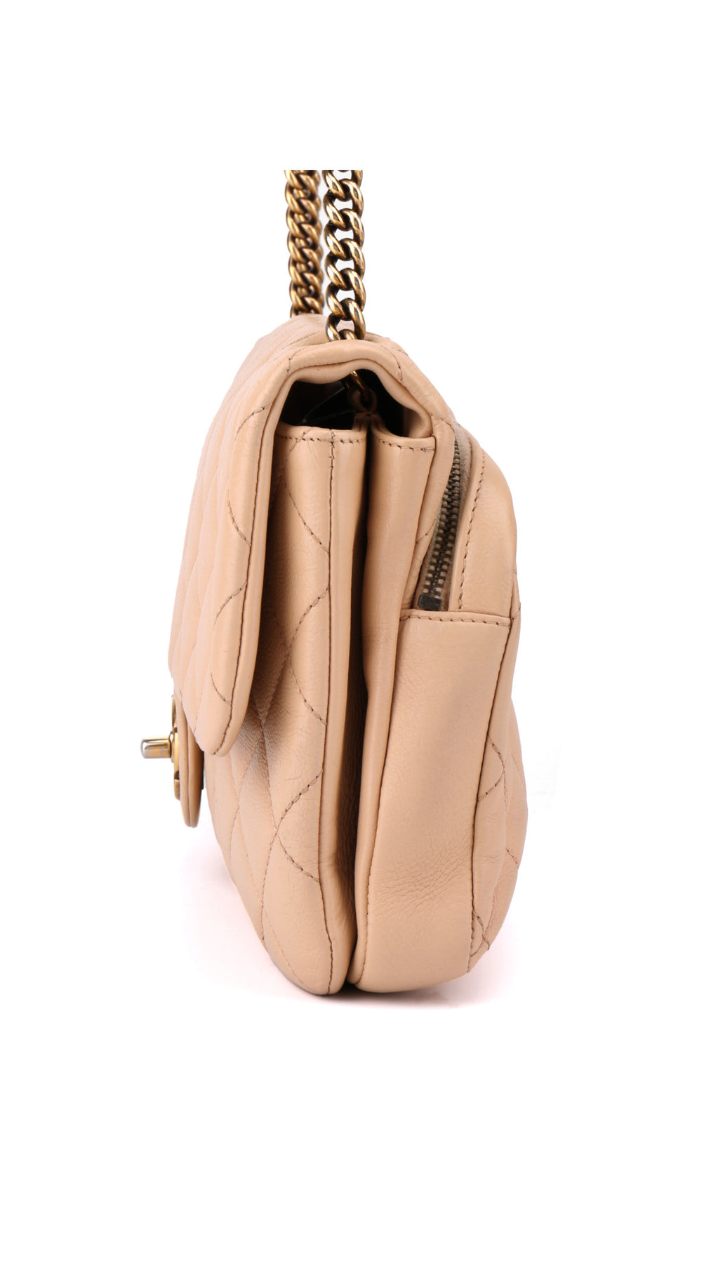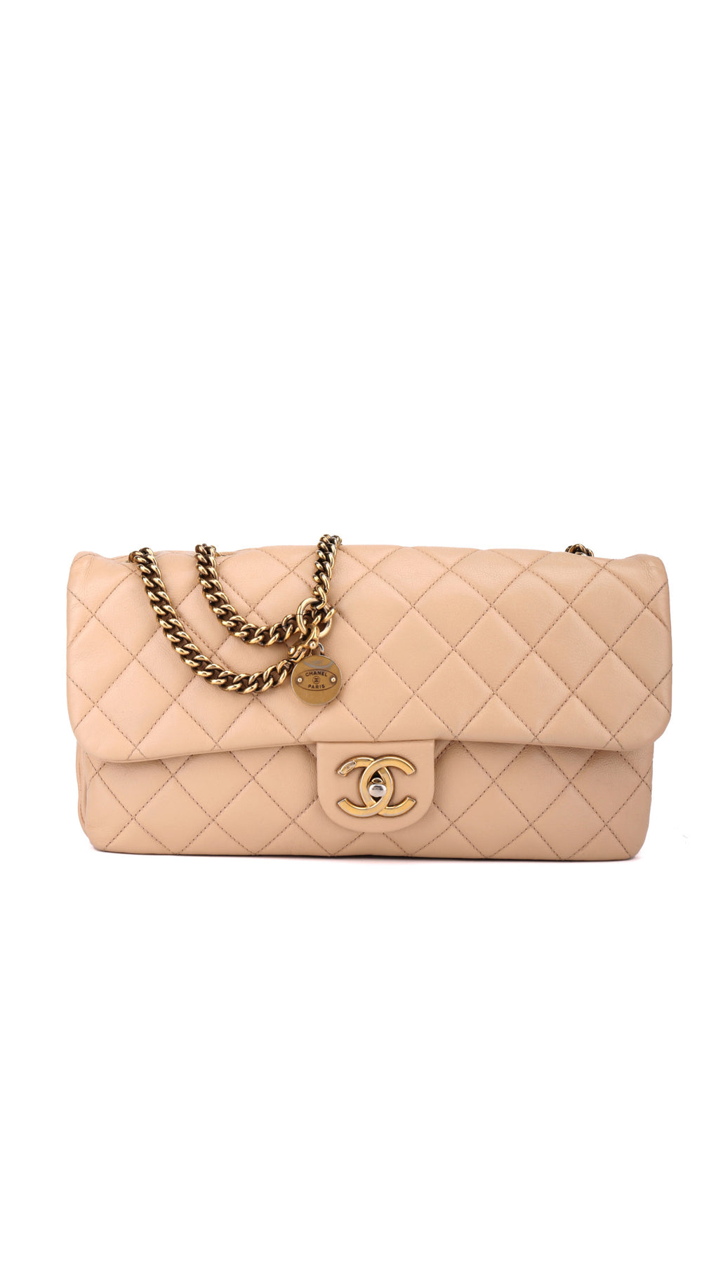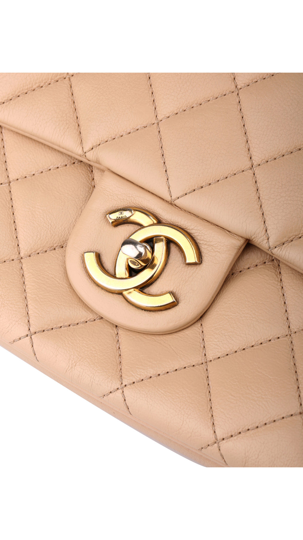 Denne vakre Chanel-vesken er laget i mykt beige calfskinn med det ikoniske quiltede mønsteret, kombinert med gullfarget metallhardware og den klassiske CC-turnlock-låsen som gir et tidløst og sofistikert uttrykk.