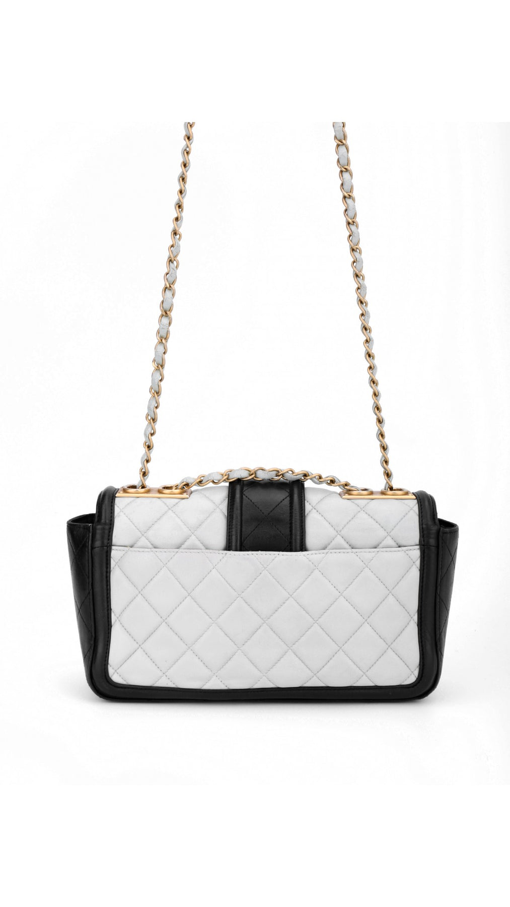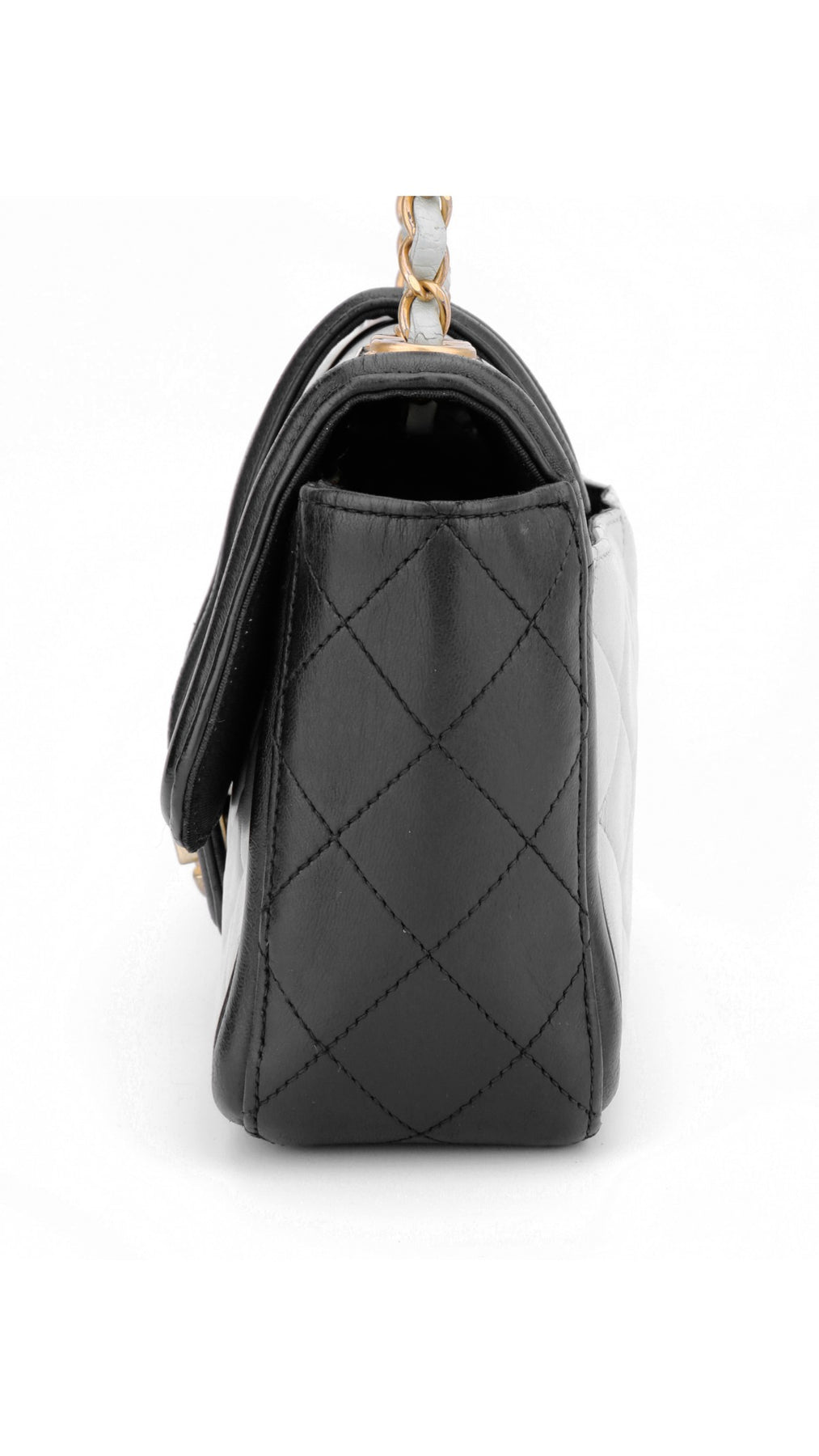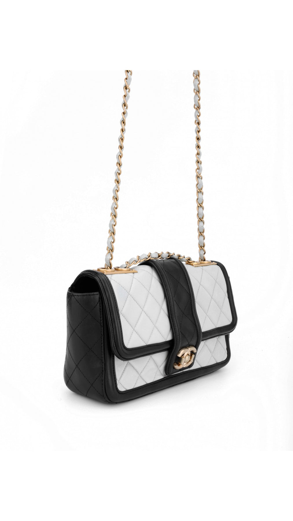 Chanel Classic Flap Bag i lammeskinn er en tidløs og ikonisk veske – et ekte samleobjekt for enhver Chanel-elsker. Denne utgaven er en vintage skatt med 24K gullbelagt hardware, og kombinerer klassisk eleganse med den luksuriøse følelsen av mykt lammeskinn. Det totonede designet i sort og lyseblått tilfører et unikt og sofistikert uttrykk.
