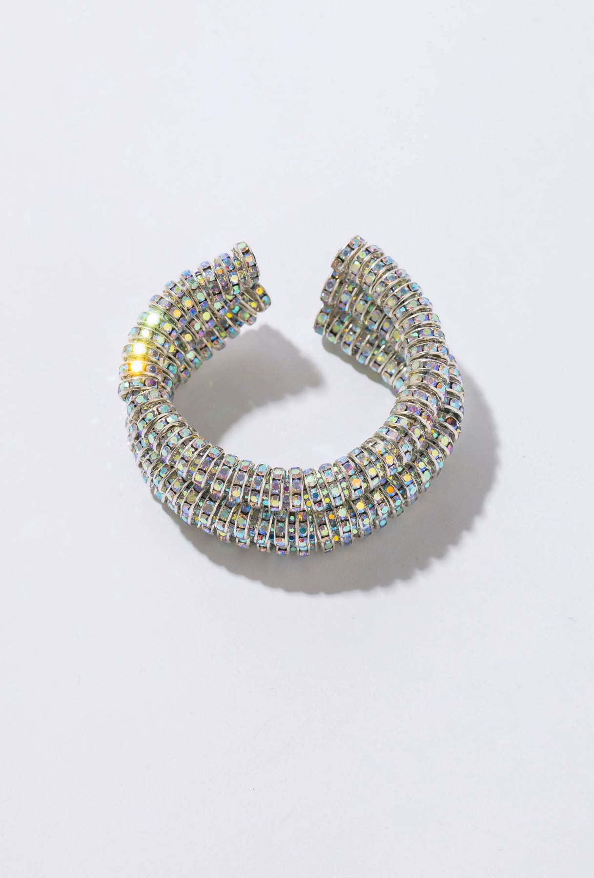Cleopatra Bangle fra Pearl Octopuss.y. Med tre rader med glitrende krystallperler er denne kraftige statement-armringen et enkelt valg for å ta enhver antrekk et hakk videre. Laget av fleksibel ståltråd med åpen lukking, kan armringen justeres for å passe forskjellige håndleddsstørrelser.