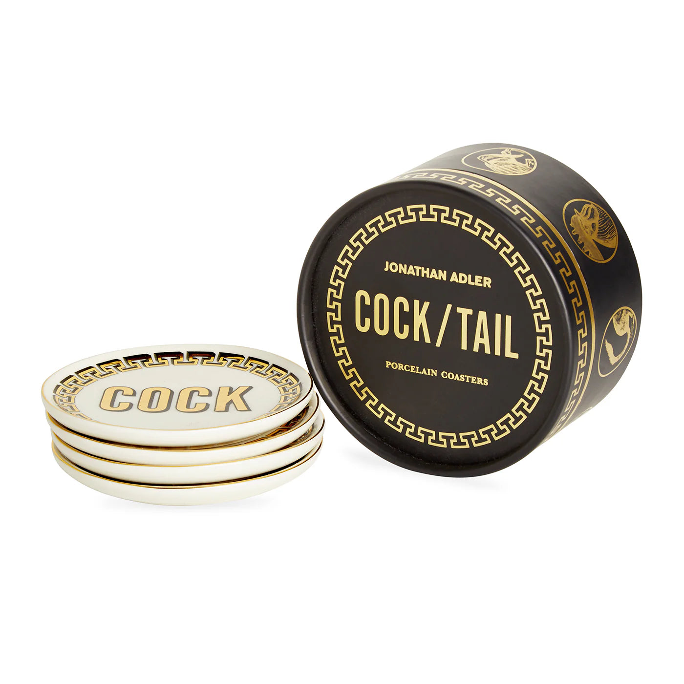 Cock/Tail Coasters fra Jonathan Adler. Fokuser på det som virkelig betyr noe (en drink) med Jonathan Adlers coasters. En dristig kunngjøring laget av høybrent porselen og utsmykket med gulldetaljer. Pakket i en stilig gaveeske, er de en perfekt vertinnegave (eller en oppmuntrende gave til deg selv).