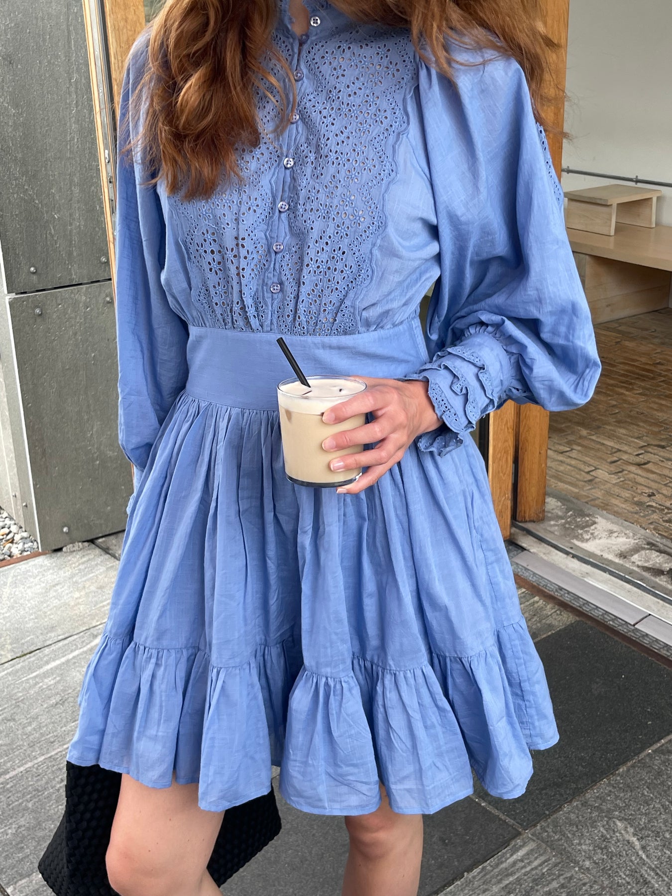 Cotton Slub Mini Dress fra byTiMo. En nydelig minikjole fra byTiMo i sommerlig blå. Cotton Slub Mini Dress er kuttet i byTiMos lette og myke bomull- og viskoseblanding med slubdetaljer i stoffet. Den har en minilengde og definert midje med smock i ryggen. Kjolen har oversizede, vintage-inspirerte ermer og er satt inn med broderie anglaise detaljer på brystet, ermene, mansjettene og halsen. Cotton Slub Mini Dress har et feminint A-formet skjørt med volum og knappelukking i halsen.