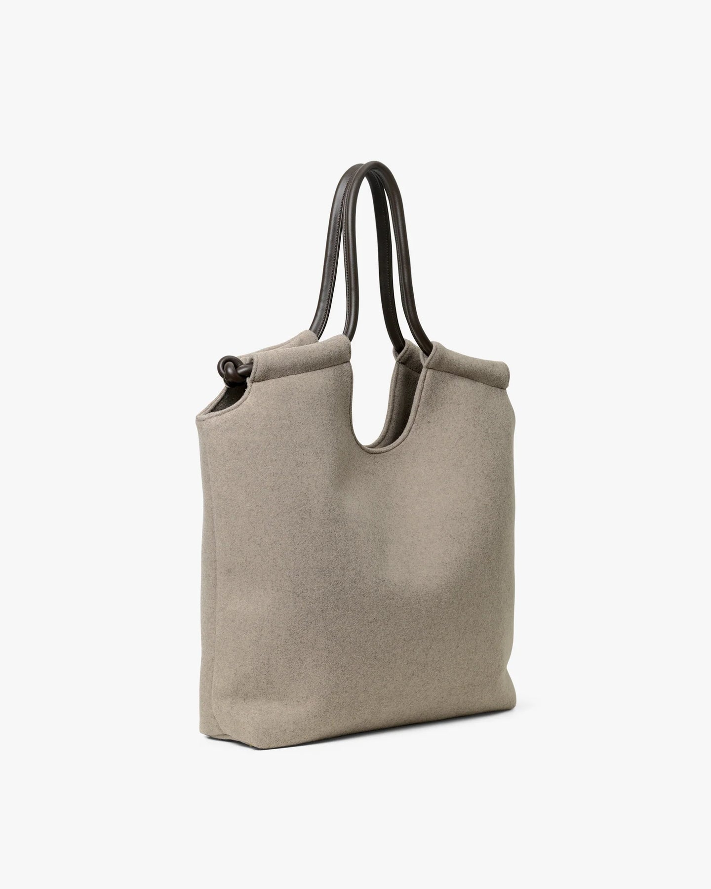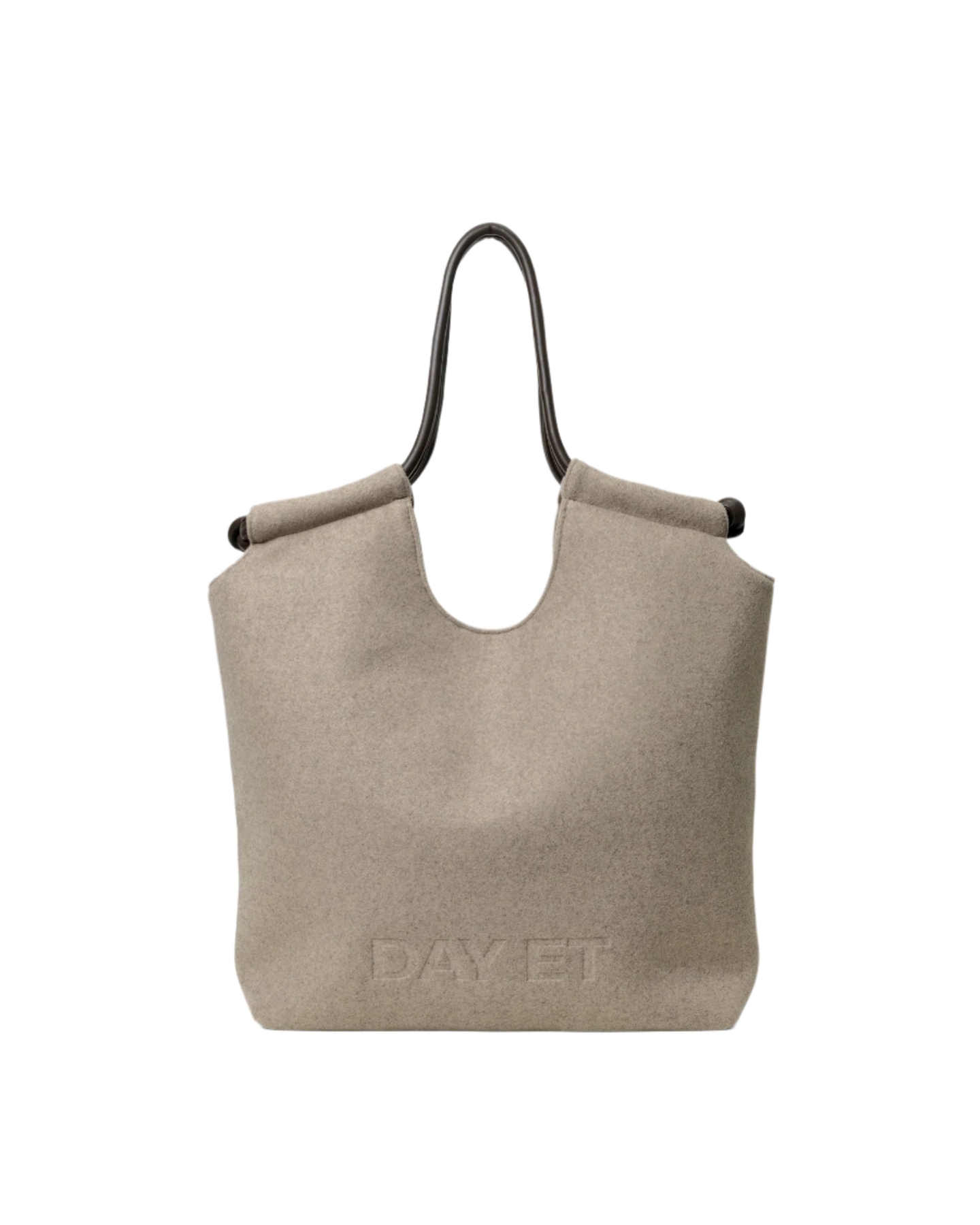 Day Woolen Tote fra DAY ET. Minimalistisk og myk shopper med dekorativ DAY ET-logo i front. Day Woolen Tote har avrundet åpning, håndtak i imitert skinn med knutedetaljer og polstrede detaljer som gir vesken en eksklusiv silhuett. Vesken rommer alt fra laptop og mapper til handlevarer eller weekend-essentials. Innsiden har én glidelåslomme og mørk fór i tekstil.