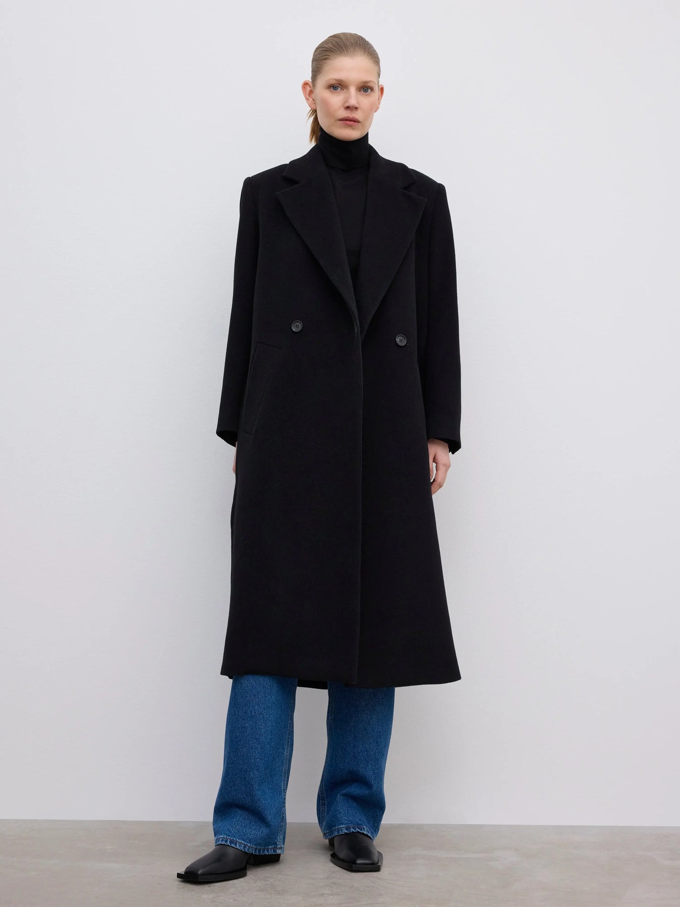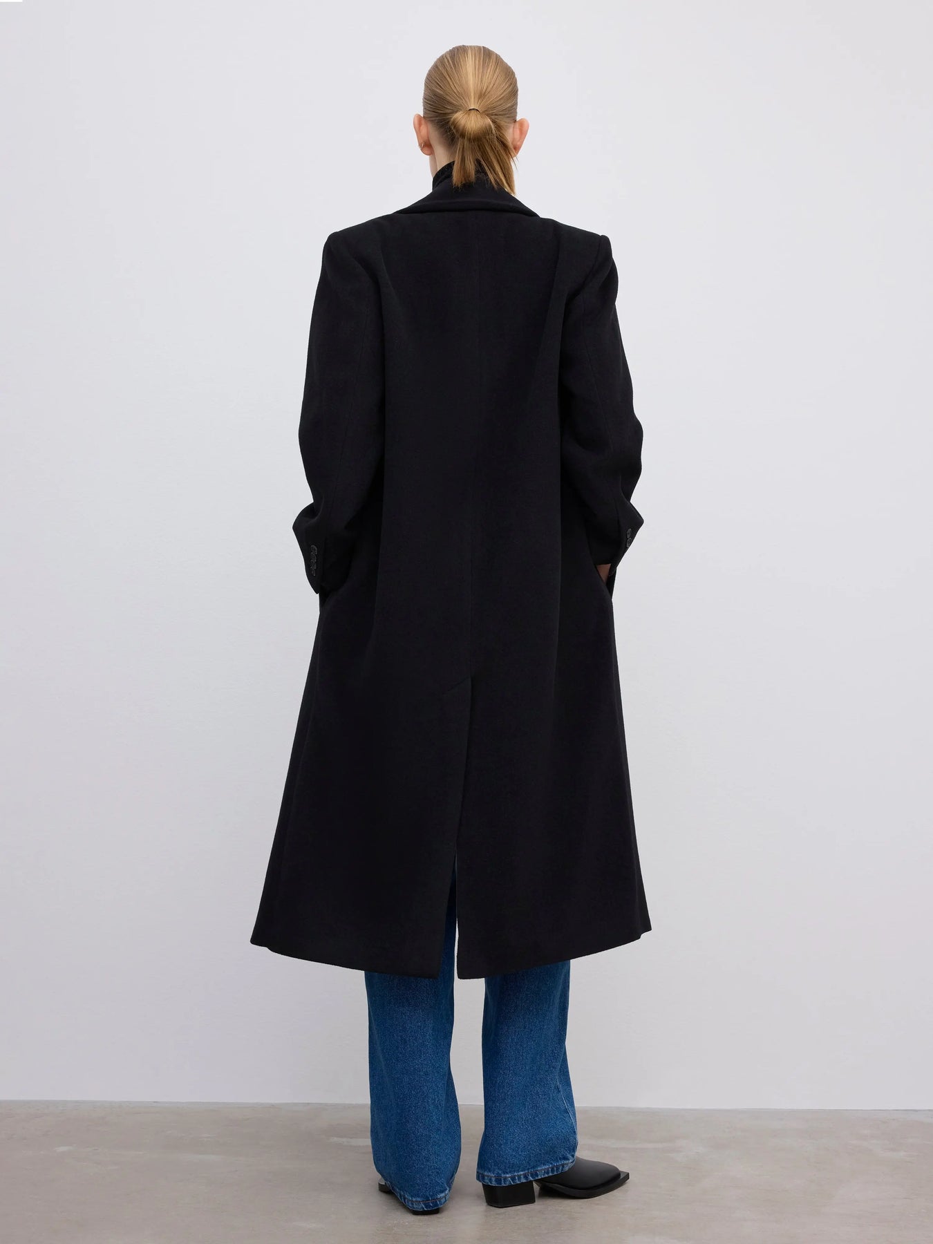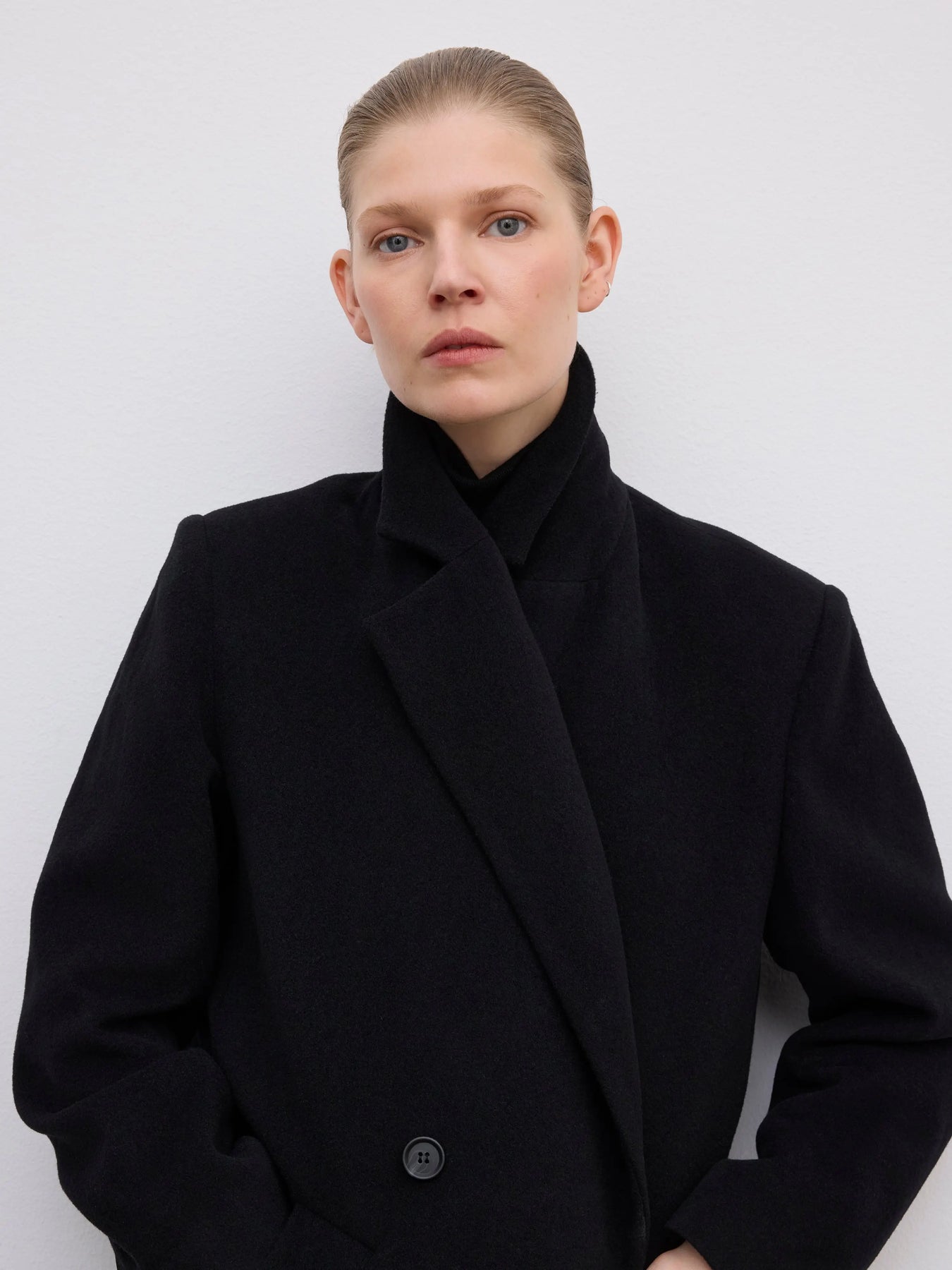 Db Wool Coat fra House of Dagmar. En klassisk ullfrakk med tidløs silhuett og minimalistiske detaljer. Db Wool Coat er dobbeltspent med markerte slag, rette ermer og praktiske sidelommer, perfekt til både hverdags og mer formelle anledninger. Den lange, rette fasongen gjør den enkel å style over alt fra jeans til kjoler, og den blir raskt en favoritt i garderoben gjennom hele sesongen.