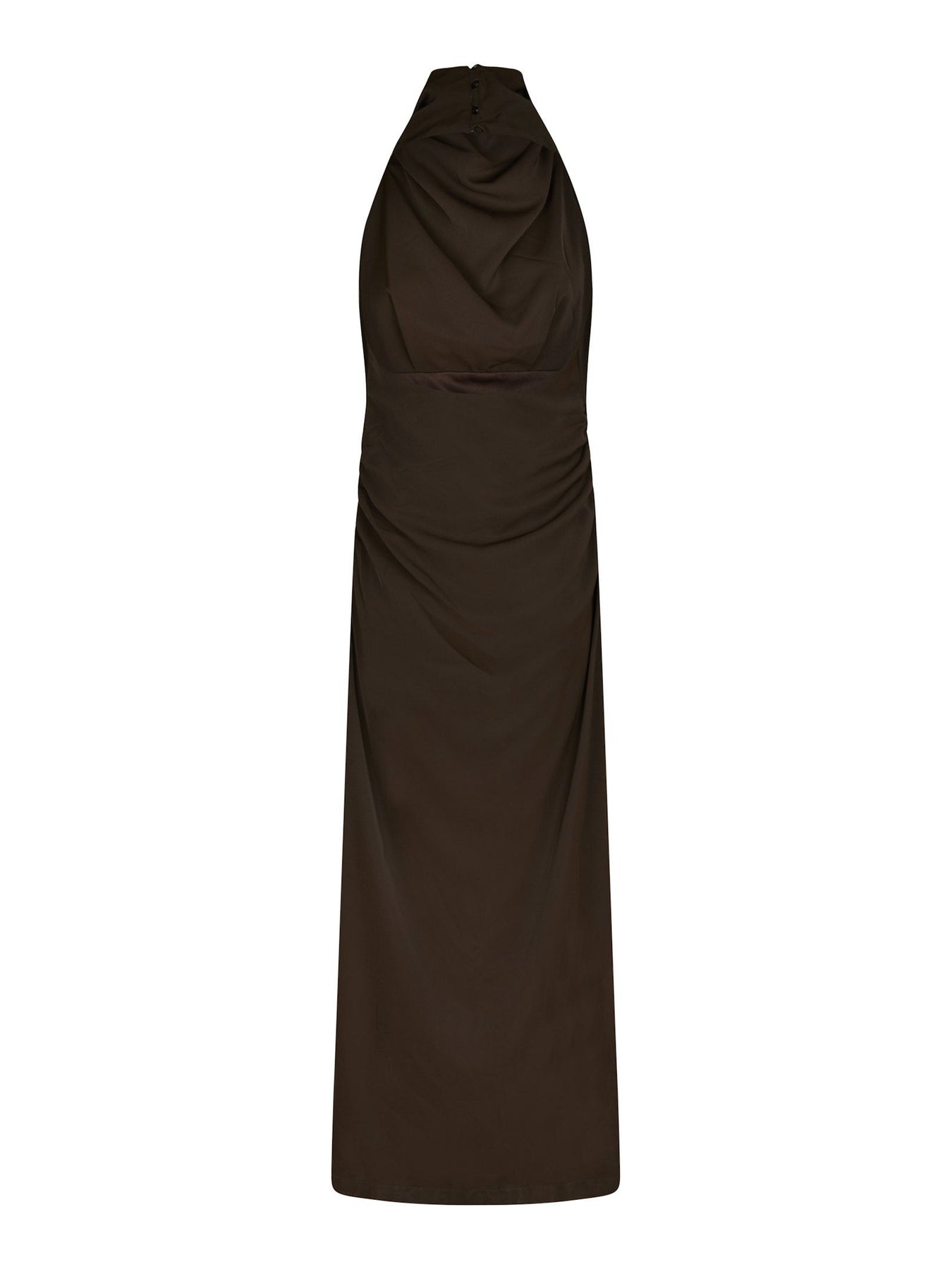 Dunie Dress fra Neo Noir. Dunie Dress er en elegant halterneck-kjole i en dyp sjokoladebrun tone. Modellen har en drapert utringning, åpen rygg og flatterende draperinger i midjen som gir et sofistikert uttrykk. Den lange silhuetten og det lette, flowy stoffet gjør den perfekt til festlige anledninger.