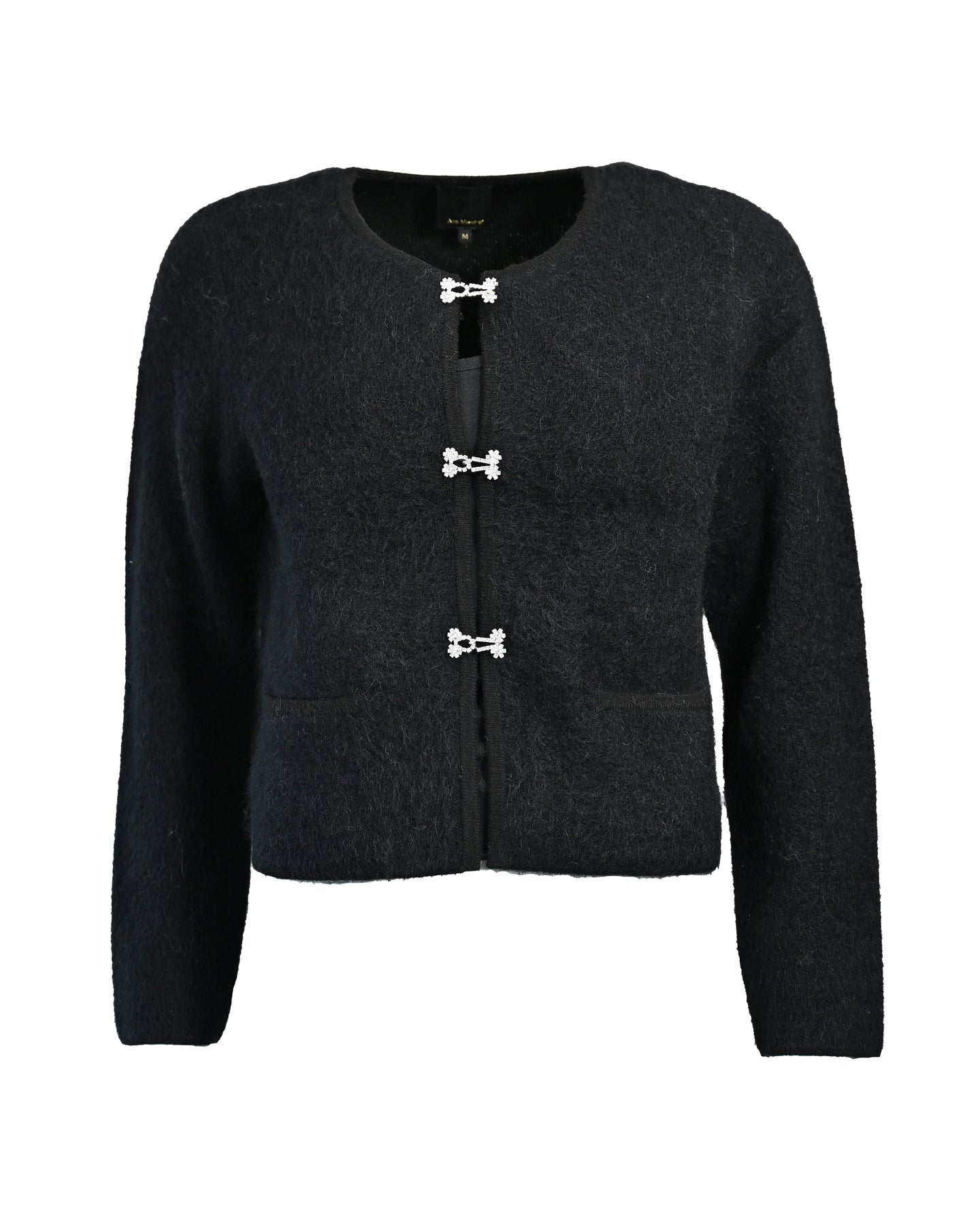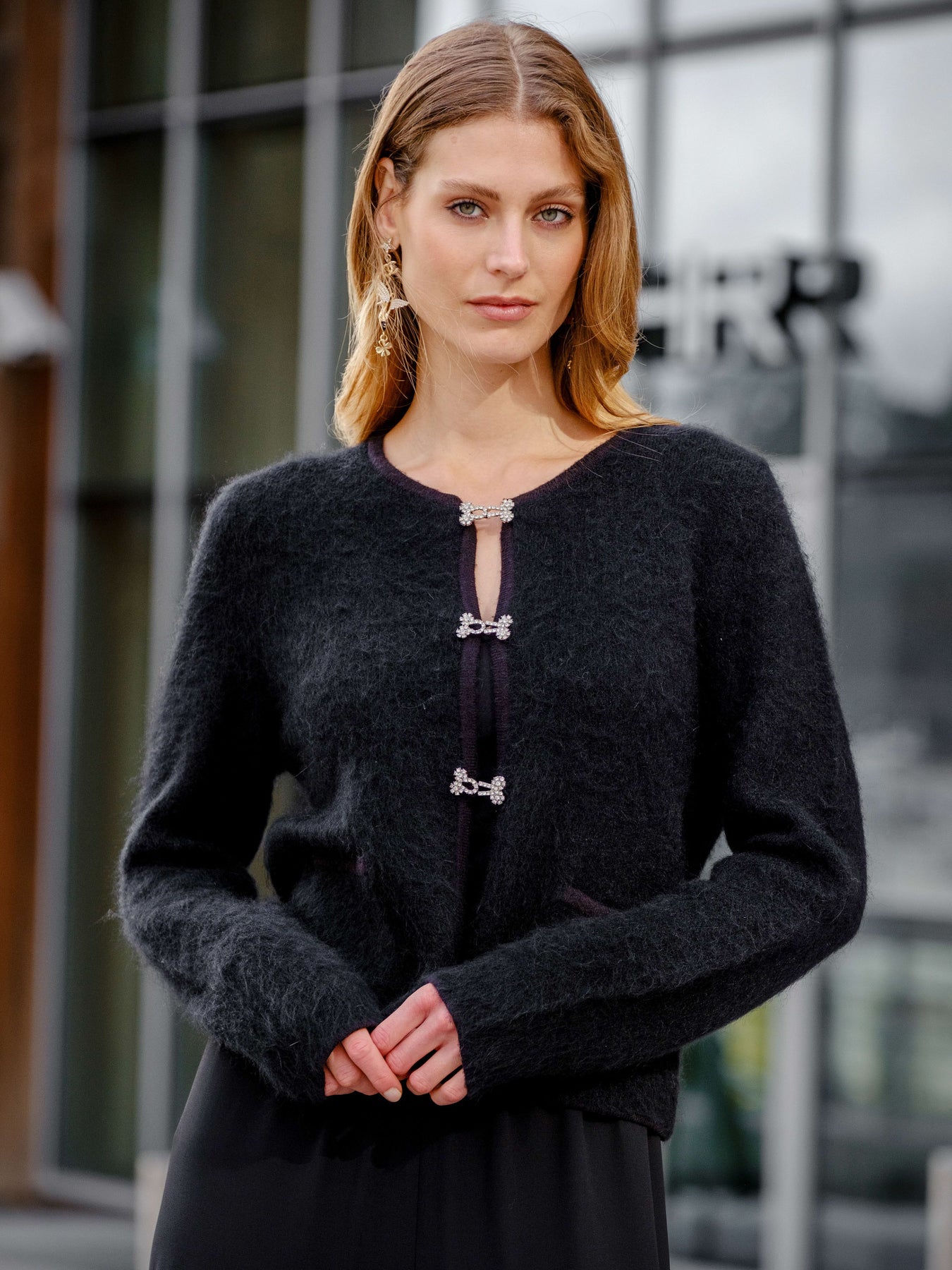 Edna Cardigan fra Ane Mone. Edna Cardigan fra Ane Mone kombinerer myk komfort med elegante detaljer. Jakken er laget i en børstet ullblanding som føles lun og eksklusiv, og har tre dekorative krystallspenner i front som gir et glamorøst preg. Den korte, rettskårne fasongen gjør den enkel å style både over kjoler og bluser.