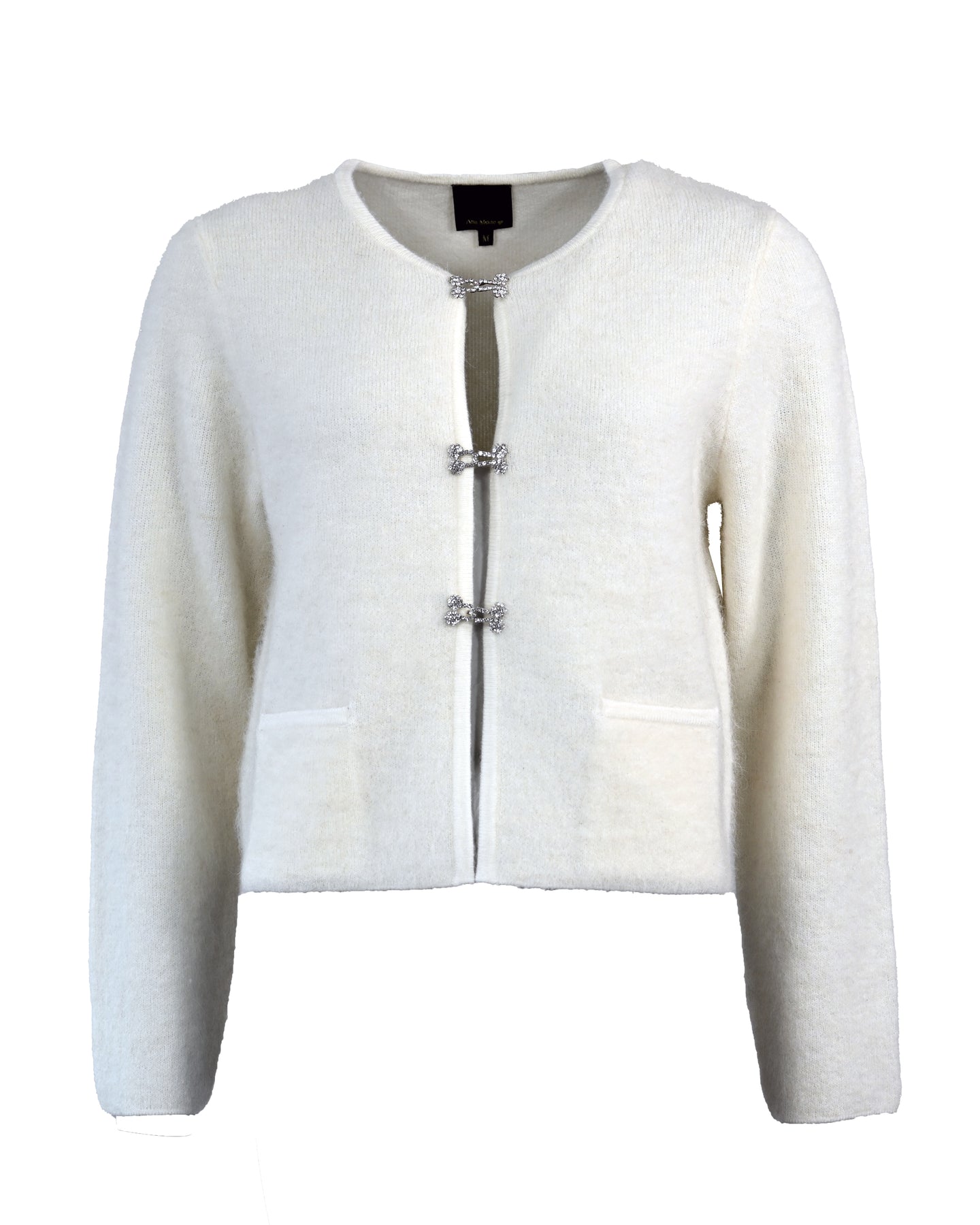 Edna Cardigan fra Ane Mone. Edna Cardigan fra Ane Mone kombinerer myk komfort med elegante detaljer. Jakken er laget i en børstet ullblanding som føles lun og eksklusiv, og har tre dekorative krystallspenner i front som gir et glamorøst preg. Den korte, rettskårne fasongen gjør den enkel å style både over kjoler og bluser.