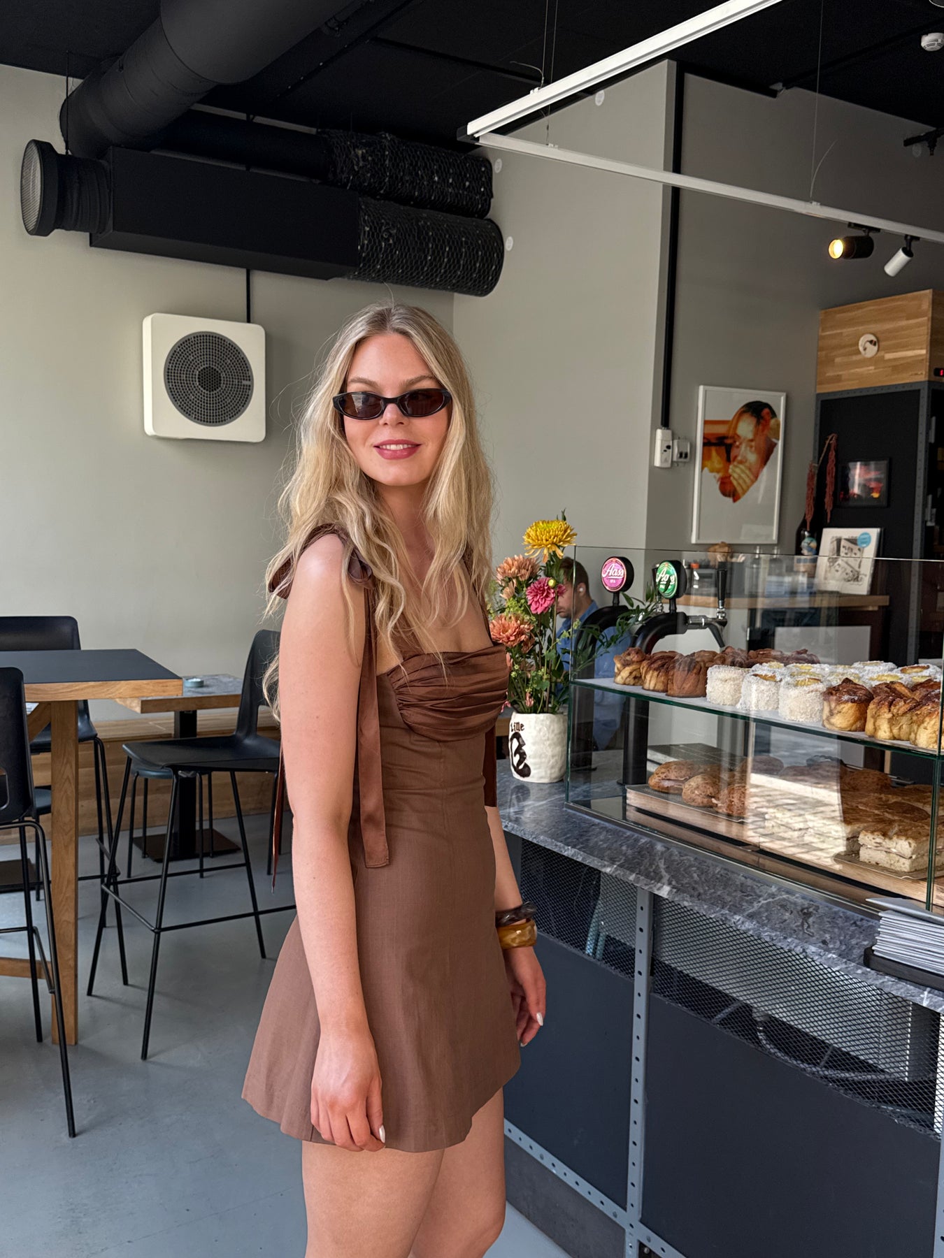 Ella Fitted Mini Dress fra Murlong Cres. Vi er stolte av å kunne tilby noe helt unikt på Villoid: Ella Fitted Mini Dress i nydelig brunfarge fra det norske merket Murlong Cres. Denne kjolen er ikke bare en visuell perle – den finnes kun hos oss, og skiller seg ut med sin dype, varme farge og elegante snitt.