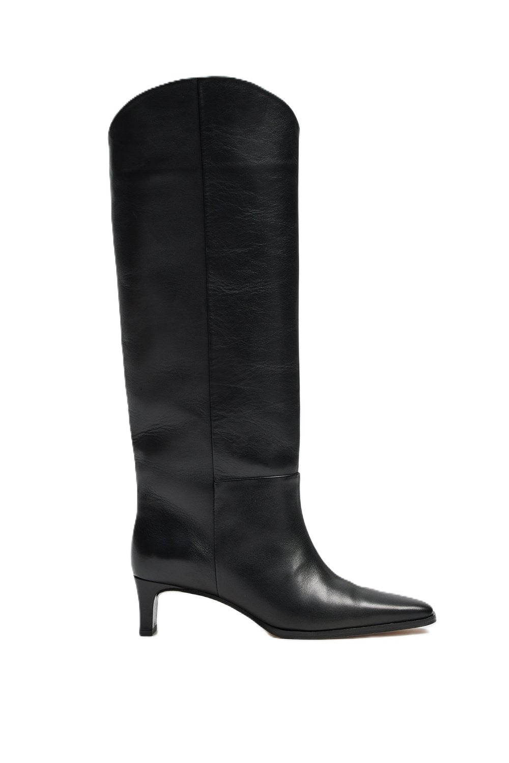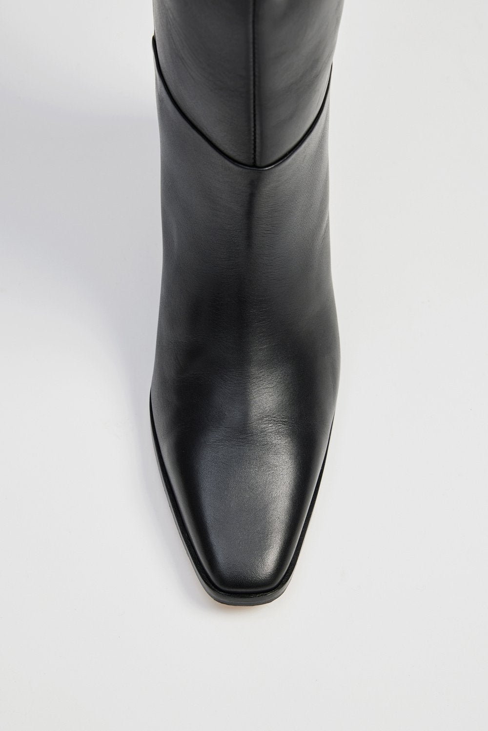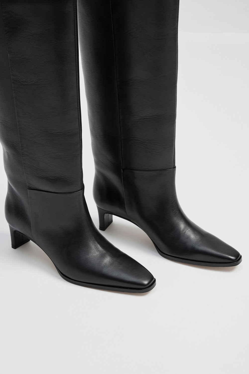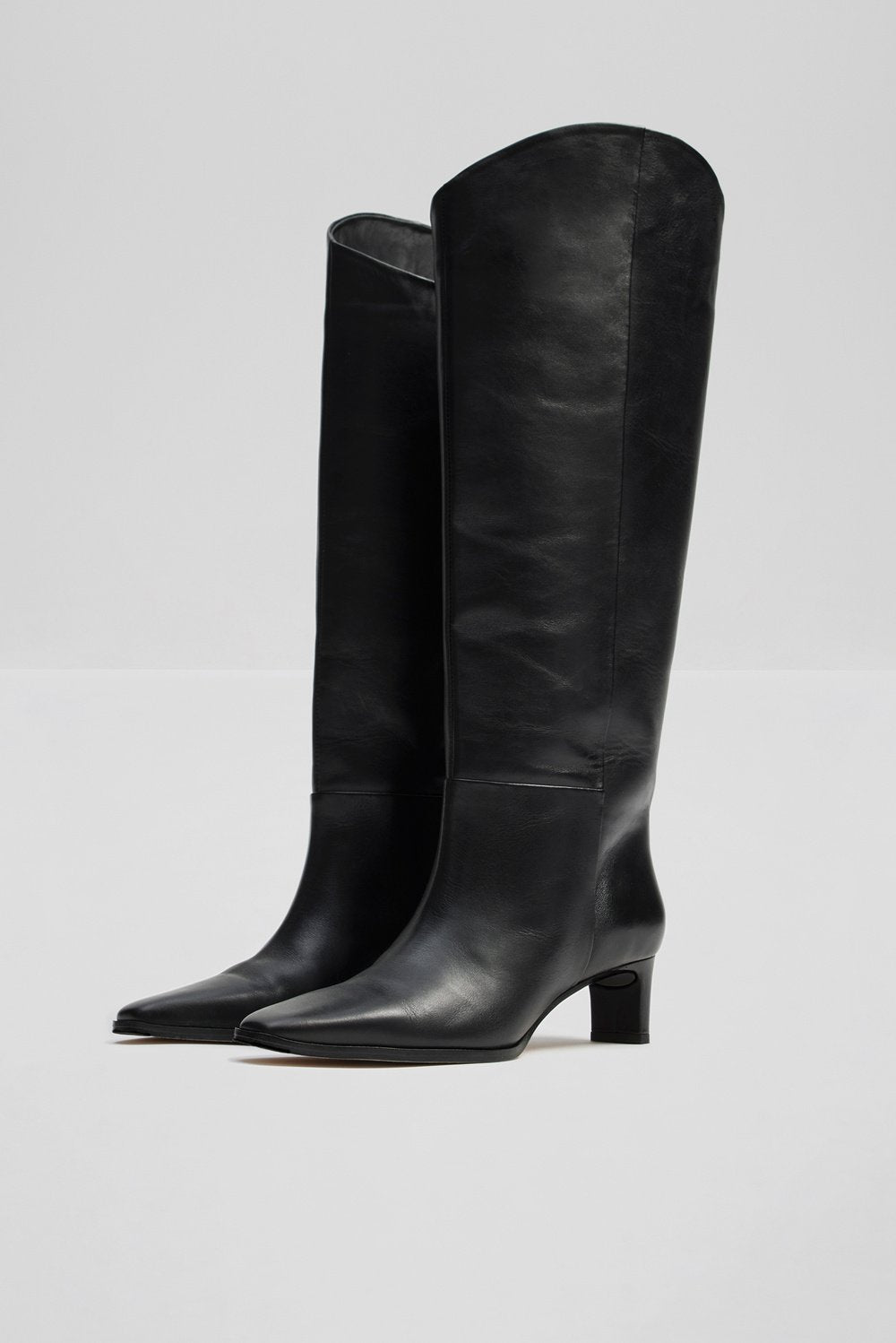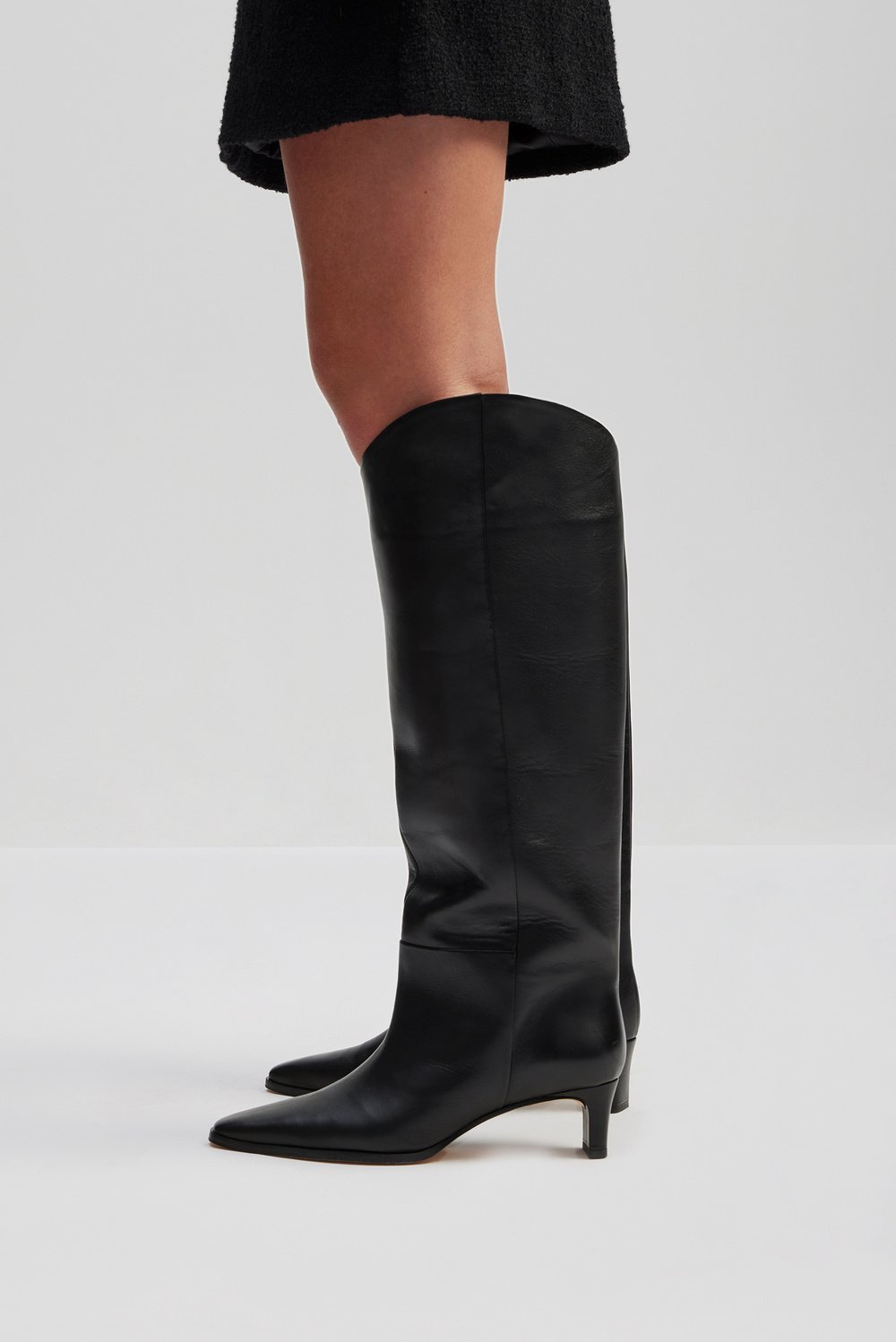 Esme High Knee Boots fra MALINA. Et par klassiske knehøye støvletter fra MALINA i glatt skinn. Esme High Knee Boots har et tidløst og klassisk design med spiss tå, liten hel og knehøyde. Støvlettene har vid passform over leggene og asymmetrisk avslutning. Hælhøyde: 5 cm.