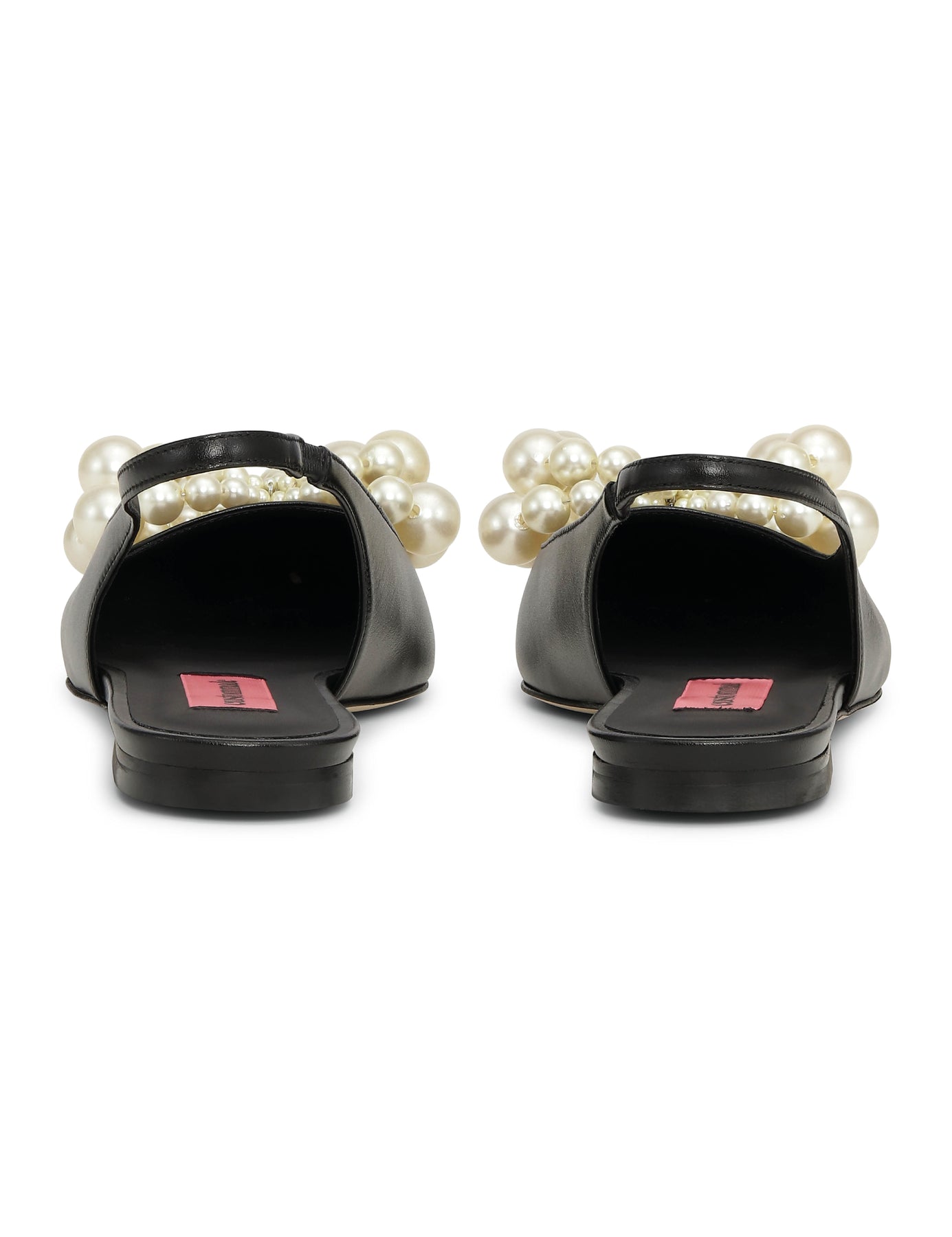 Fiona Pearl fra Custommade. Dette er en sofistikert og elegant flat sandal som umiddelbart fanger oppmerksomheten. Skoen er laget i glatt, sort skinn og har en elegant spiss tå og en feminin slingback-stropp som sikrer en behagelig passform.