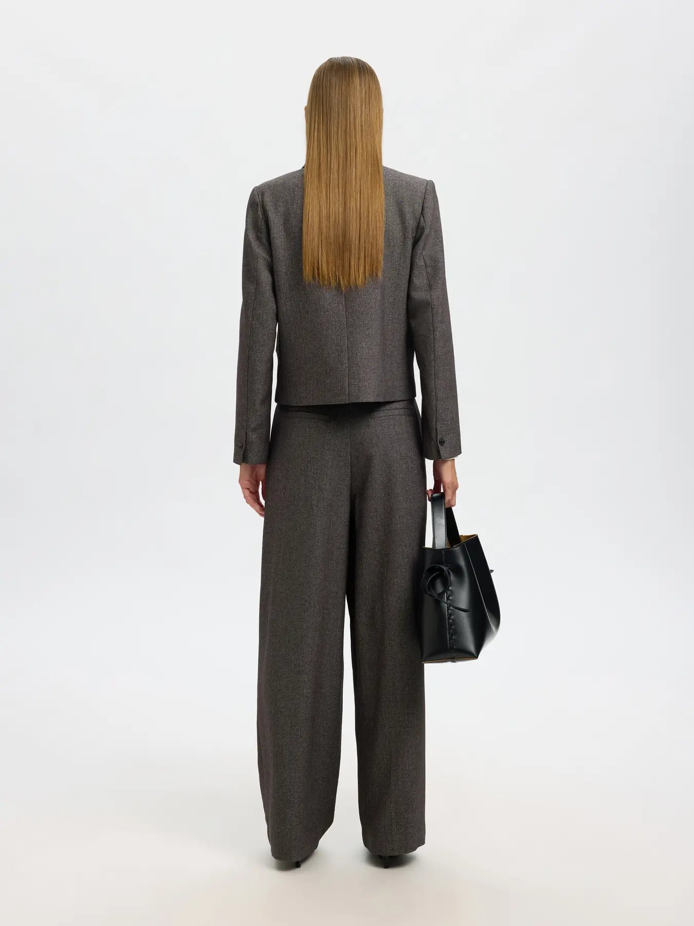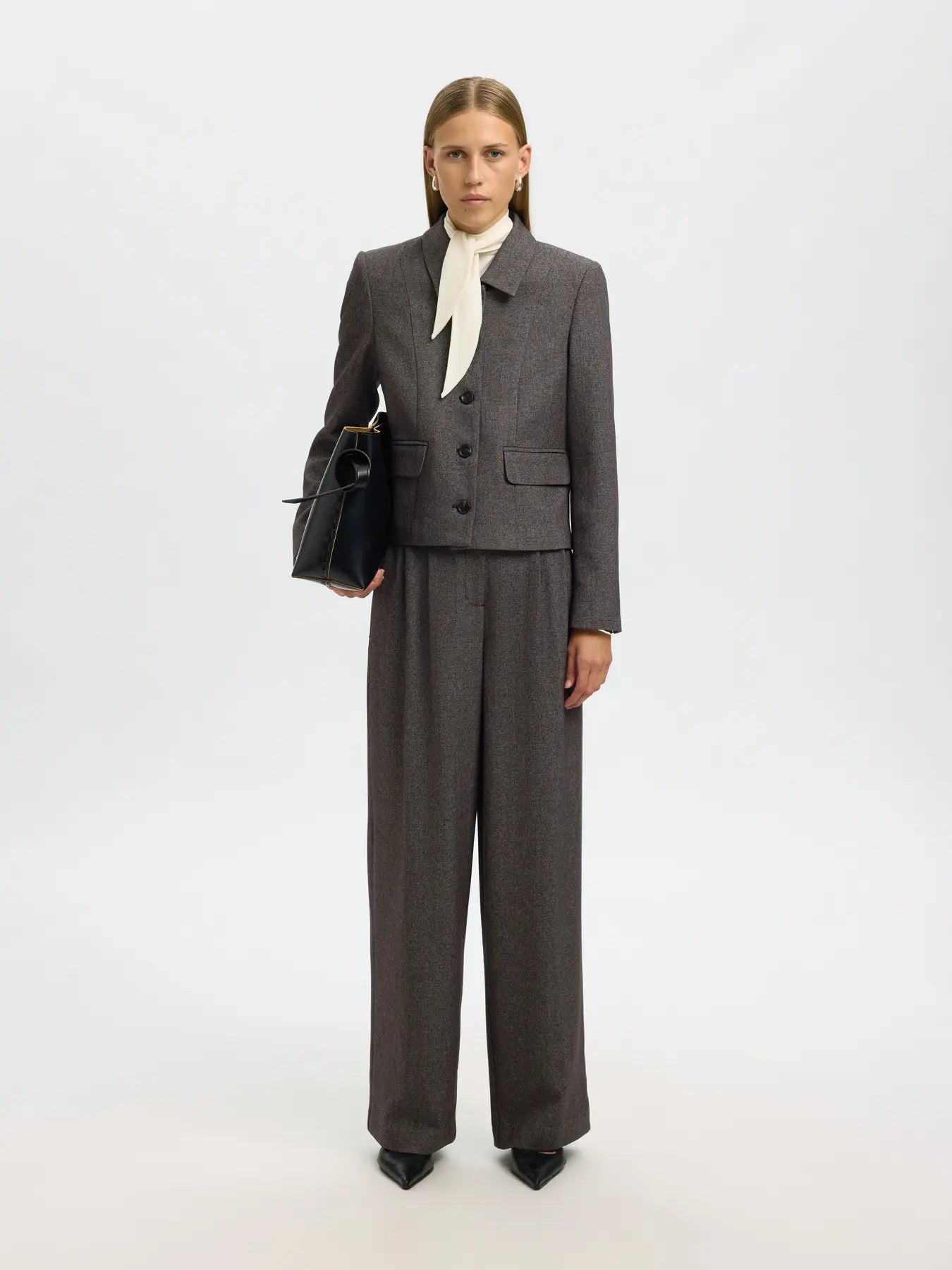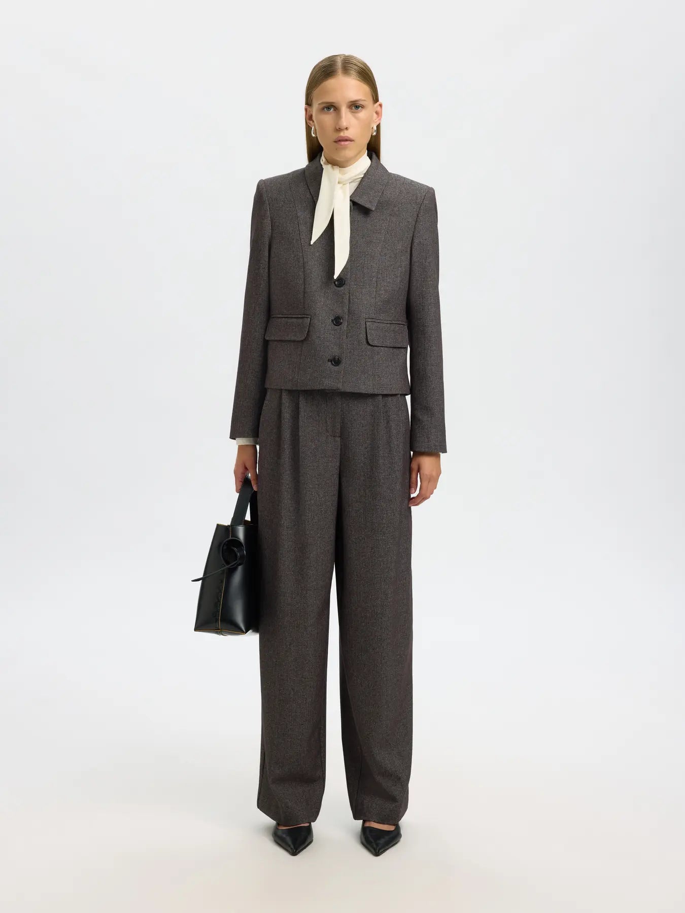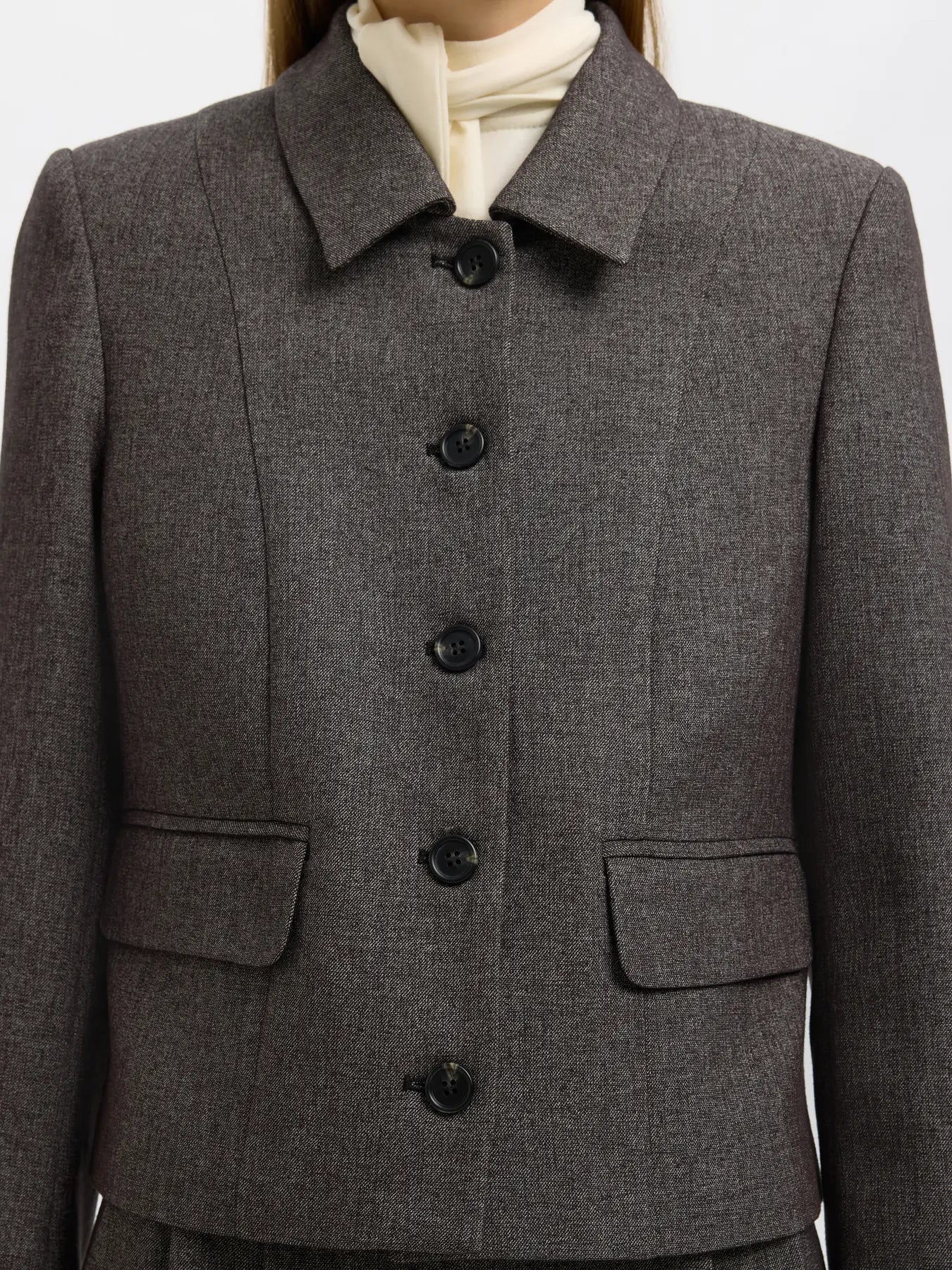 Fitted Camilla Short Blazer fra Selected Femme. Fitted Camilla Short Blazer fra Selected Femme. En klassisk og strukturert blazer med kort fasong og skreddersydd passform. Jakken har spiss krage, rette skuldre og knappelukking i front som gir et rent og elegant uttrykk. Fitted Camilla Short Blazer er laget i et mykt, vevd materiale som holder formen og gir en flatterende silhuett med et moderne preg.