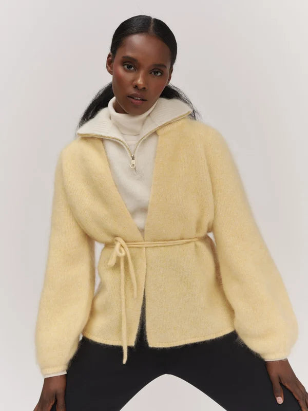 Fredrikke Chunky Cardigan fra Ella & il. Drømmecardiganen fra Ella & il er endelig her! Fredrikke Chunky Cardigan har lange ballongermer og rund hals med feminin V-utringning. Cardiganen har omslagseffekt og knytebelte i livet, som gir en feminin og flatterende passform. Cardiganen er en allsidig og feminin cardigan strikket i en varm mohair-mix.