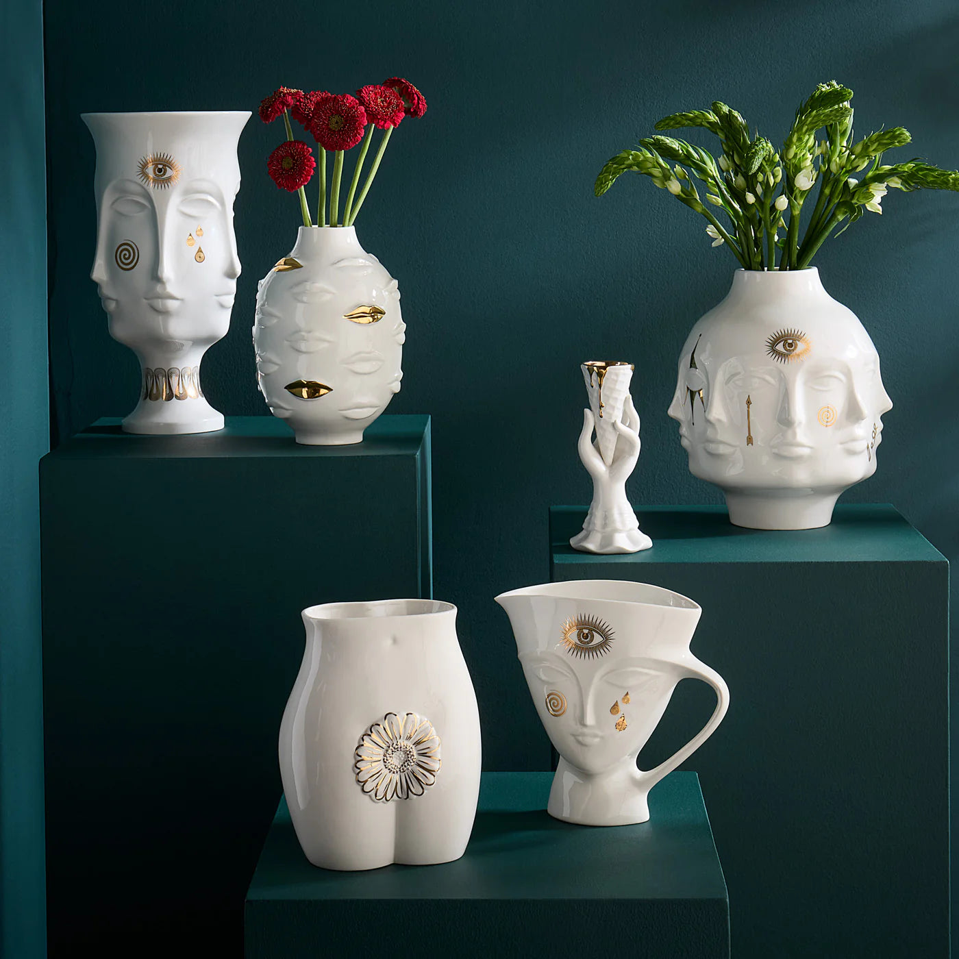 Jonathan og teamet hans skulpturerer modellene til Muse-keramikken, og erstatter deretter de signaturgeometriske relieffmønstrene med kroppsdeler – ansikter, bryster, lepper – for å skape en surrealistisk stil. Inspirert av Jonathan Adlers favorittkunstneres muser.