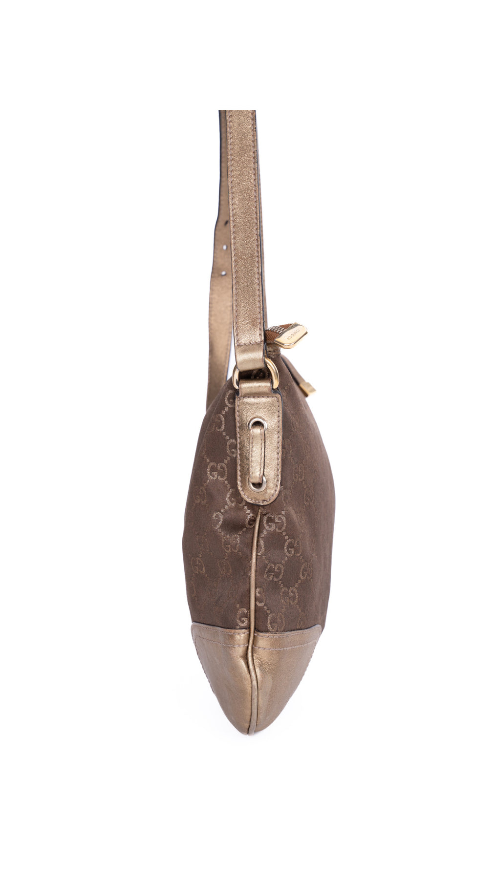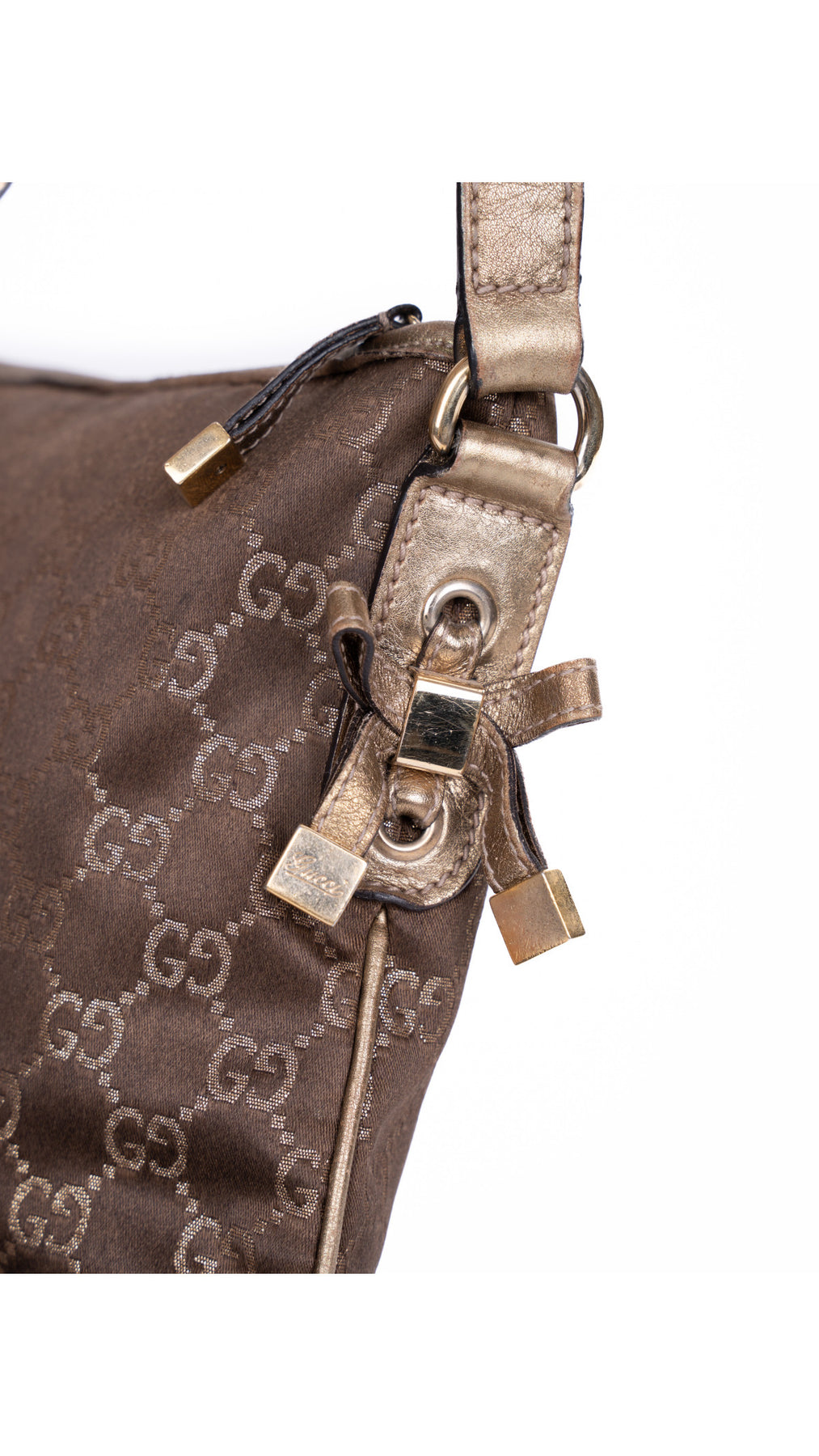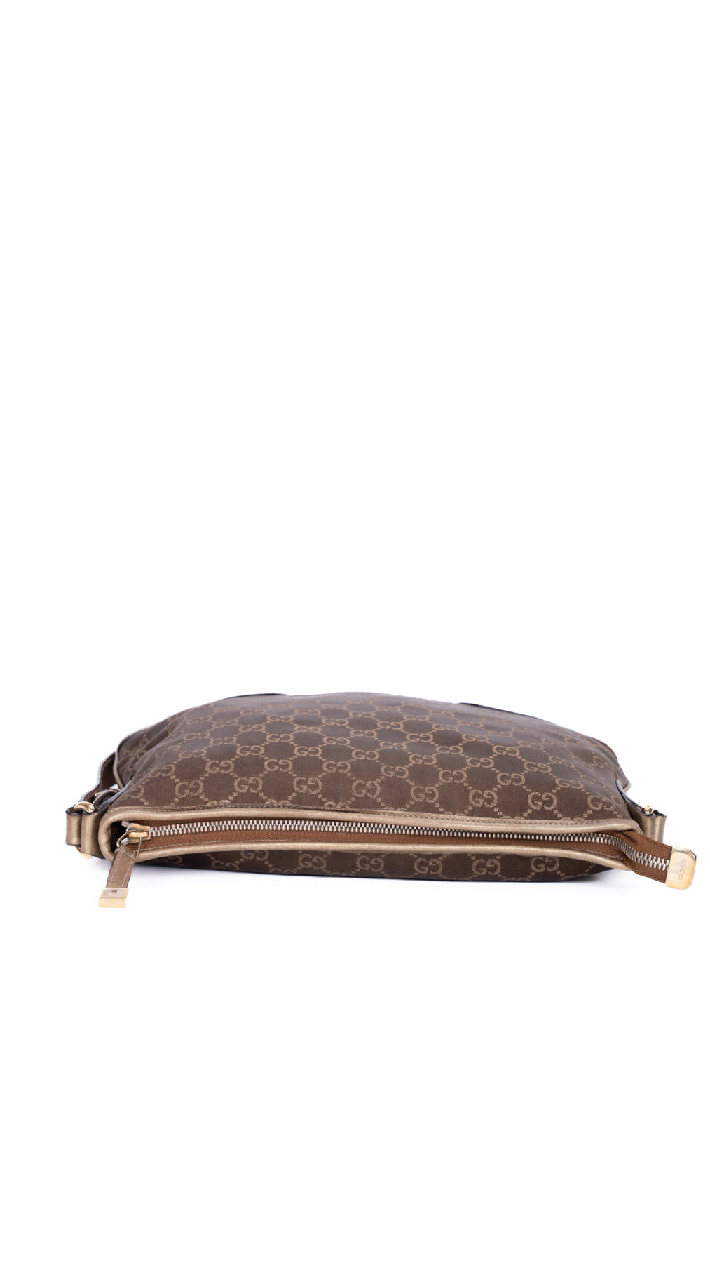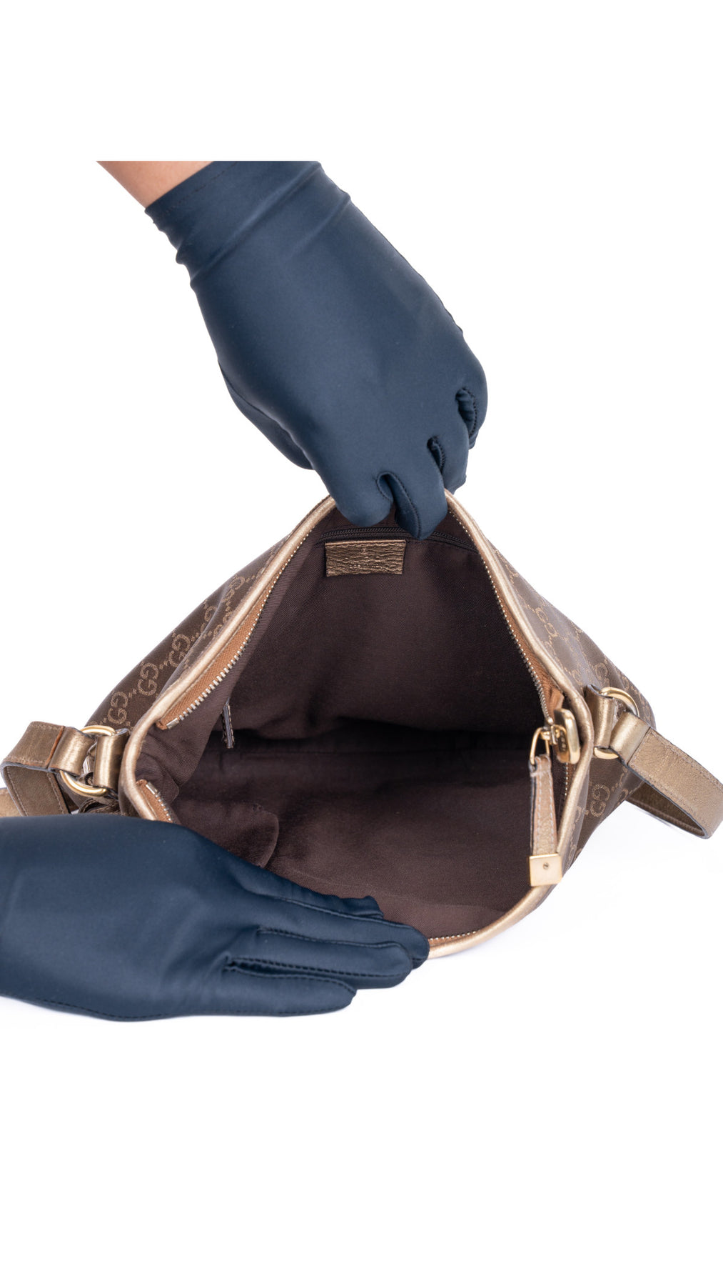 Gucci GG Shoulder Bag. Denne stilfulle Gucci-skuldervesken er laget i klassisk brun GG-monogramcanvas med skinnende gullfargede skinndetaljer som gir et elegant og moderne uttrykk. Den justerbare skulderremmen gjør vesken komfortabel både som skulderveske og crossbody. Med sin slanke, sporty og feminine silhuett samt praktisk glidelåslukking, er dette en perfekt hverdagsveske med god plass uten å bli tung.