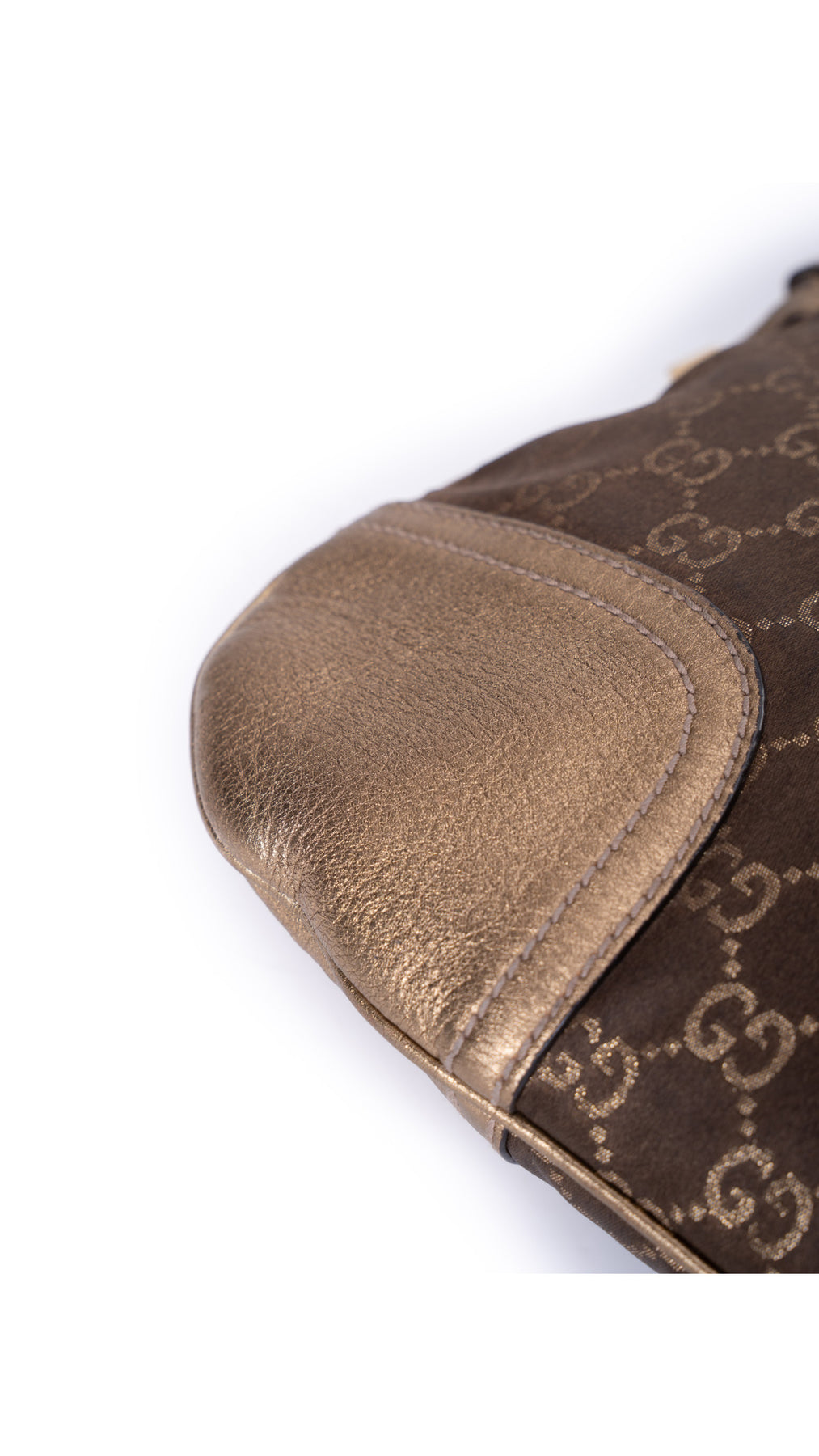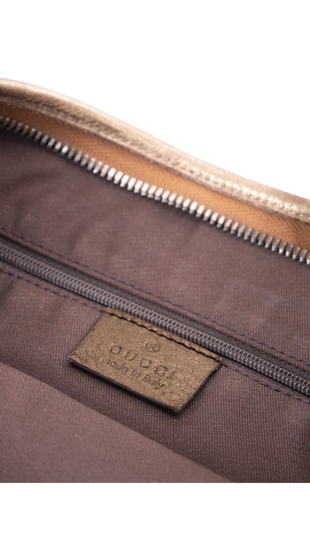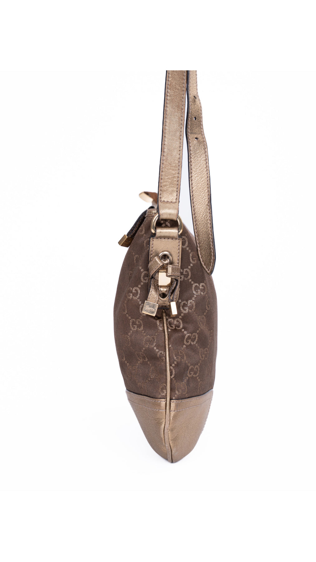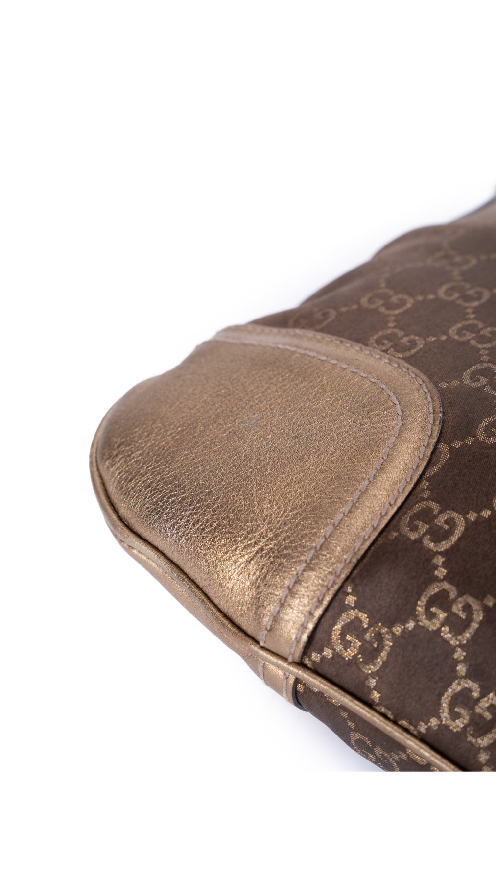 Gucci GG Shoulder Bag. Denne stilfulle Gucci-skuldervesken er laget i klassisk brun GG-monogramcanvas med skinnende gullfargede skinndetaljer som gir et elegant og moderne uttrykk. Den justerbare skulderremmen gjør vesken komfortabel både som skulderveske og crossbody. Med sin slanke, sporty og feminine silhuett samt praktisk glidelåslukking, er dette en perfekt hverdagsveske med god plass uten å bli tung.