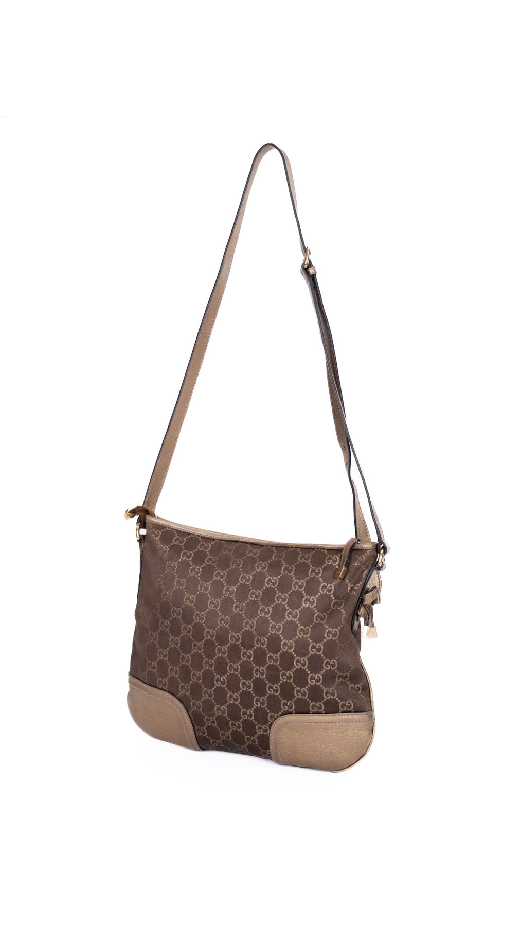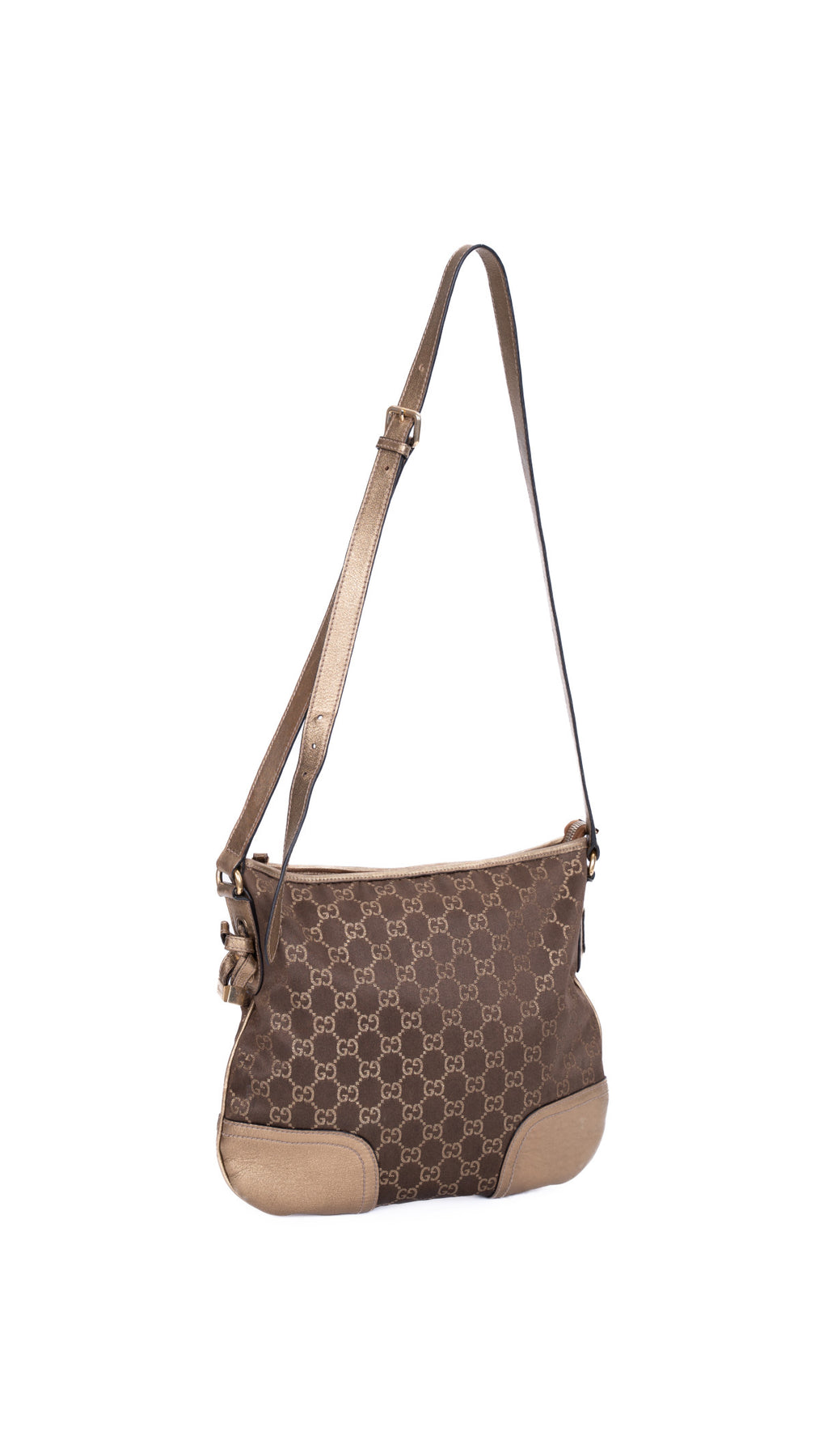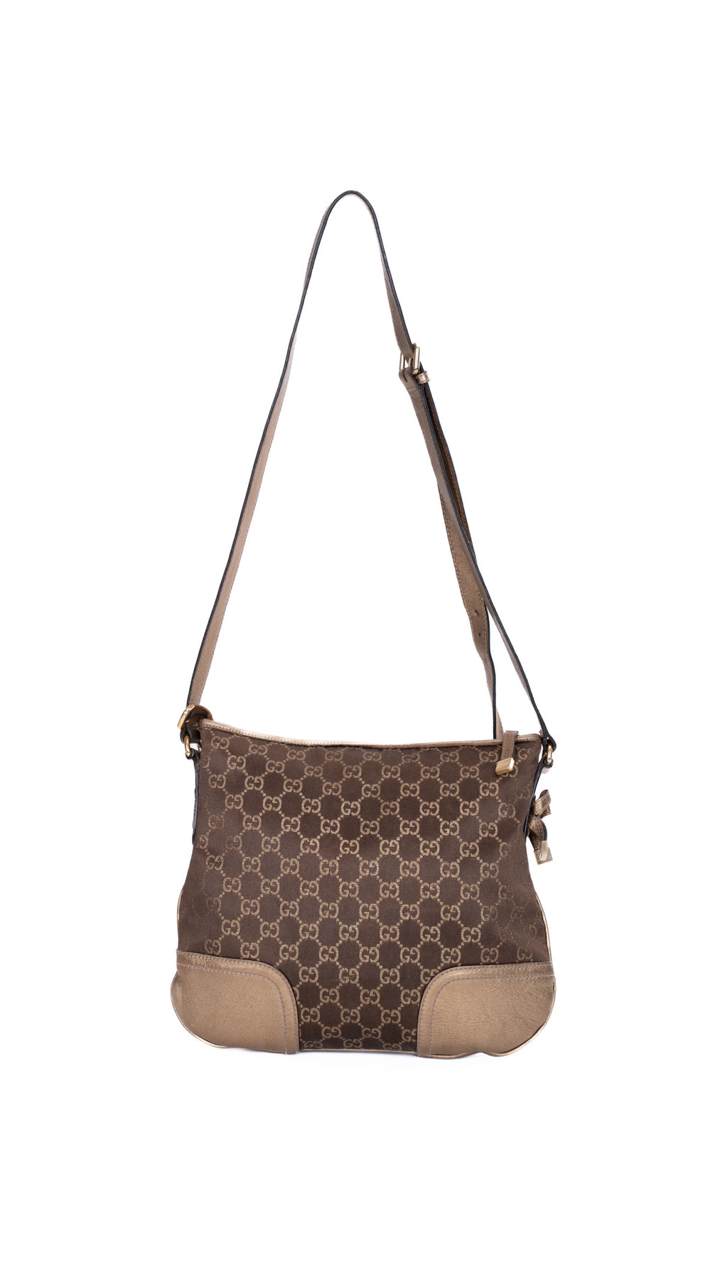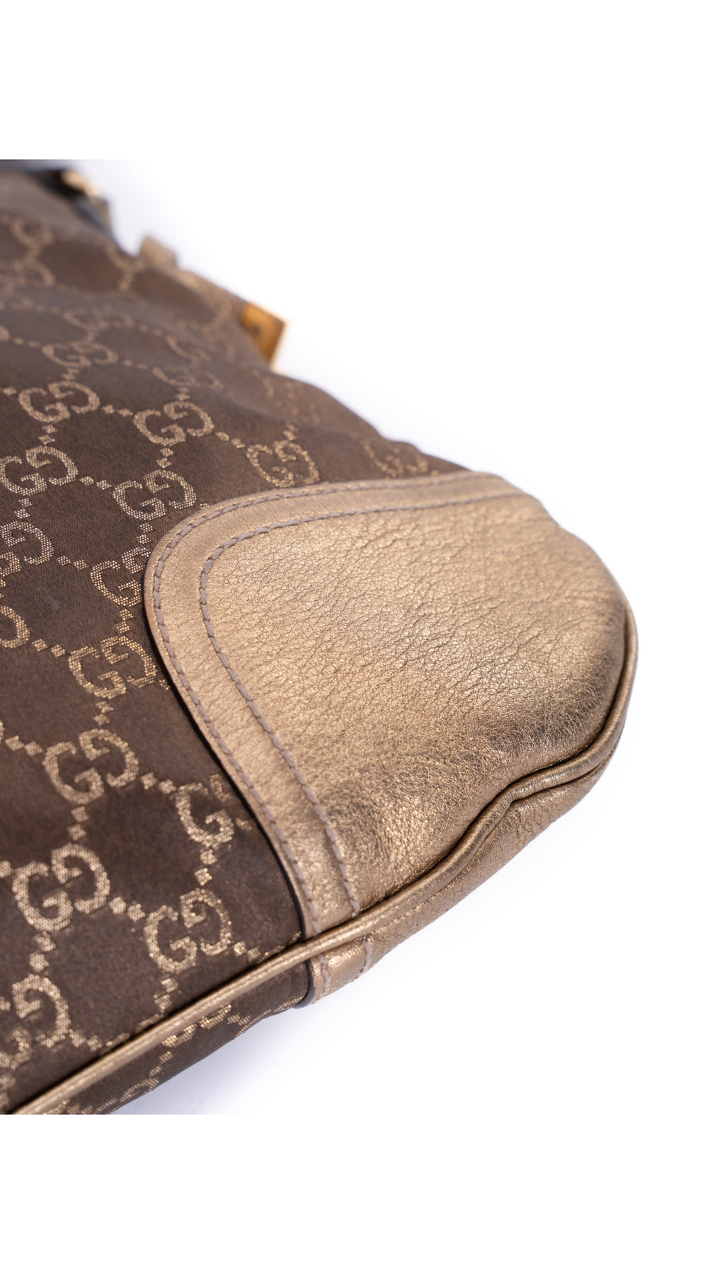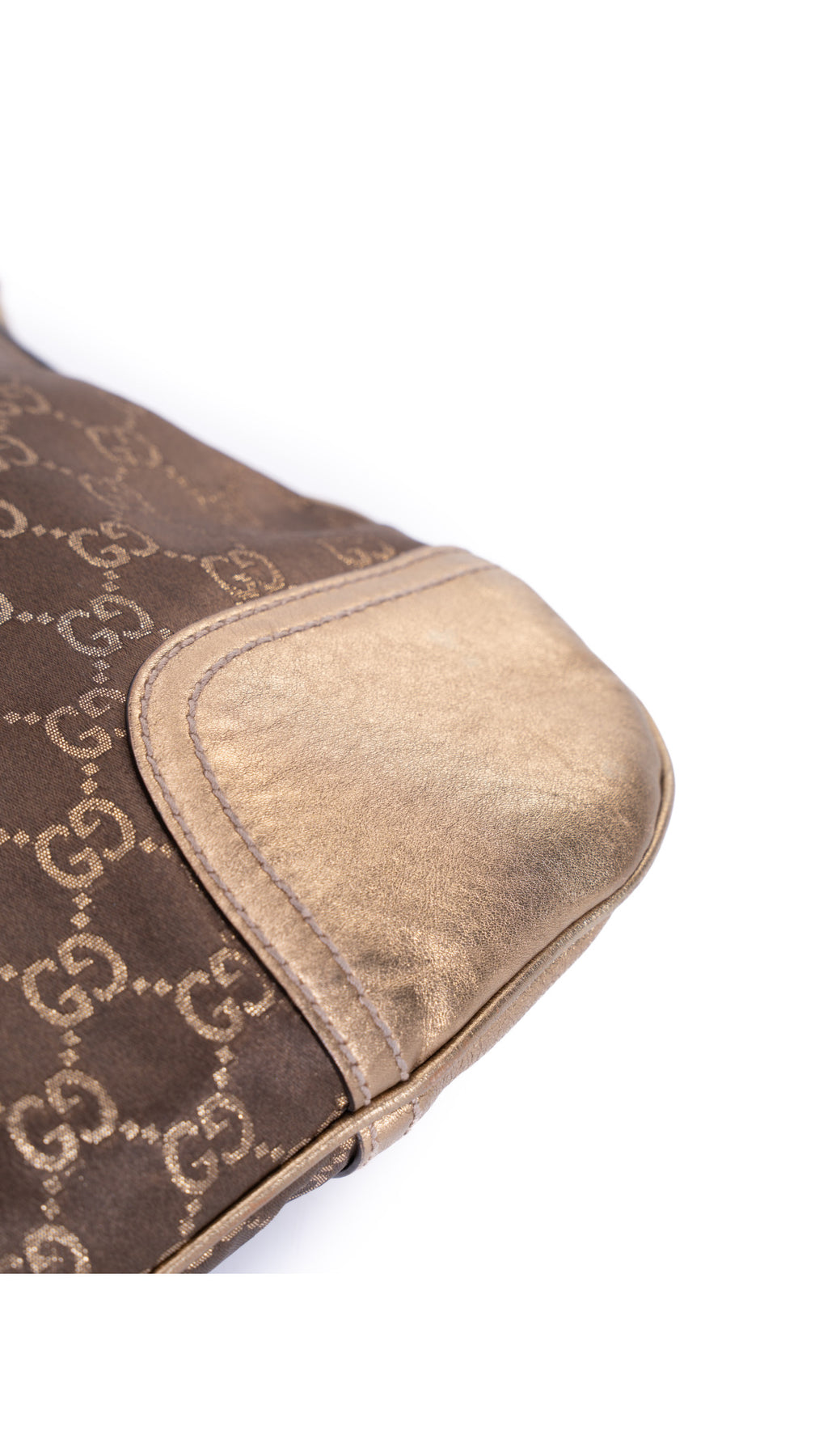 Gucci GG Shoulder Bag. Denne stilfulle Gucci-skuldervesken er laget i klassisk brun GG-monogramcanvas med skinnende gullfargede skinndetaljer som gir et elegant og moderne uttrykk. Den justerbare skulderremmen gjør vesken komfortabel både som skulderveske og crossbody. Med sin slanke, sporty og feminine silhuett samt praktisk glidelåslukking, er dette en perfekt hverdagsveske med god plass uten å bli tung.