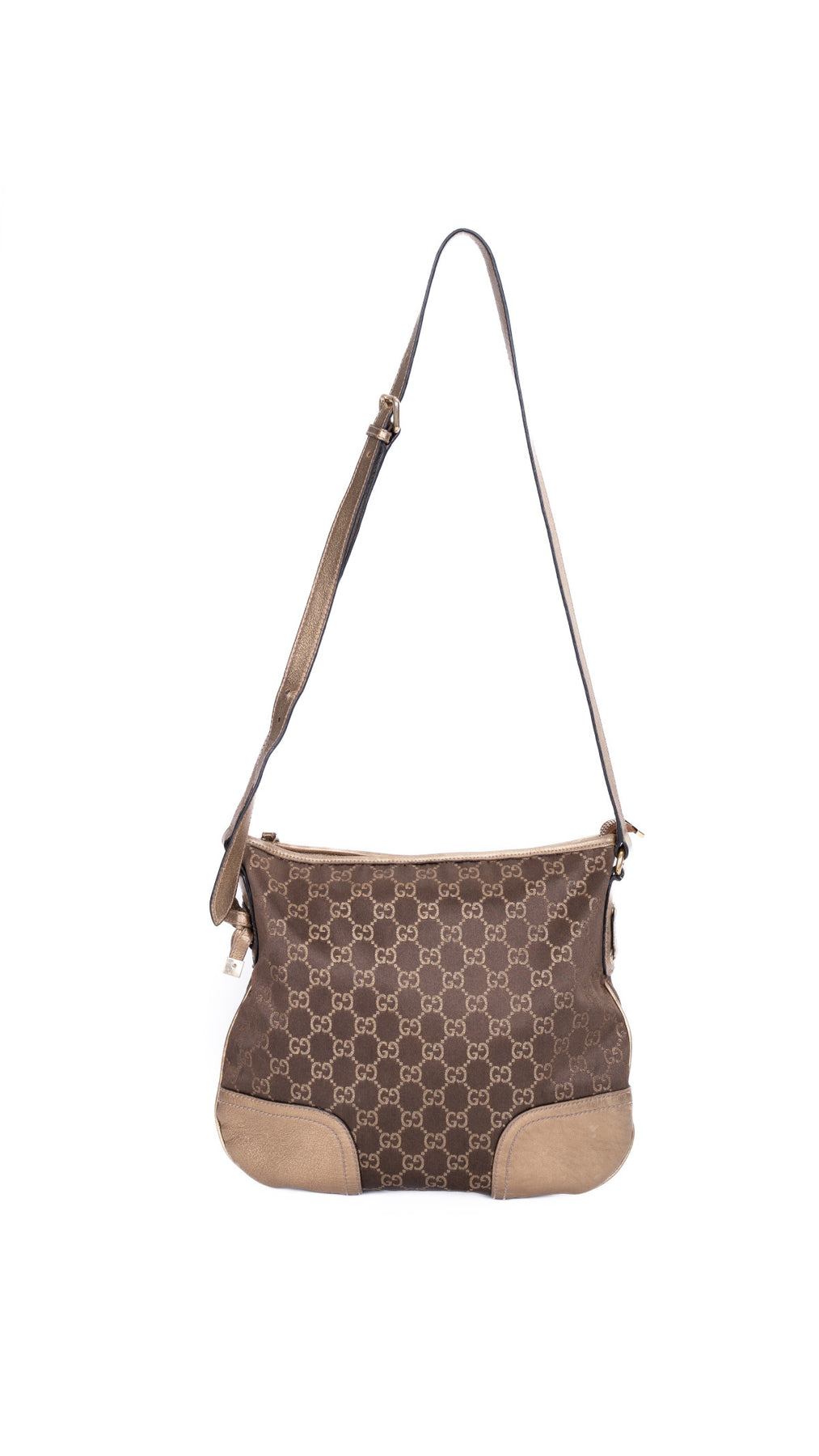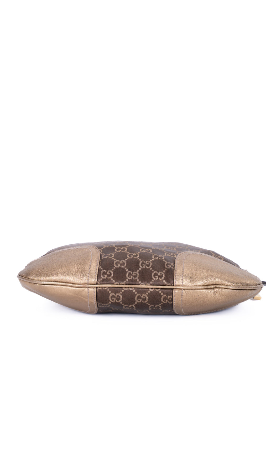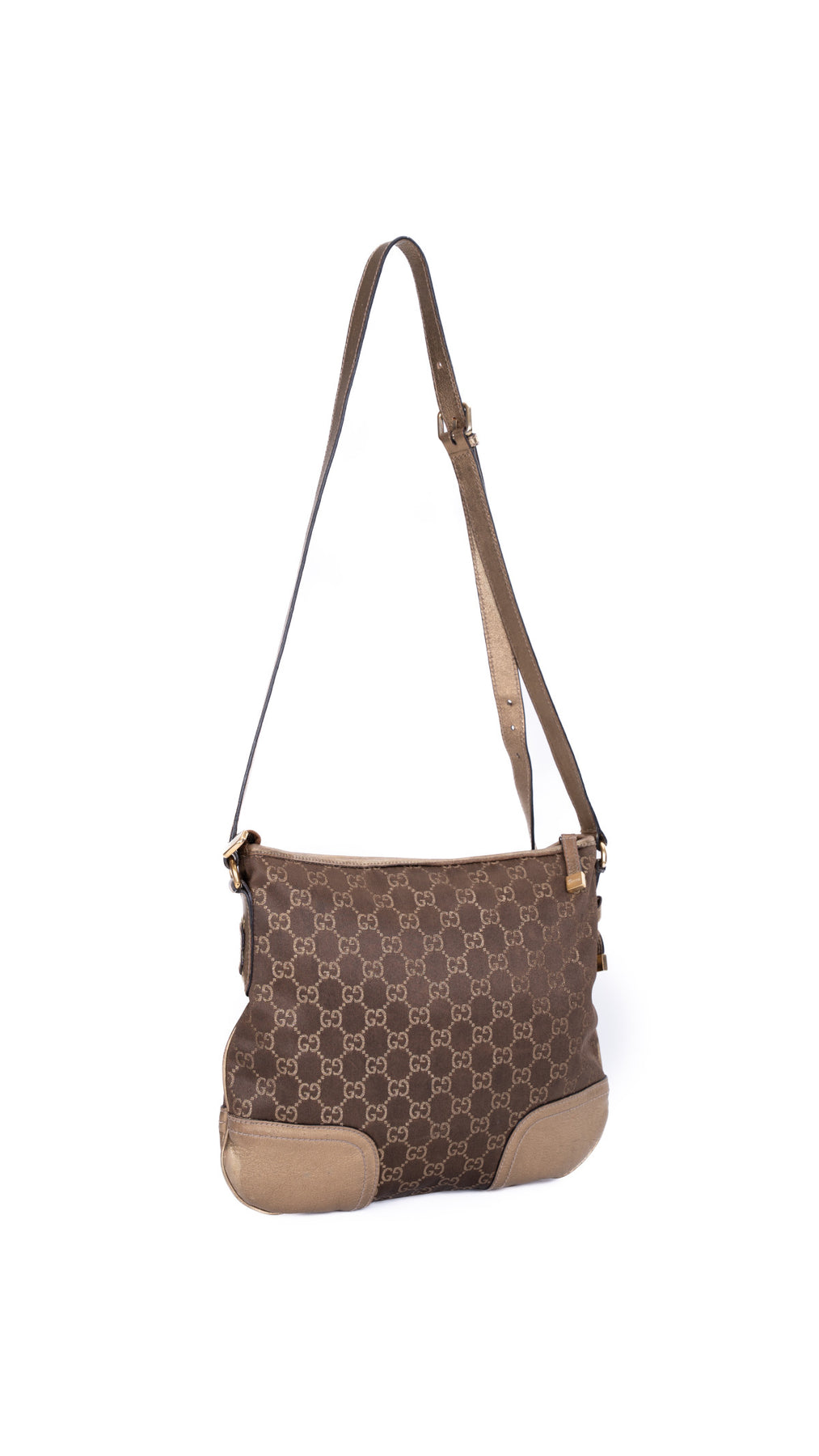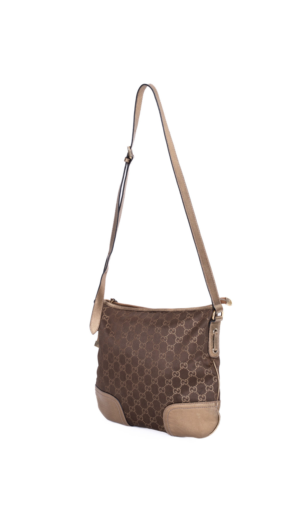 Gucci GG Shoulder Bag. Denne stilfulle Gucci-skuldervesken er laget i klassisk brun GG-monogramcanvas med skinnende gullfargede skinndetaljer som gir et elegant og moderne uttrykk. Den justerbare skulderremmen gjør vesken komfortabel både som skulderveske og crossbody. Med sin slanke, sporty og feminine silhuett samt praktisk glidelåslukking, er dette en perfekt hverdagsveske med god plass uten å bli tung.
