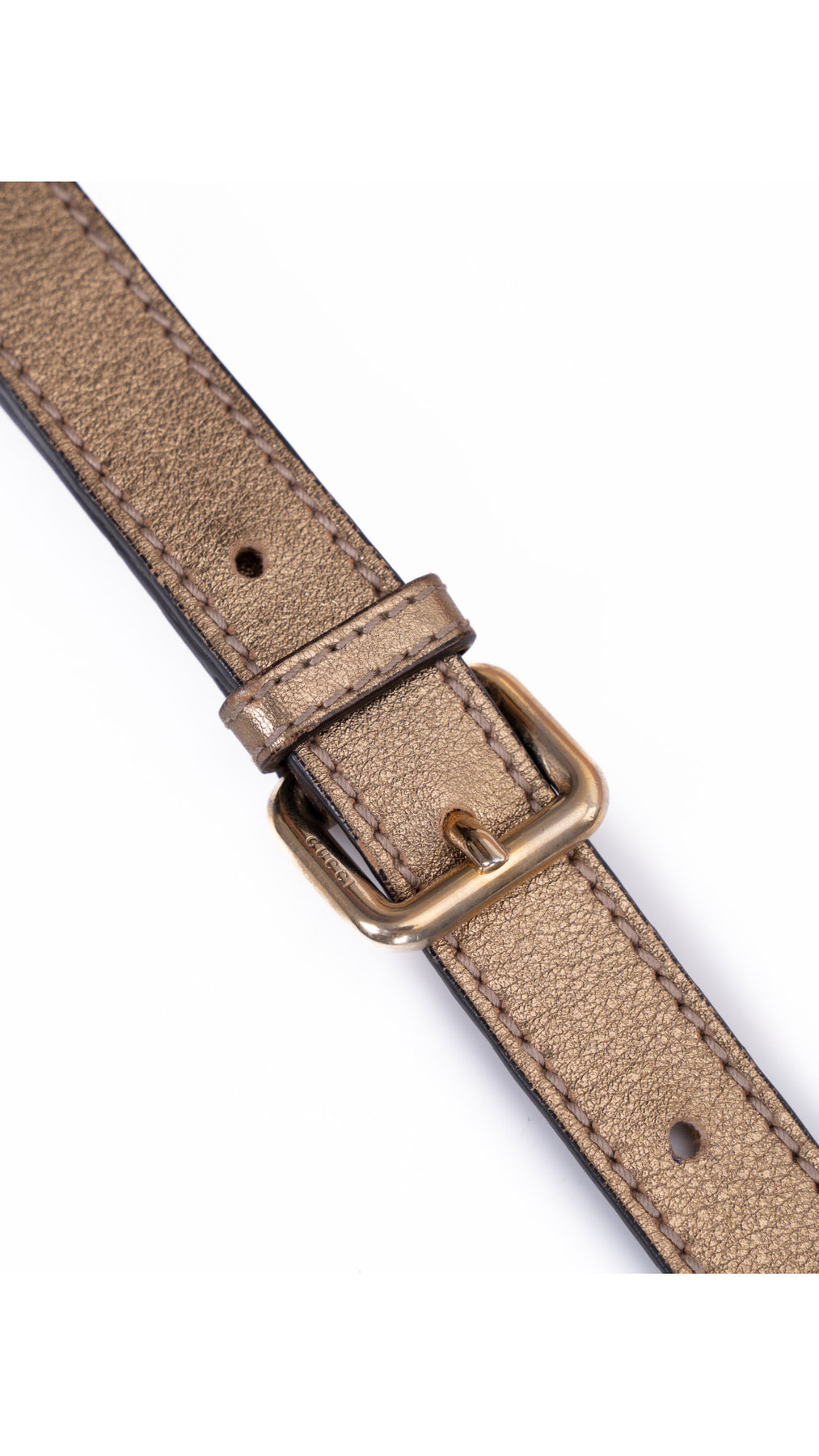 Farge: Brun med gullfargede detaljer og sølvfarget hardware
