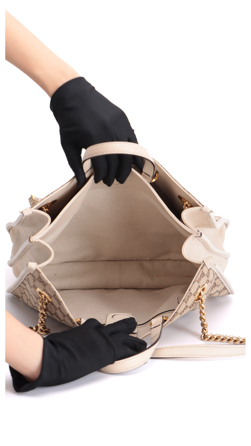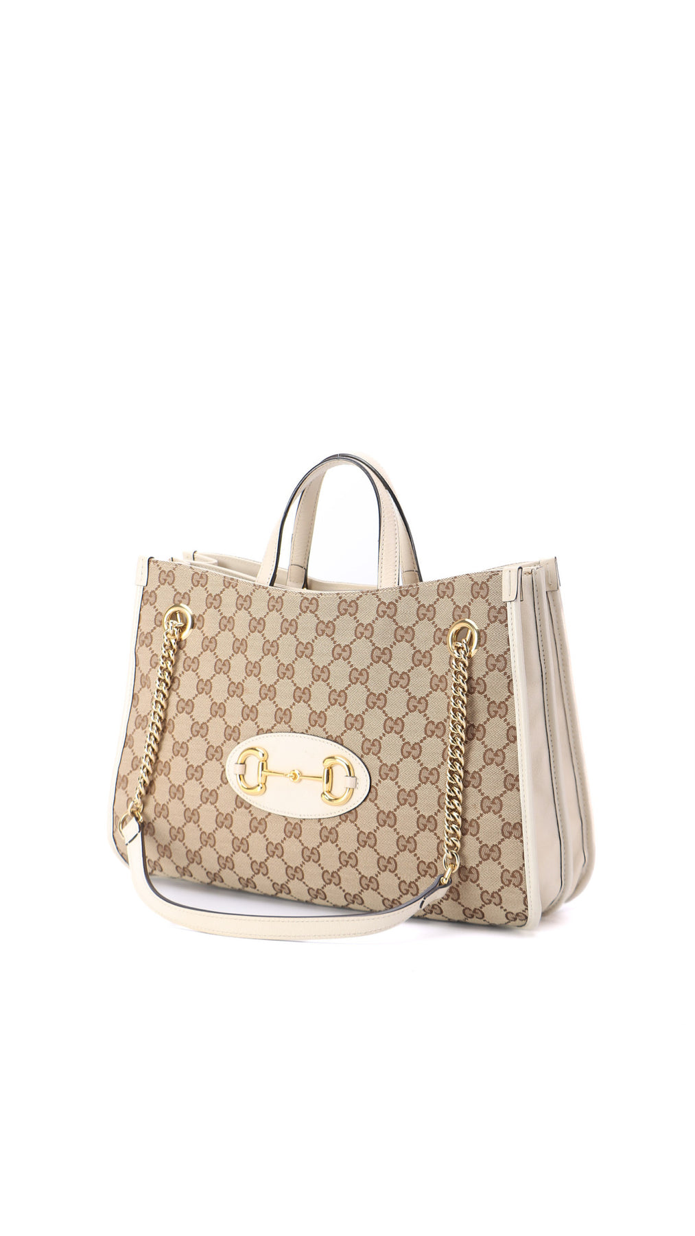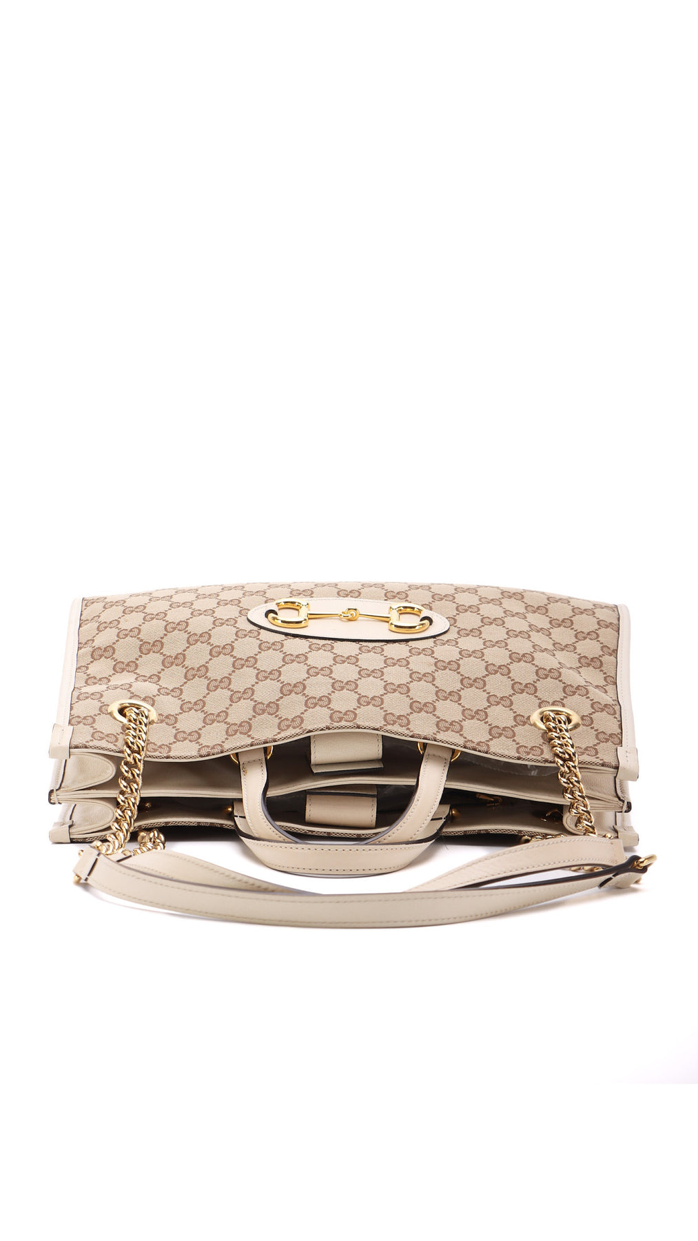 Gucci Horsebit Chain Tote er en elegant og romslig veske som kombinerer det klassiske GG-mønsteret med luksuriøse detaljer. Modellen er laget i brun GG Supreme canvas med kremfargede skinnkanter og prydet med den ikoniske horsebit-detaljen i gullfarget metall på fronten.