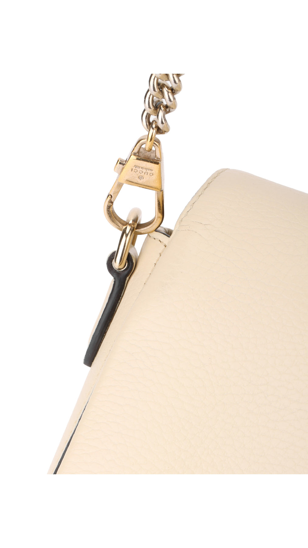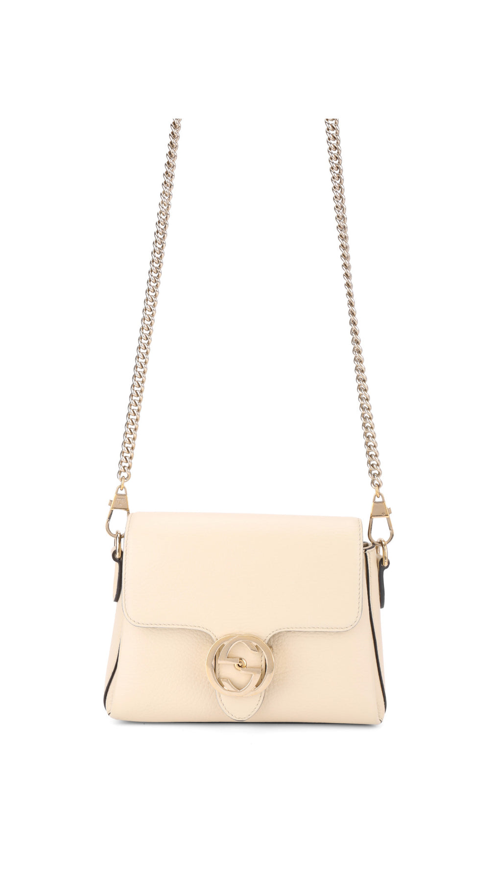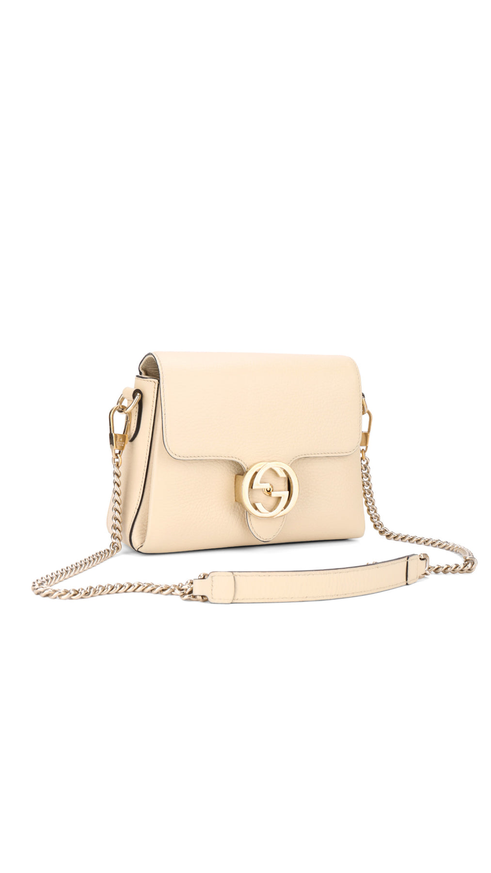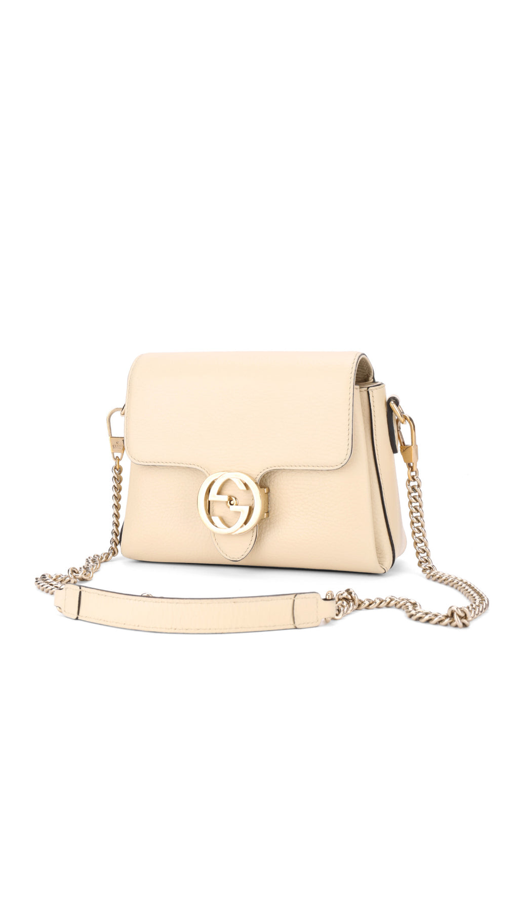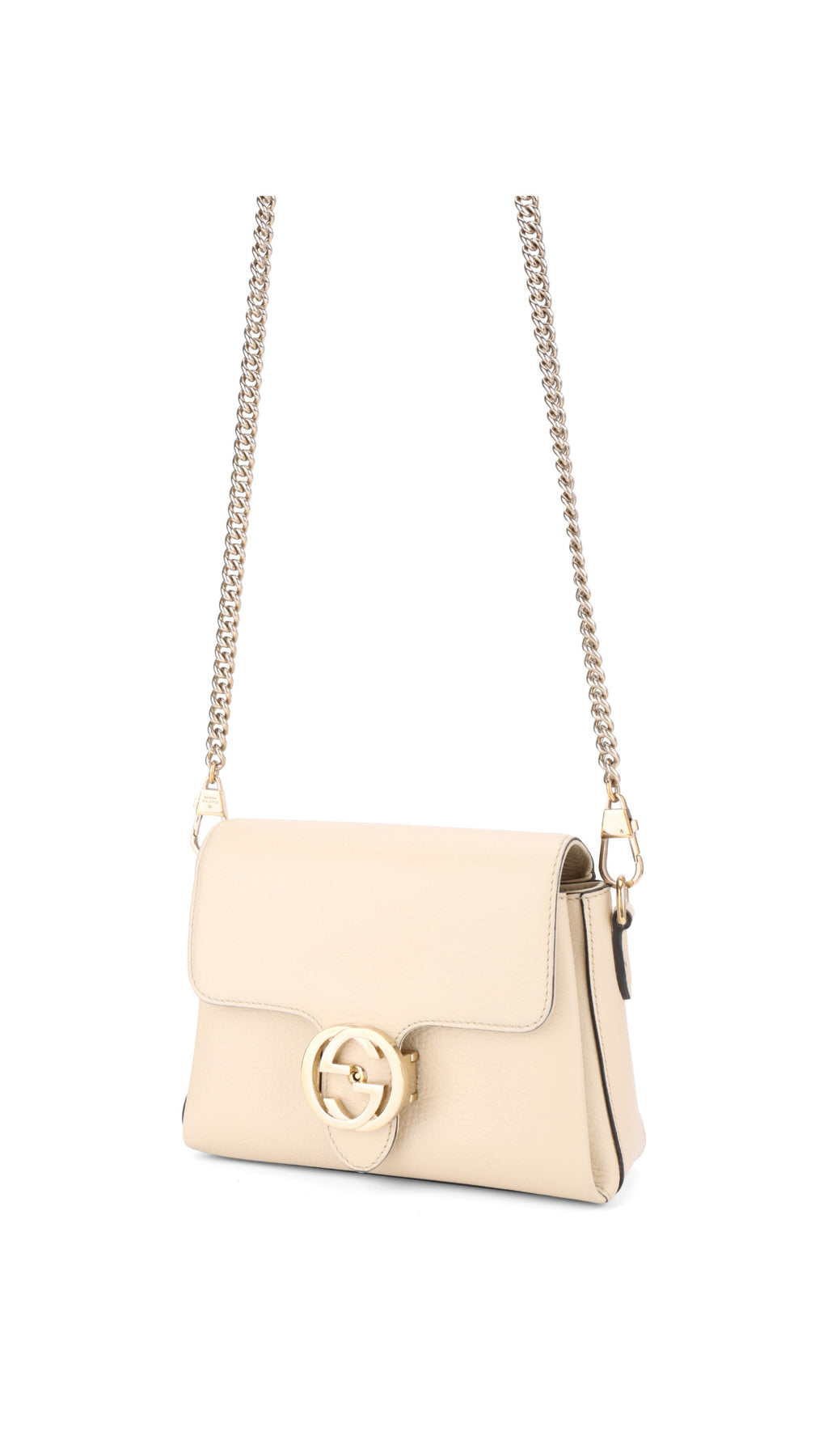 Gucci Interlocking GG Chain Shoulder Bag. Denne elegante Gucci-skuldervesken er laget i mykt, glatt skinn i en lys beige/kremhvit tone og prydes av den ikoniske interlocking GG-logoen i gullfarget metall. Vesken har en strukturert klaffdesign med magnetisk lukking og en raffinert kjedestropp med skinnforsterkning, som gjør den behagelig å bære både på skulderen og crossbody. Et tidløst og sofistikert tilbehør som løfter ethvert antrekk – perfekt til både hverdags og spesielle anledninger.