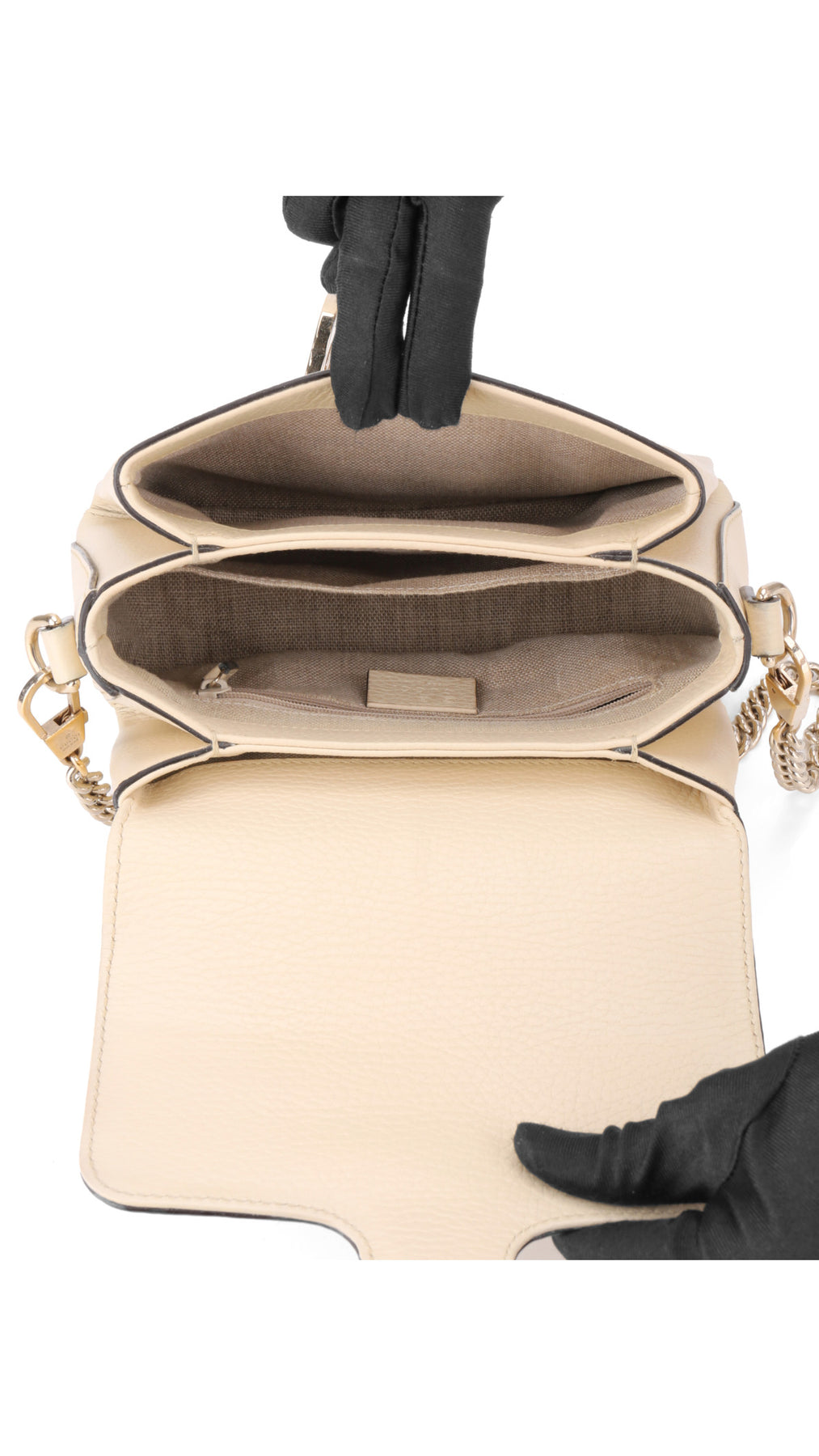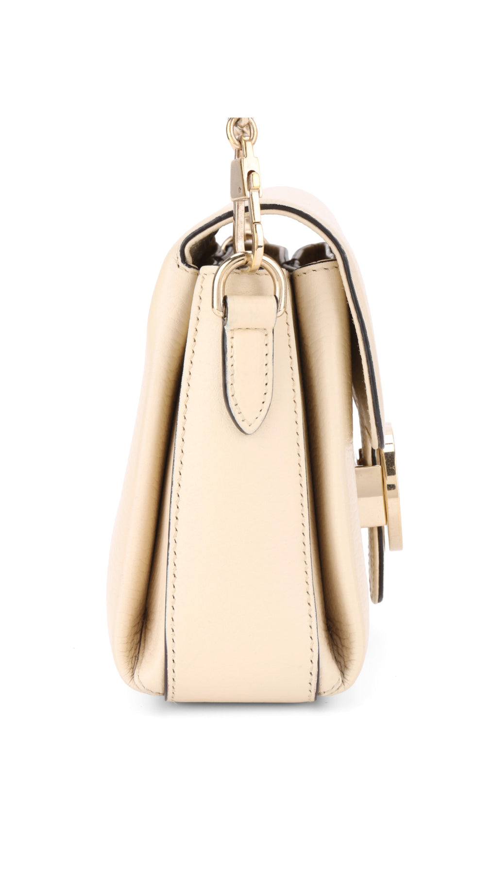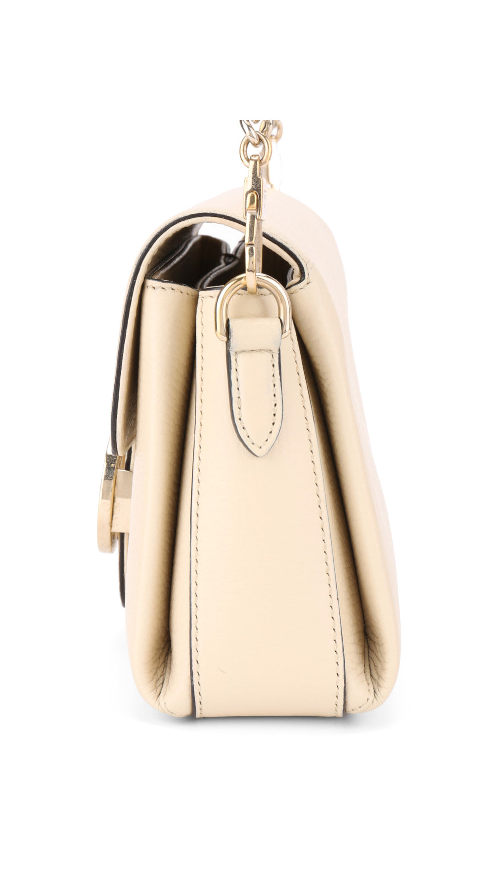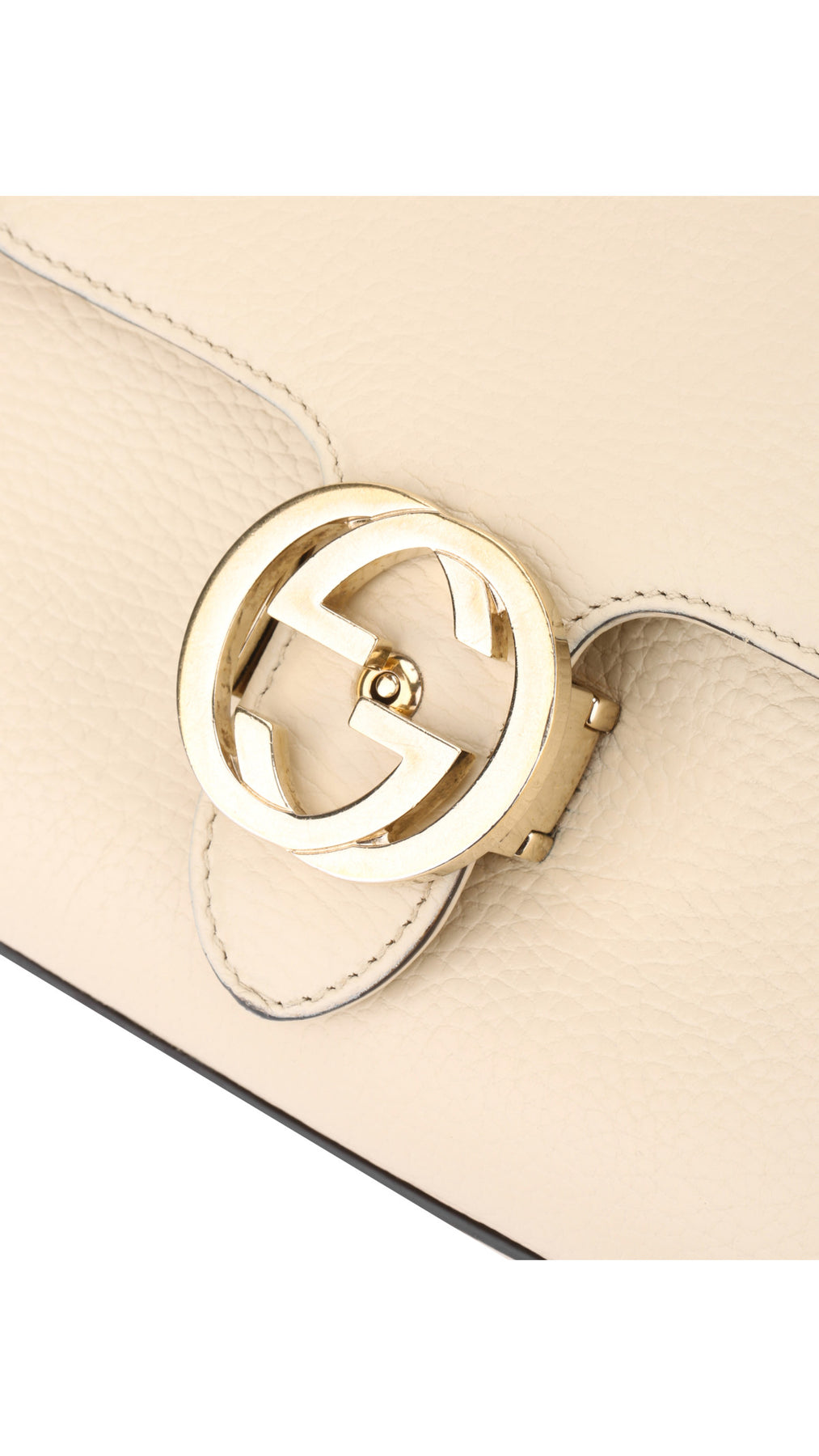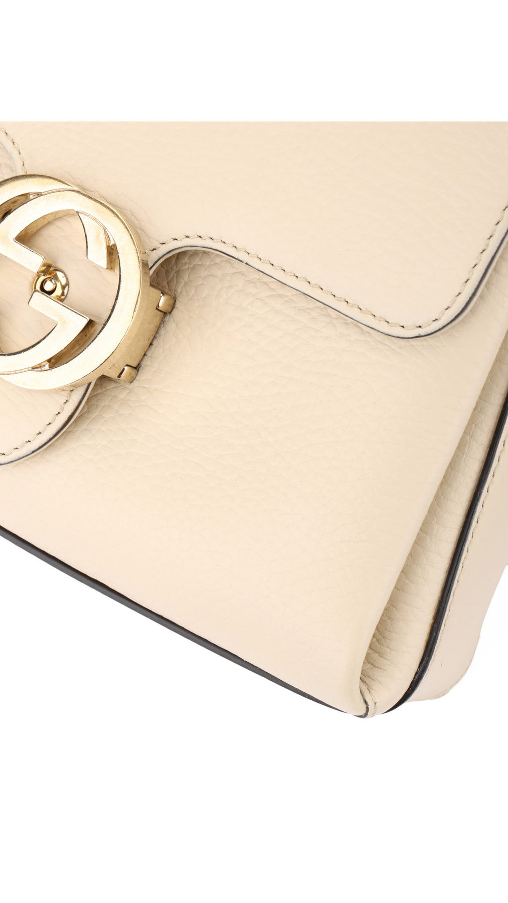 Gucci Interlocking GG Chain Shoulder Bag. Denne elegante Gucci-skuldervesken er laget i mykt, glatt skinn i en lys beige/kremhvit tone og prydes av den ikoniske interlocking GG-logoen i gullfarget metall. Vesken har en strukturert klaffdesign med magnetisk lukking og en raffinert kjedestropp med skinnforsterkning, som gjør den behagelig å bære både på skulderen og crossbody. Et tidløst og sofistikert tilbehør som løfter ethvert antrekk – perfekt til både hverdags og spesielle anledninger.