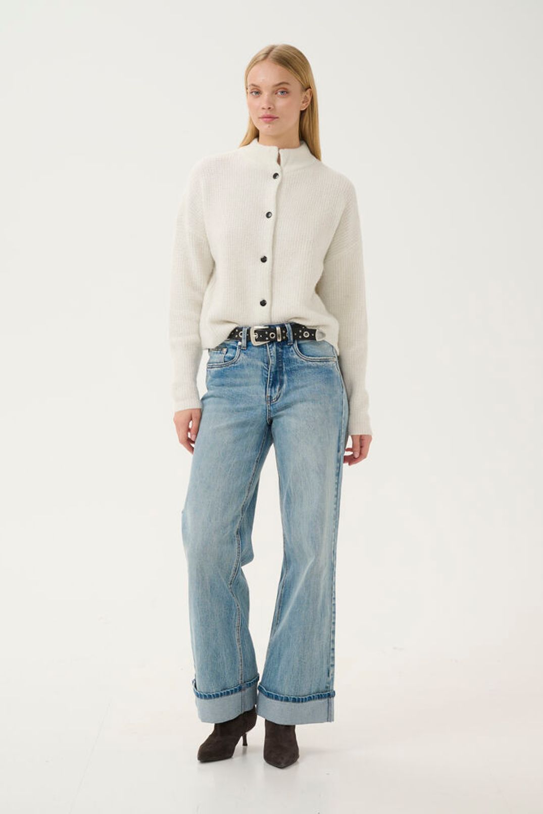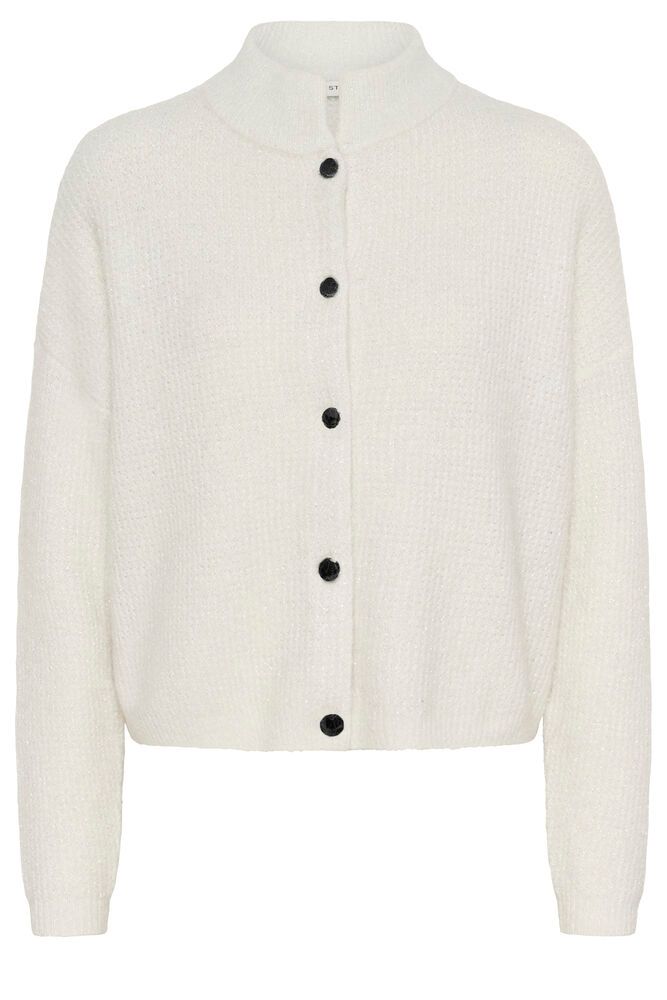 Gzalpha Shimmer Cardigan fra Gestuz. En elegant og myk cardigan med subtil glans som gir antrekket et hint av luksus. Den har en avslappet, men feminin passform med høy hals og kontrastknapper i front – perfekt både til jeans og skjørt.