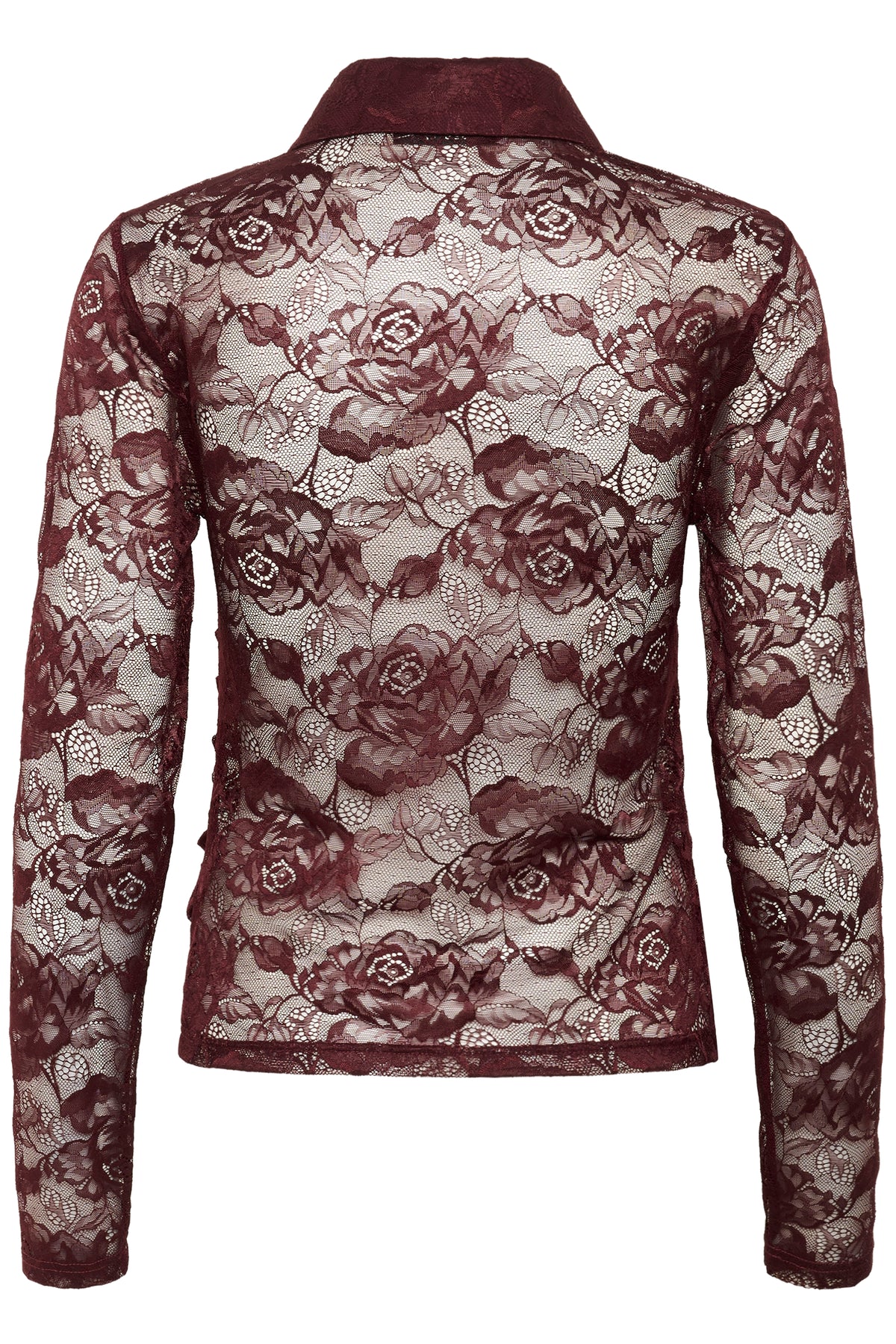 Gzleala Shirt fra Gestuz. Gzleala Shirt er en forførende skjorte i burgunderrød blonde, perfekt for fest eller lag-på-lag-styling. Den transparente blondestrukturen gir et hint av det som er under, mens det flatterende rynkede frontpartiet gir en feminin silhuett. Skjorten har klassisk krage, hel knappestolpe og lange ermer – alt i samme delikate blondestoff for en helhetlig look. Style med skinn, jeans eller skjørt for en edgy kontrast.