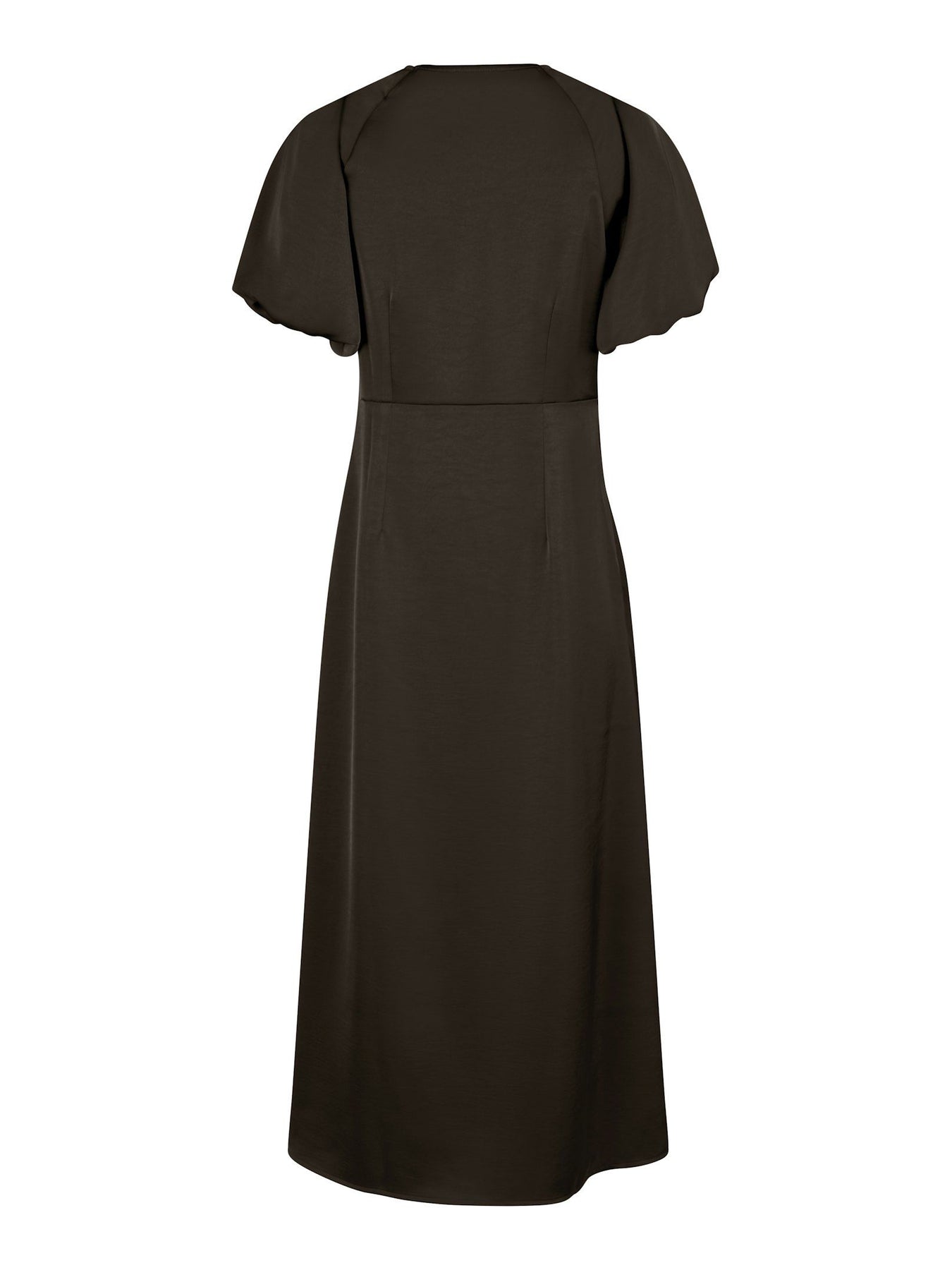 Illana Heavy Sateen Dress fra Neo Noir. Nydelig midikjole fra Neo Noir i sesongens store trendfarge - mørk brun lekre detaljer og buet snittlinje som skaper en feminin og flatterende passform, og store puffermer.