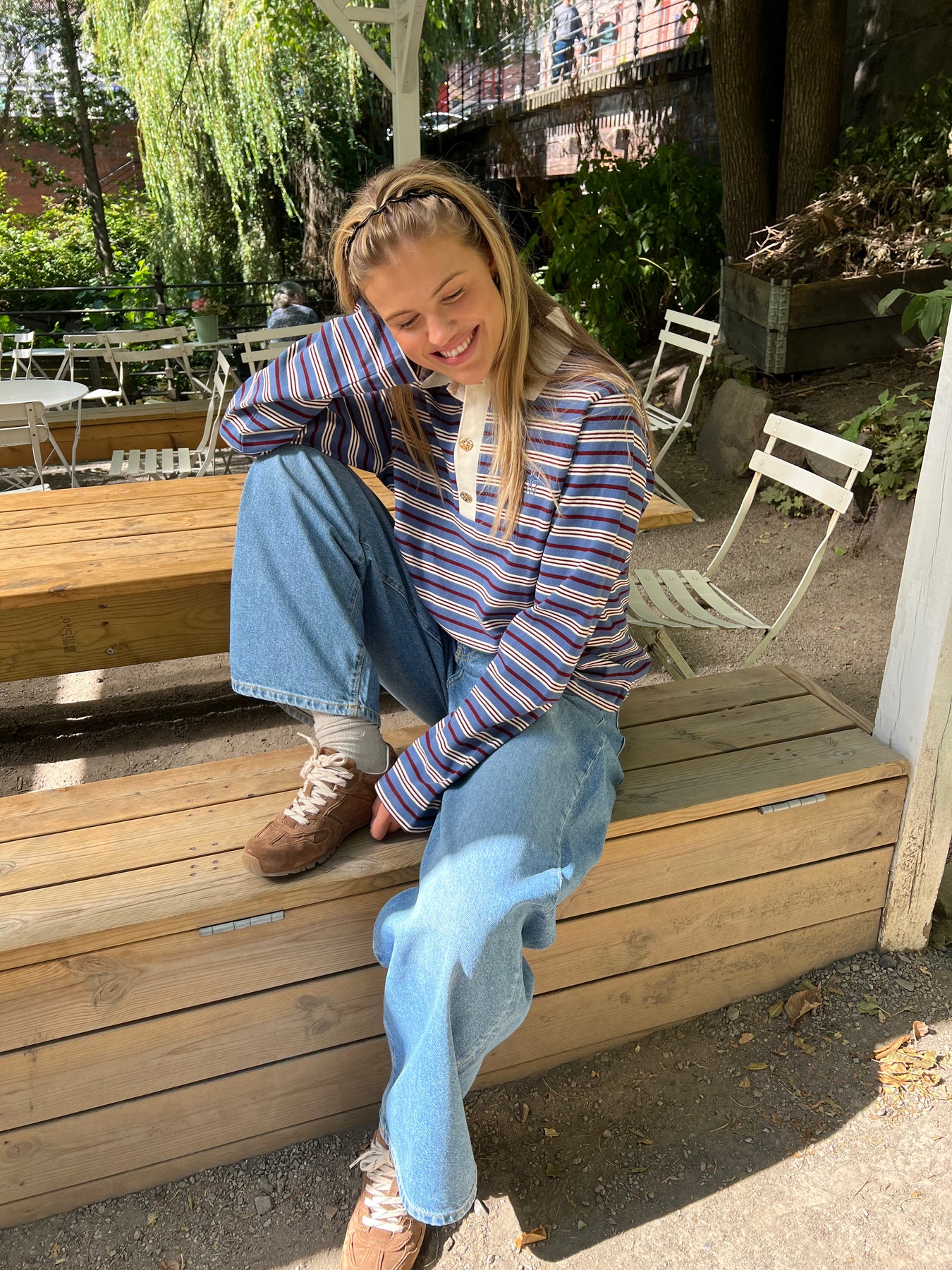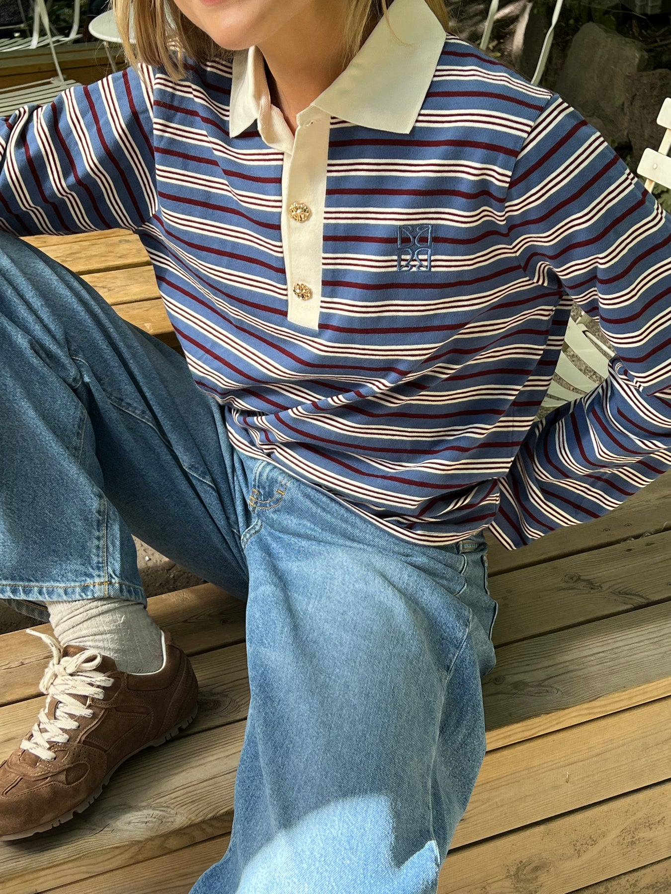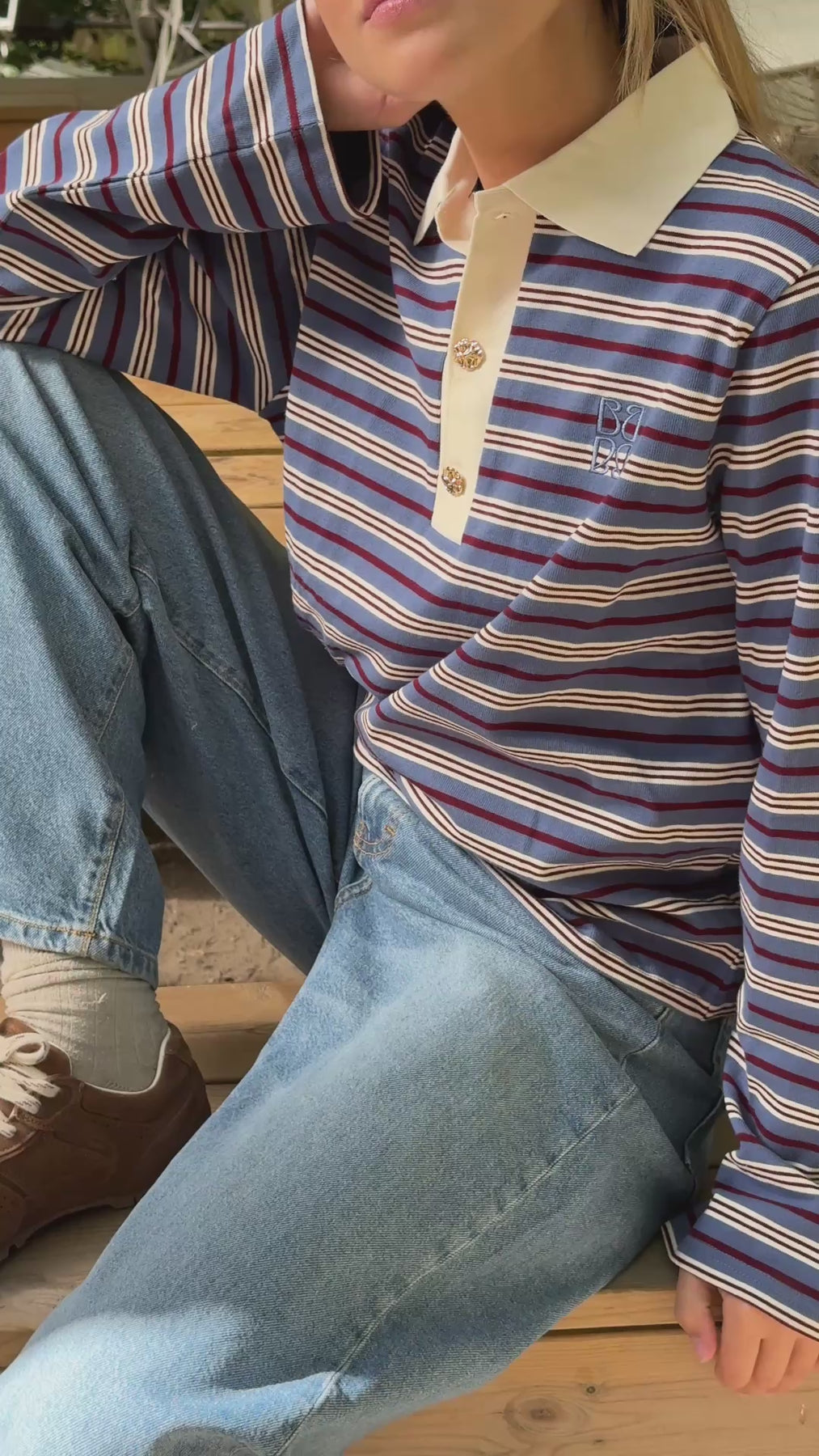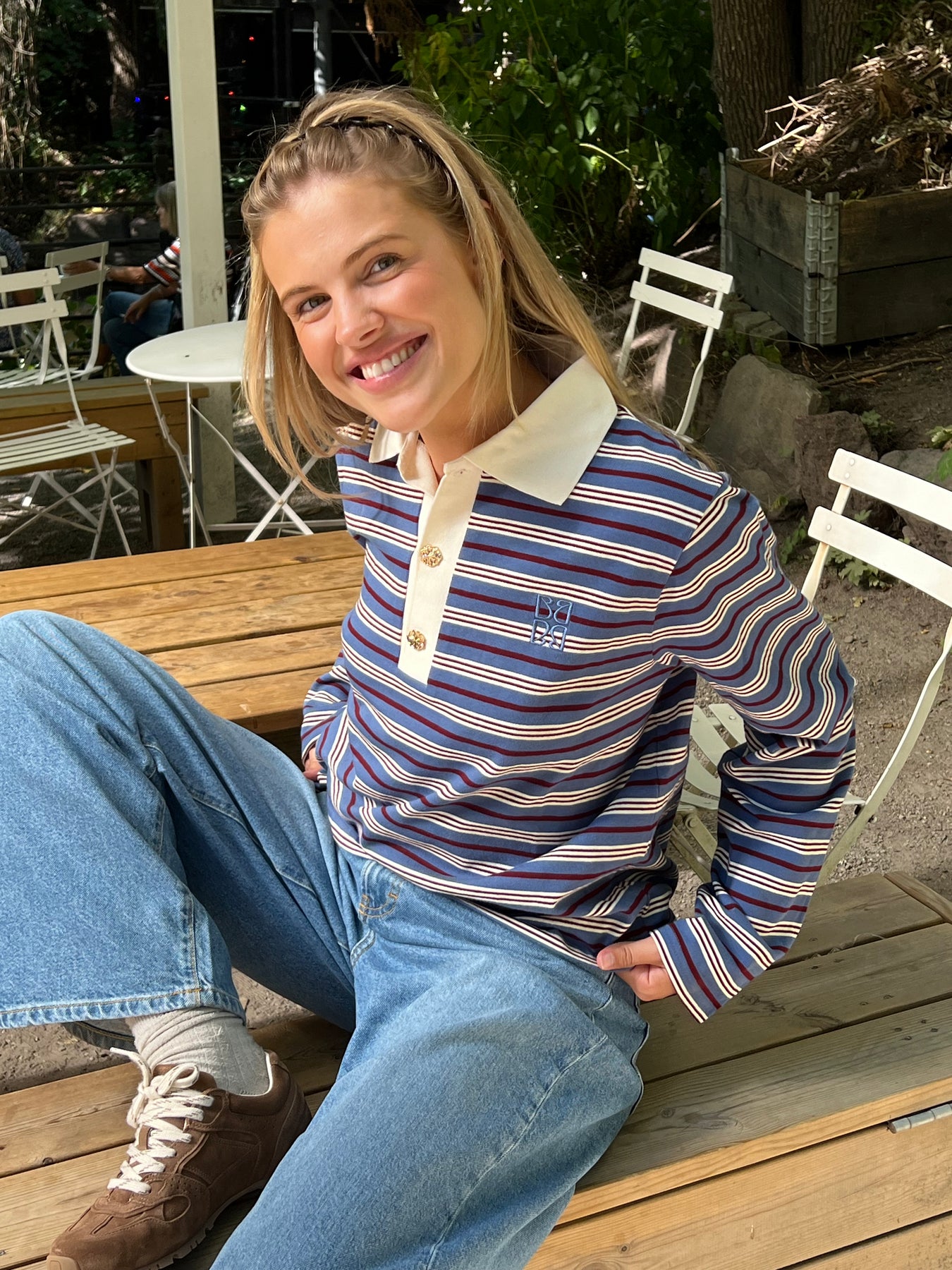 Isabelle Striped Polo Jumper fra Bouveti. Preppy, leken og avslappet – denne stripete pologenseren fra norske Bouveti er det perfekte statementplagget. Genseren har striper i blått, vinrødt og hvitt, med kontrastkrage og gullknapper foran som gir et sofistikert preg. Det broderte Bouveti-logoen på brystet setter prikken over i-en, mens den boxy, avslappede passformen gjør den lett å style med både miniskjørt og denim.