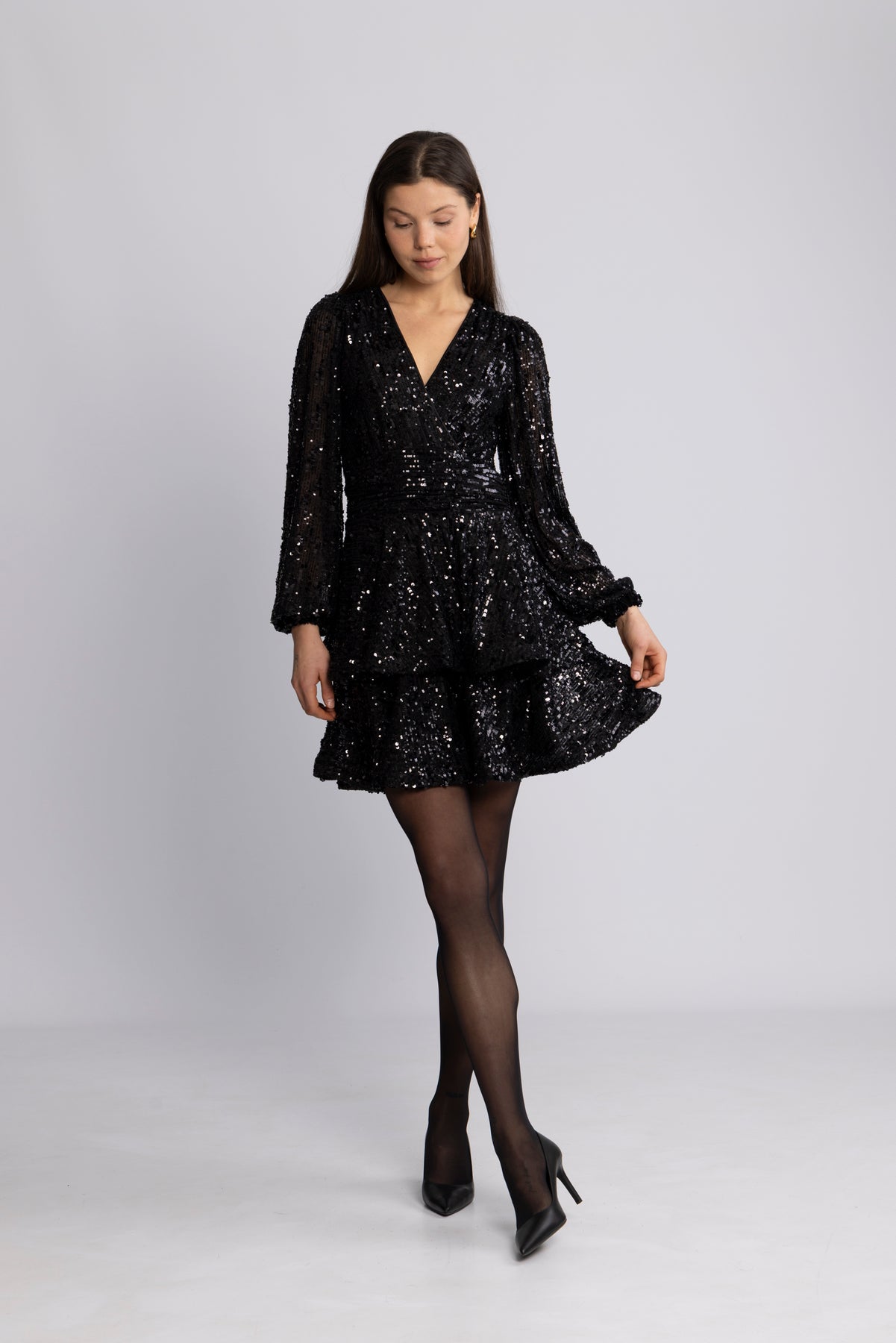 Jade Wave Sequins Solid Dress fra OSMINE af nor. Jade Wave Sequins Solid Dress er en glitrende drøm av en kjole i klassisk sort med paljetter som reflekterer lyset med hver bevegelse. Den omslagsinspirerte overdelen fremhever midjen, mens skjørtet med volanglag gir en feminin og festklar silhuett. En kjole som kombinerer eleganse og statement på perfekt vis.