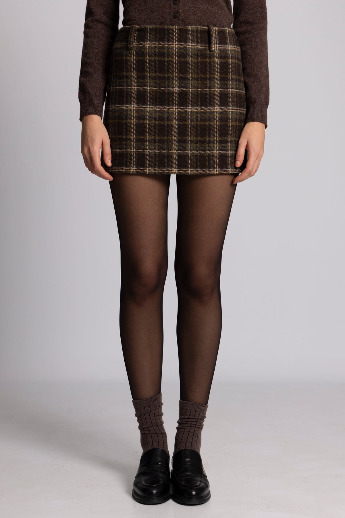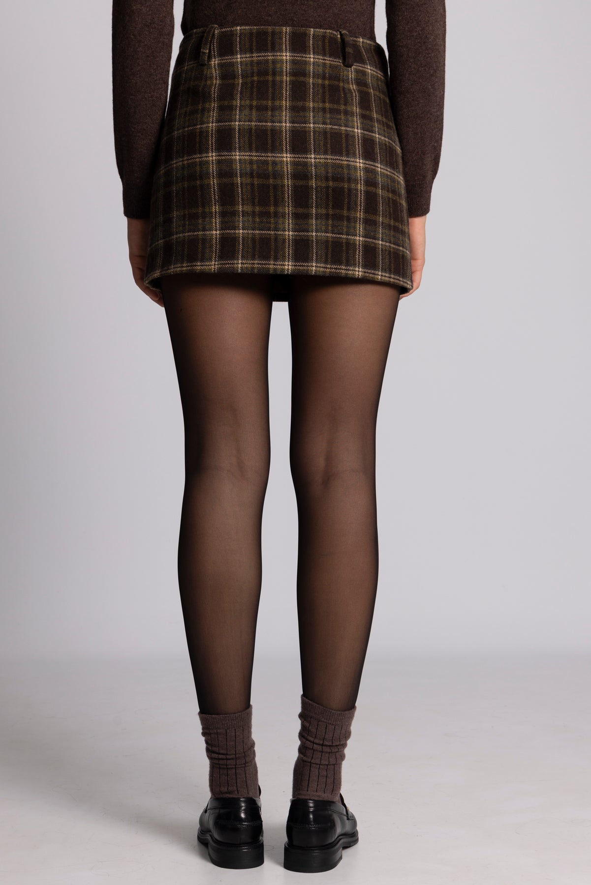 Jennifer Wool Checked Mini Skirt er et preppy miniskjørt med klassisk rutemønster i dype brune og olivengrønne toner. Skjørtet har en rett, kort passform med beltehemper i livet og et strukturert stoff i ullblanding som gir en lun følelse.