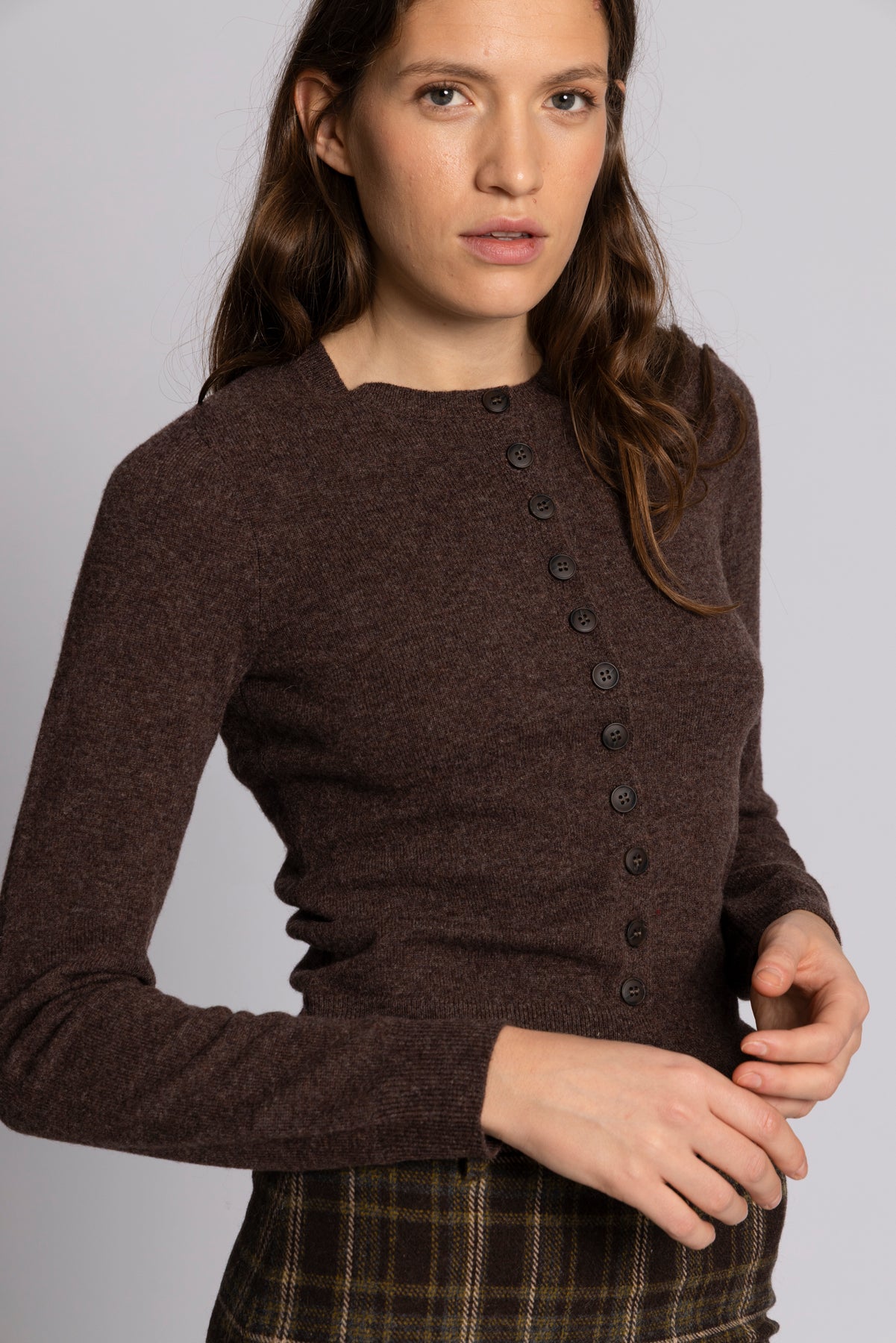 Jenny Knit Wool Cardigan fra VILLOID av Polliani er en klassisk cardigan i myk ullblanding med et sofistikert uttrykk. Den har rund hals, smal passform og en hel knappestolpe foran med ton-i-ton knapper. Den dype sjokoladebrune fargen gir et elegant og tidløst preg, perfekt både til skjørt og dressbukser.