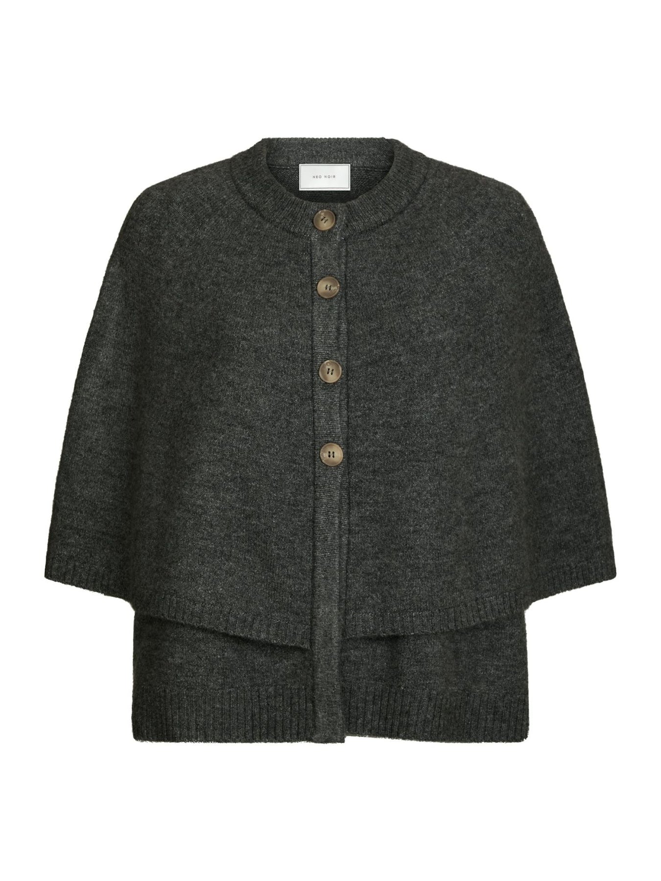Josei Double Knit Cape fra Neo Noir. Klassisk og elegant cape i en myk og lun kvalitet. Josei Double Knit Cape har en løs og avslappet fasong med avrundede skuldre og brede ermeåpninger. Den strikkede overflaten gir en eksklusiv tekstur, og knappeåpningen i front fullfører uttrykket med store dekorative knapper i perlemor-look. En tidløs layering-piece til både hverdags og jobb.