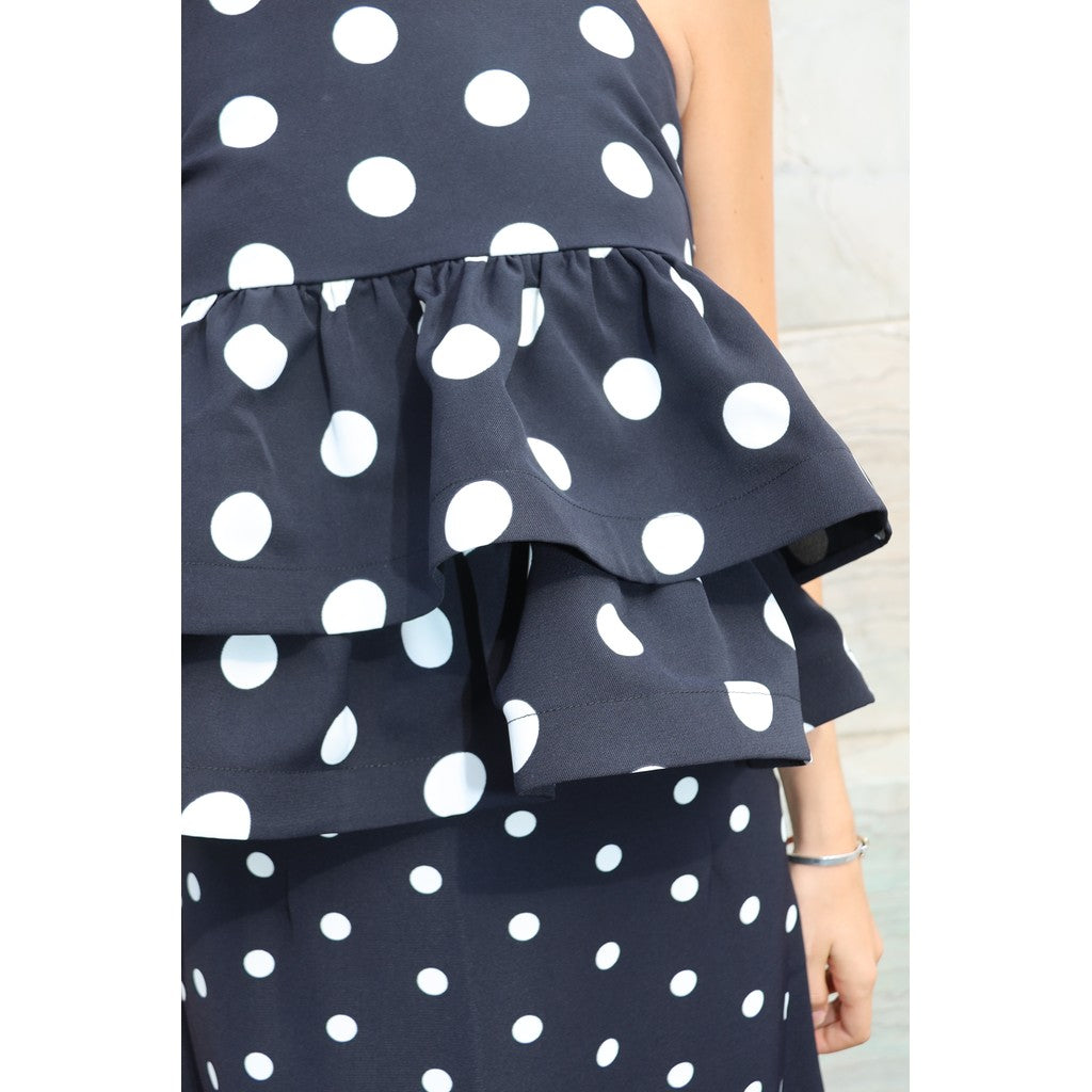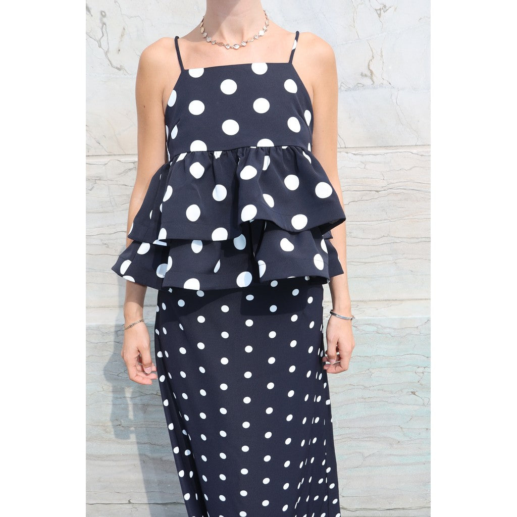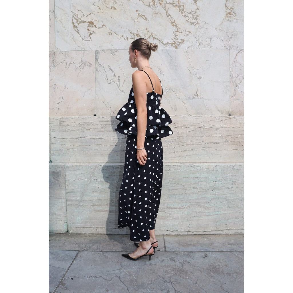 Josellecras Top – Black Polka Grande fra Crās Cph. En leken og voluminøs topp som setter prikken over i-en på sommergarderoben. Josellecras har tynne stropper, markert midje og to lag med asymmetrisk volang som gir en dramatisk og feminin silhuett. Den sorte bunnfargen brytes opp av store, hvite prikker – et klassisk mønster med moderne attitude. Perfekt til både matchende skjørt eller jeans for en kontrastfylt look.