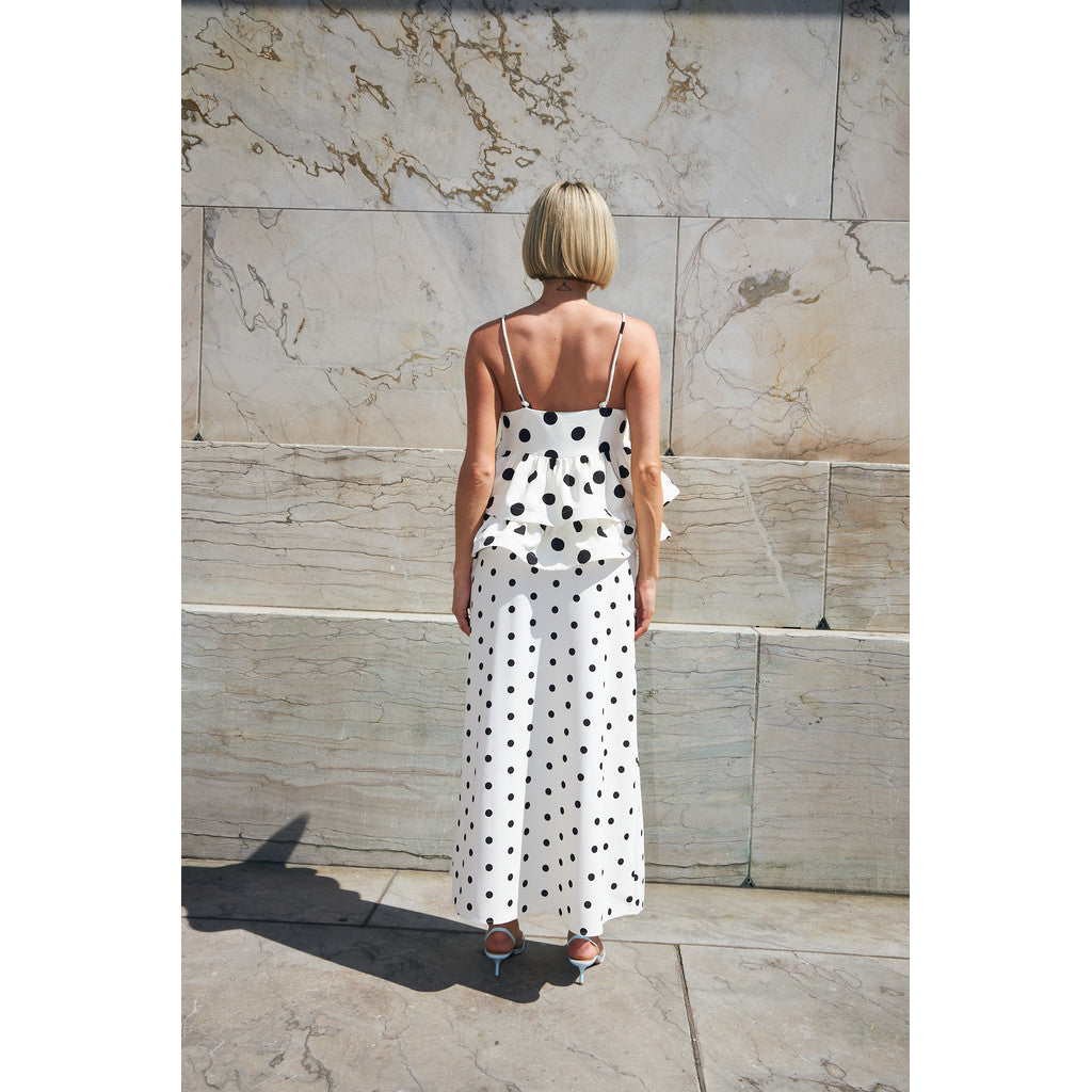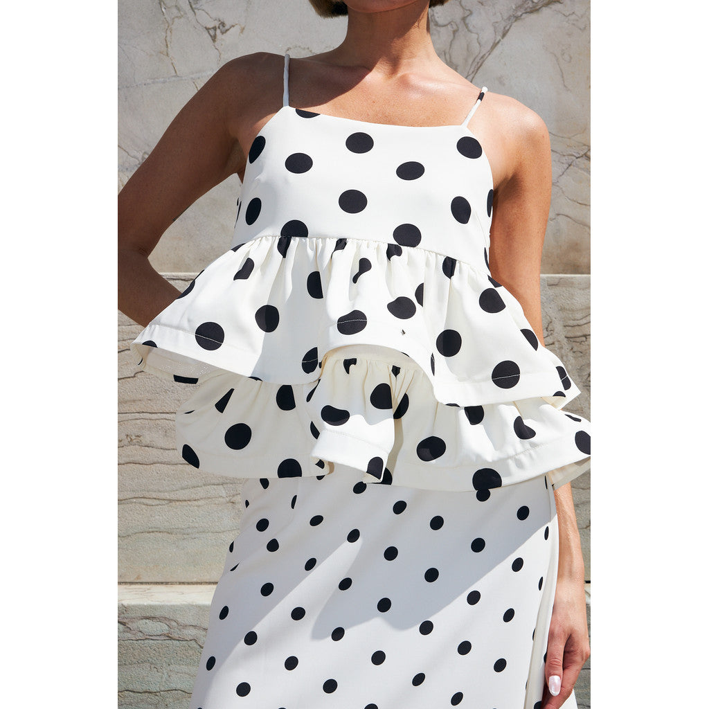 Josellecras Top fra Cras Cph. Sensommerens hotteste topp fra Sofie Årnes' kolleksjon med Cras Cph. Josellecras Top kombinerer maksimal feminitet med en leken silhuett. Den kommer i en kremhvit bunnfarge med klassiske, men lekne sorte prikker, og har en voluminøs peplum-form med to lag volanger som gir nydelig bevegelse. Smale stropper og en rett, flatterende utringning gjør den perfekt både til hverdags og sommerfester.