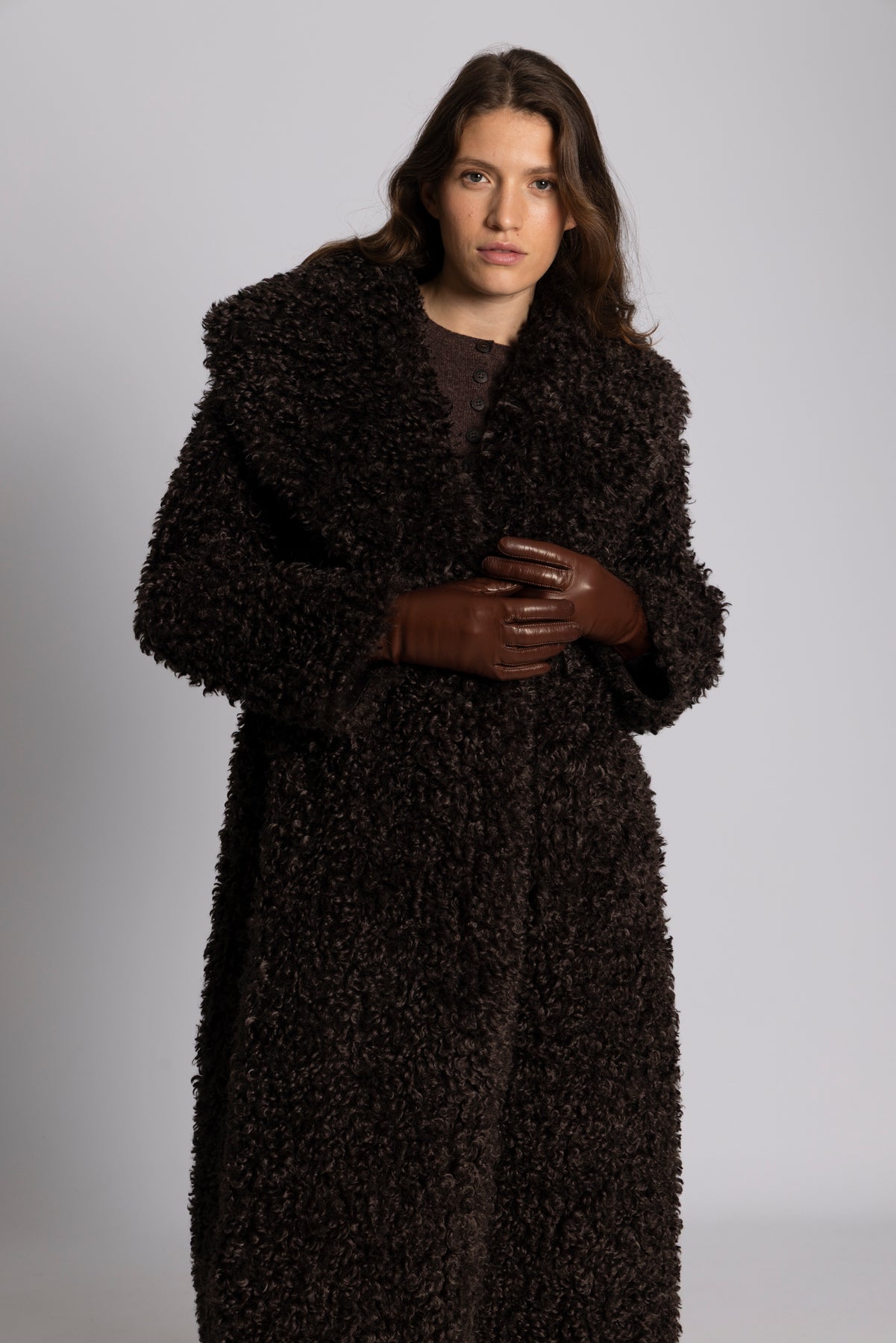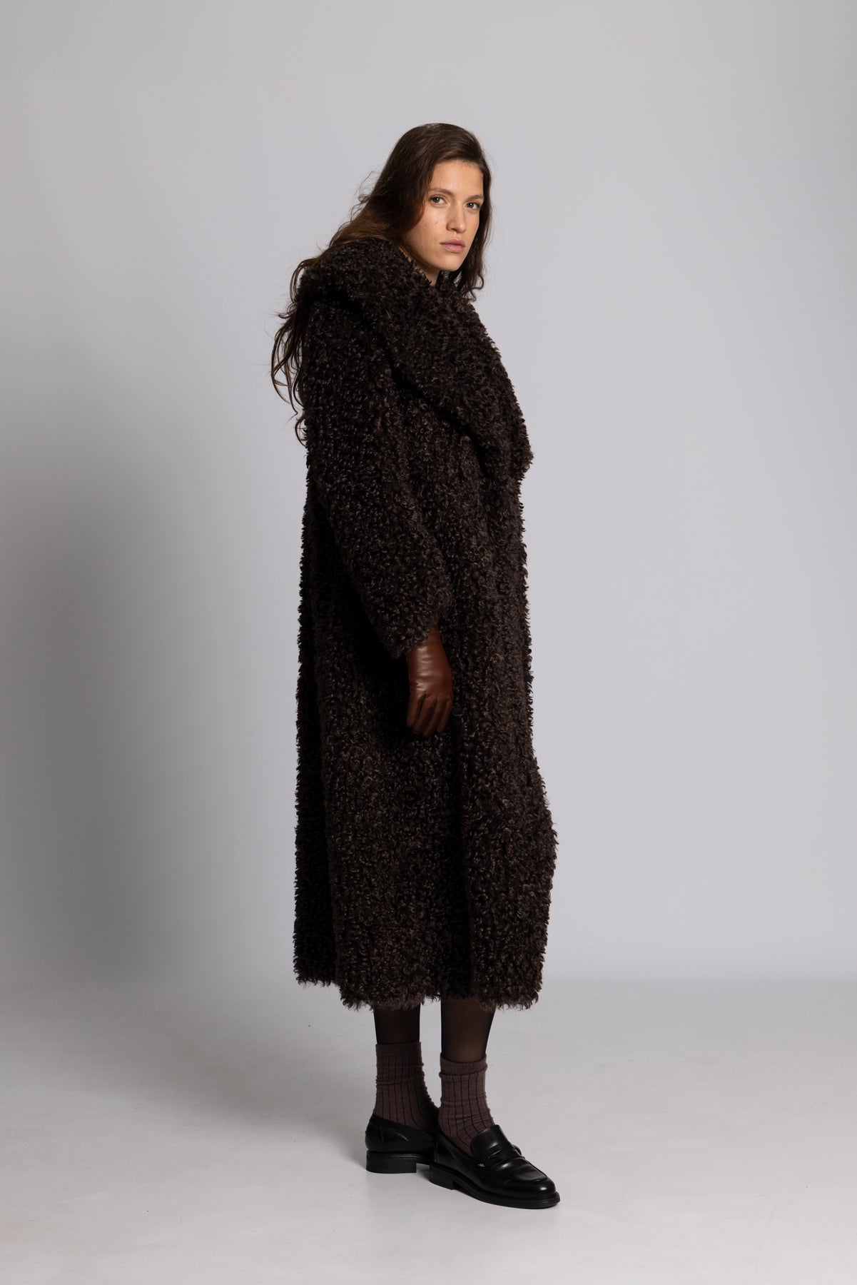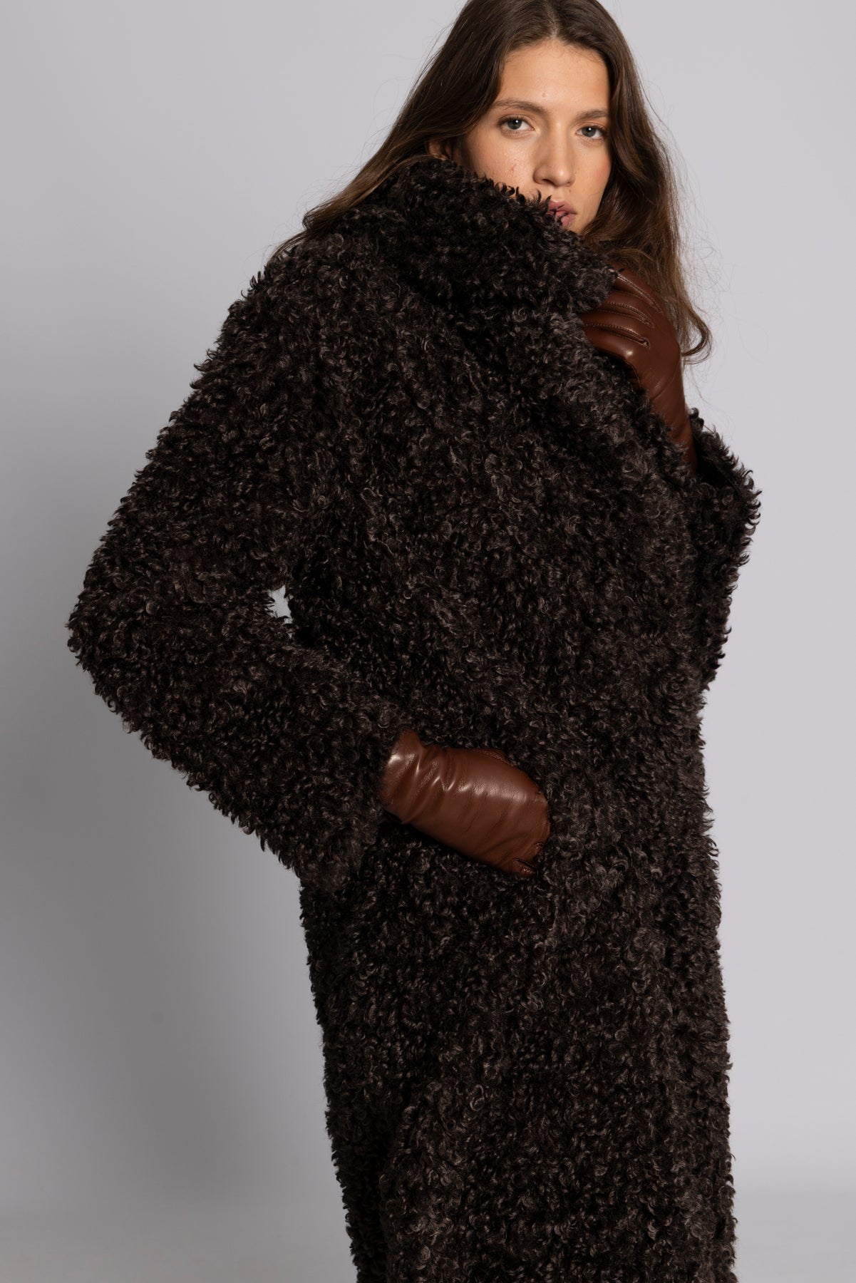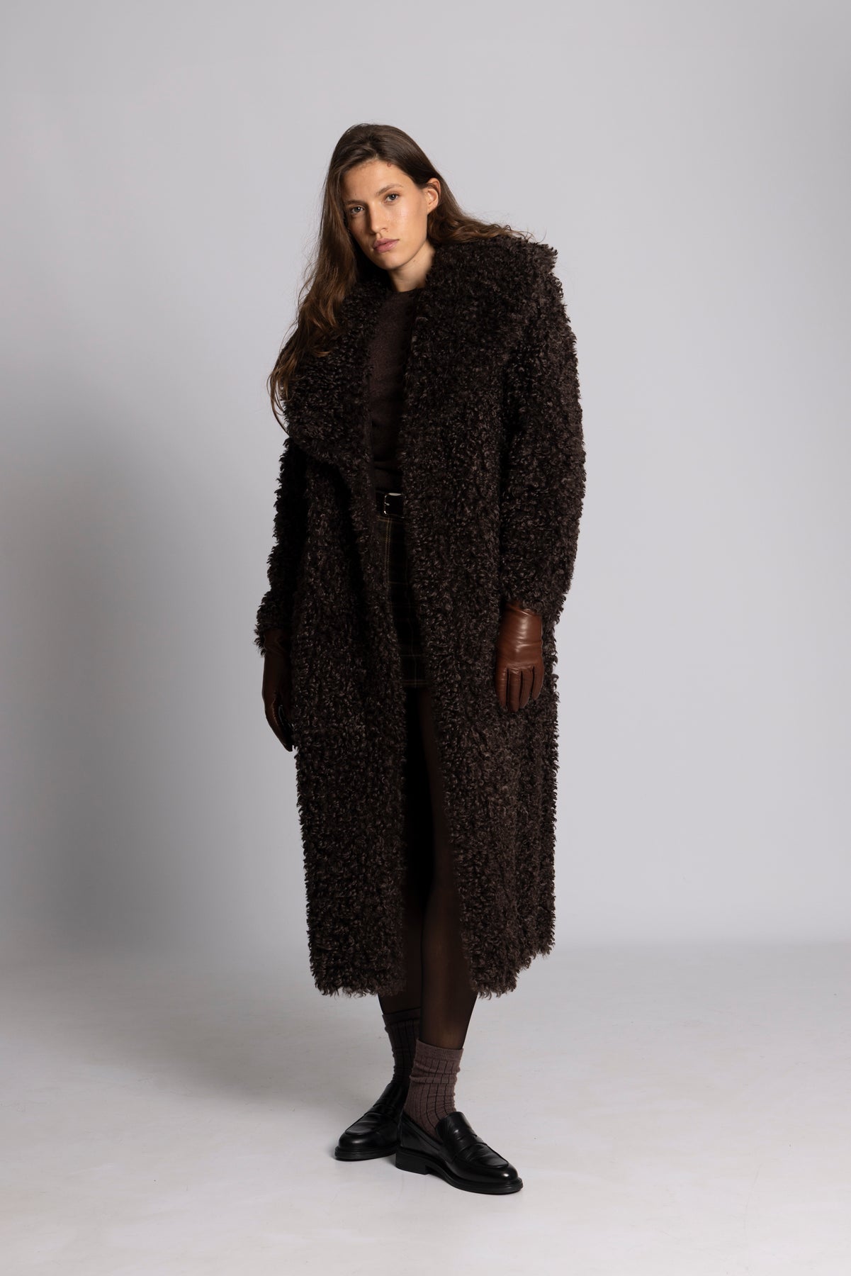 Karen Faux Fur Coat fra VILLOID av Polliani. Karen Faux Fur Coat er en eksklusiv, lang kåpe i myk teddystruktur som gir både varme og et statementpreg. Den dype sjokoladebrune fargen og den voluminøse kragen gir et elegant og moderne uttrykk, mens det rette snittet gir et sofistikert fall. En tidløs favoritt for kalde dager.