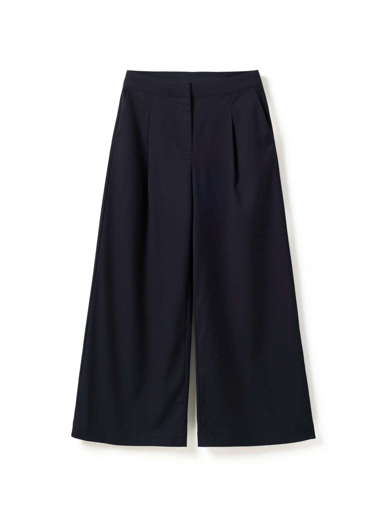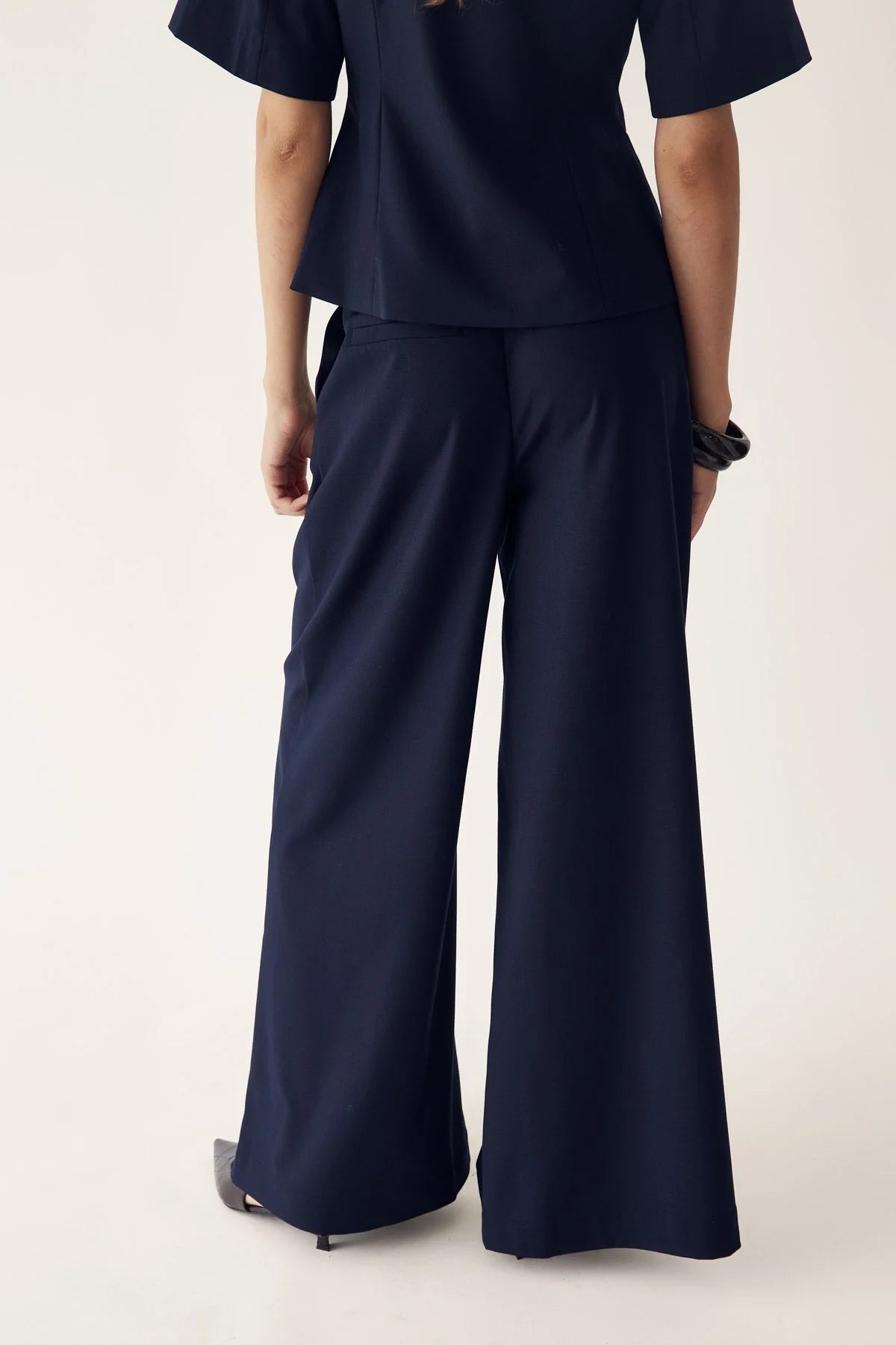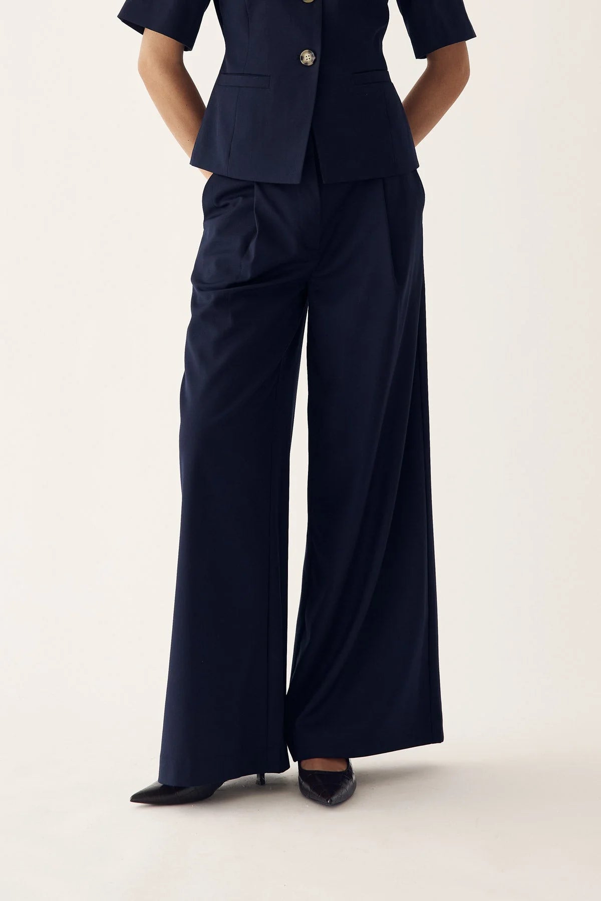 Kazia Pants fra Noella. Kule dressbukser fra Noella med ekstra vide ben. Kazia Pants har høy midje med knappelukking og legg foran, og lommer i sidene. Buksene er perfekt å style med Kasundra Blazer for et matchende sett.