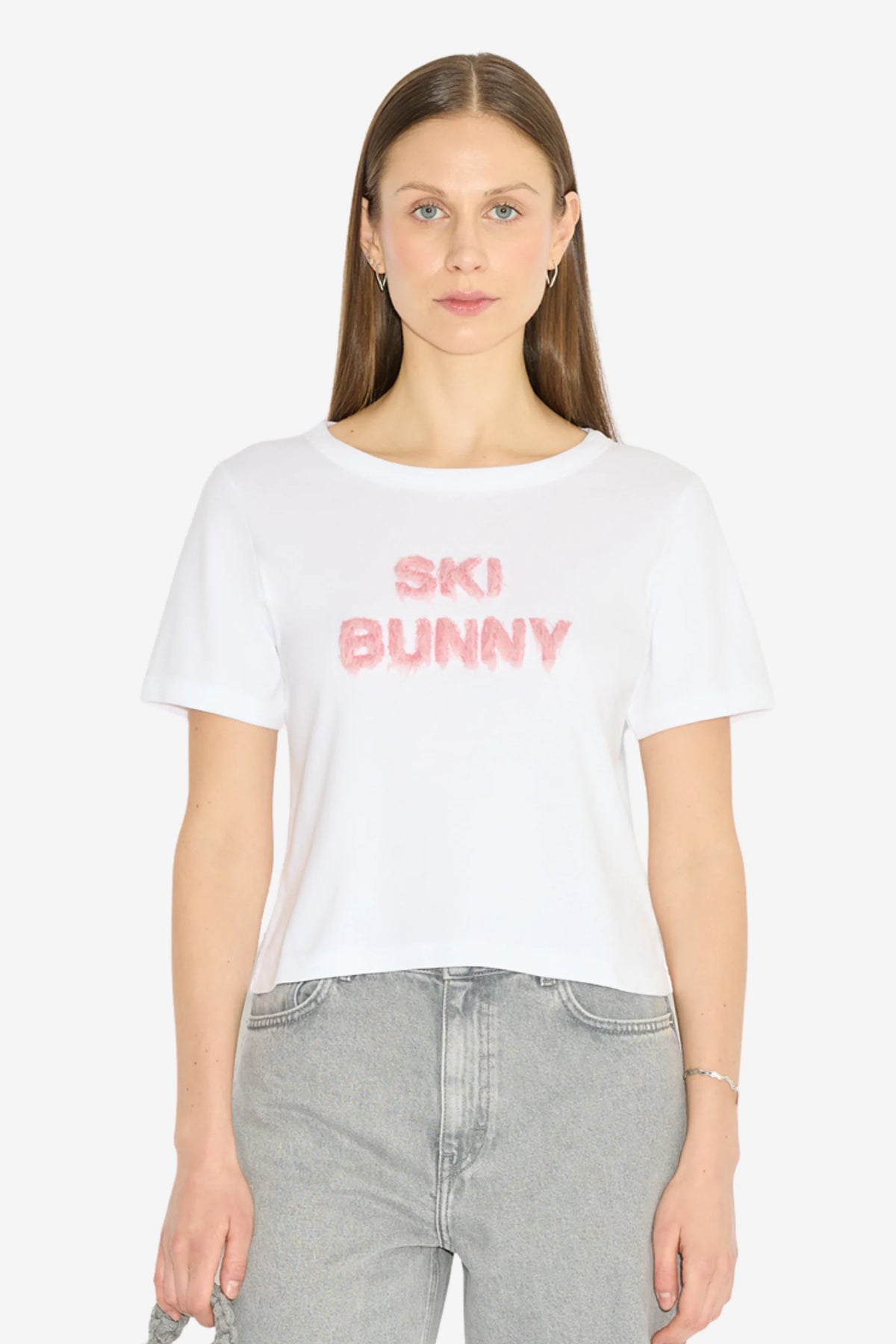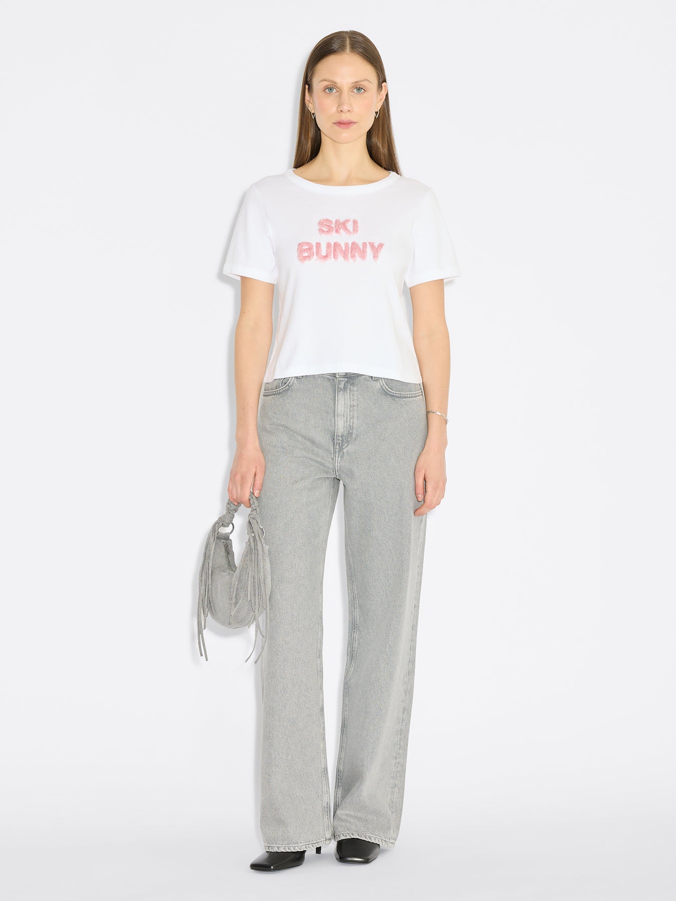 Kitty Fluffy Tee fra Holzweiler. En hvit t-skjorte med rosa «SKI BUNNY»-applikasjon i fluffy tekstur som gir et lekent uttrykk. T-skjorten har klassisk rund hals, korte ermer og en litt cropped, rett passform. Kitty Fluffy Tee kombinerer komfort med et humoristisk vinterpreg – perfekt for en avslappet, men stilsikker look.