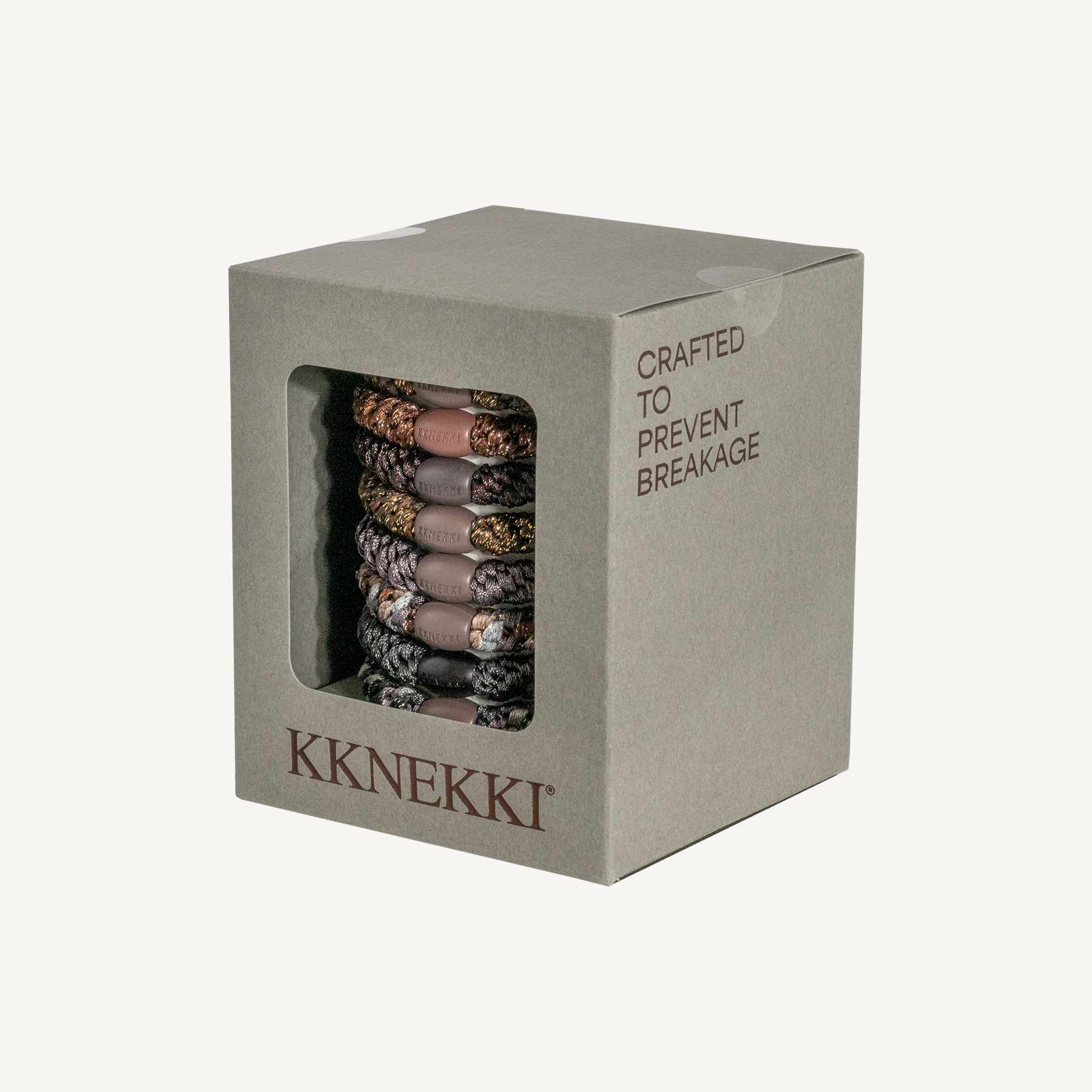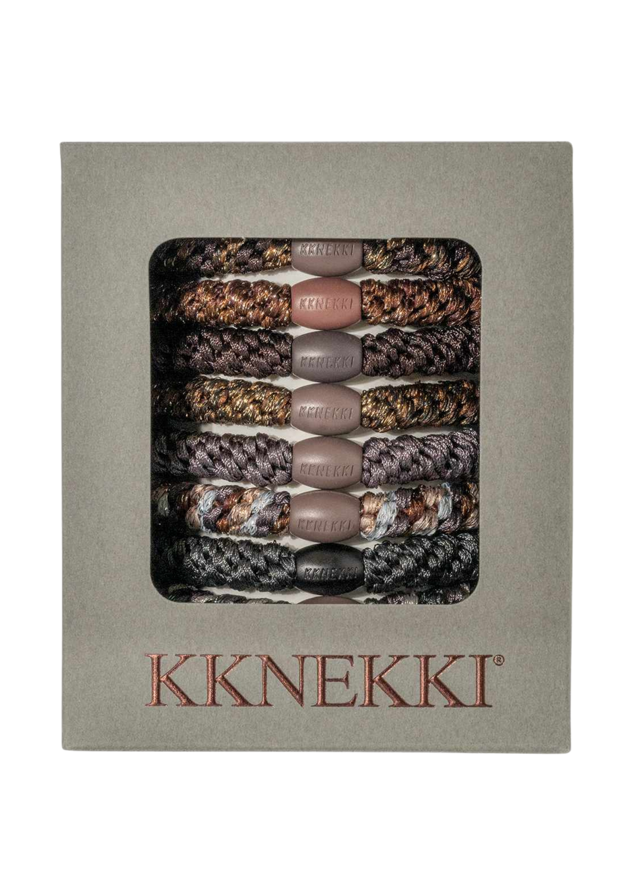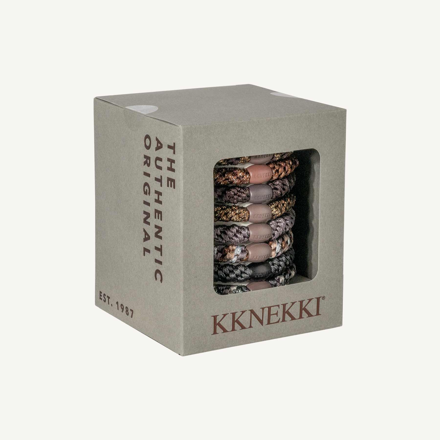 Kknekki Earth Edition kombinerer dype jordtoner med subtile nyanser som harmonerer vakkert med brunt hår. Designet for dem som foretrekker et naturlig og diskret uttrykk, fremhever denne utgaven mørkere hårtoner samtidig som den er allsidig nok til enhver stil. Laget med Kknekkis unike veveteknikk er den eksepsjonelt slitesterk, skånsom mot håret og behagelig å bruke, uten å miste elastisiteten. Perfekt både til hverdags og spesielle anledninger – og like vakker rundt håndleddet som i håret.