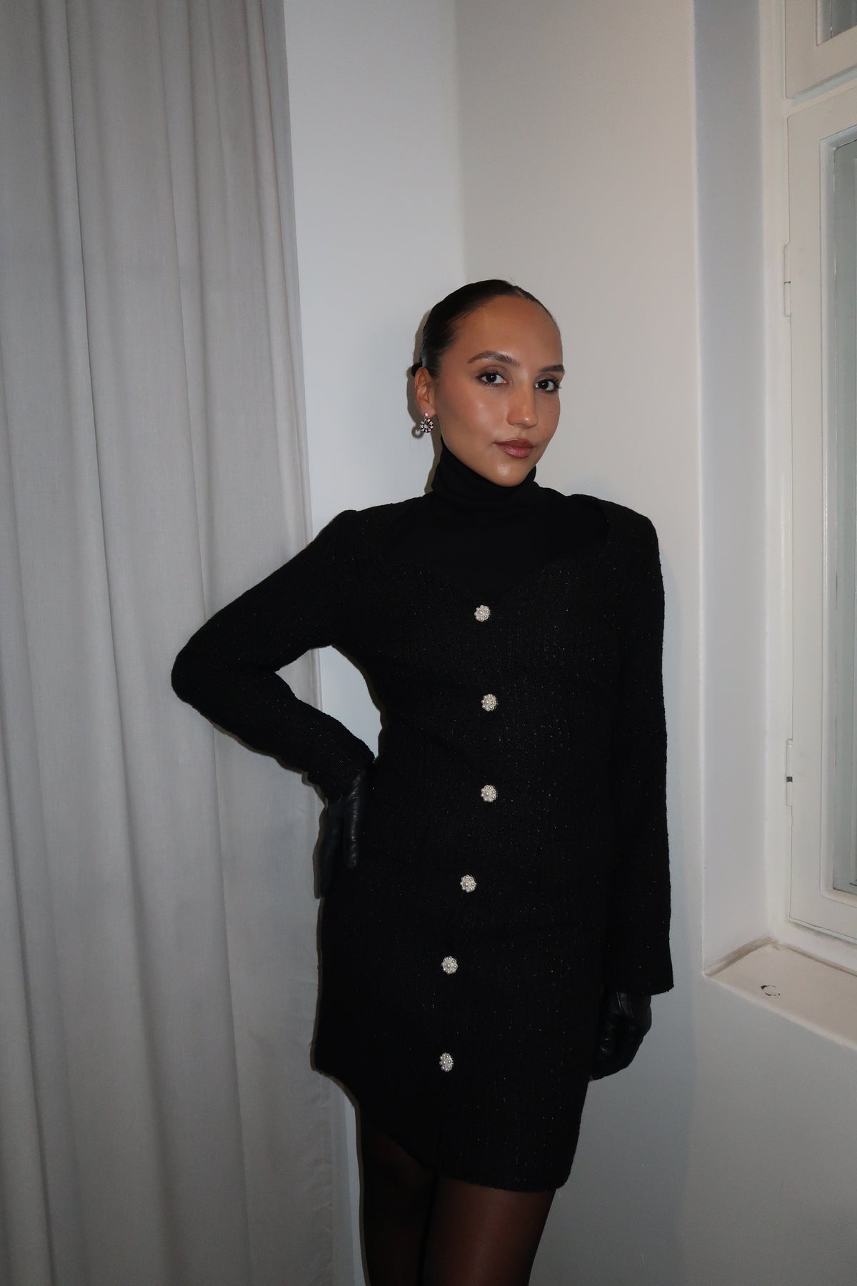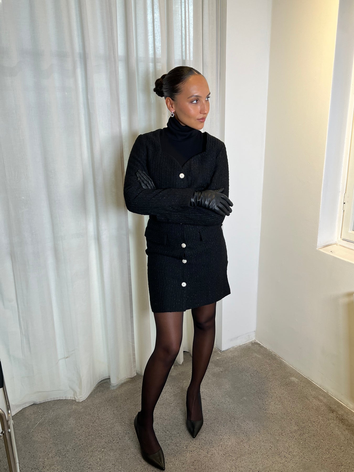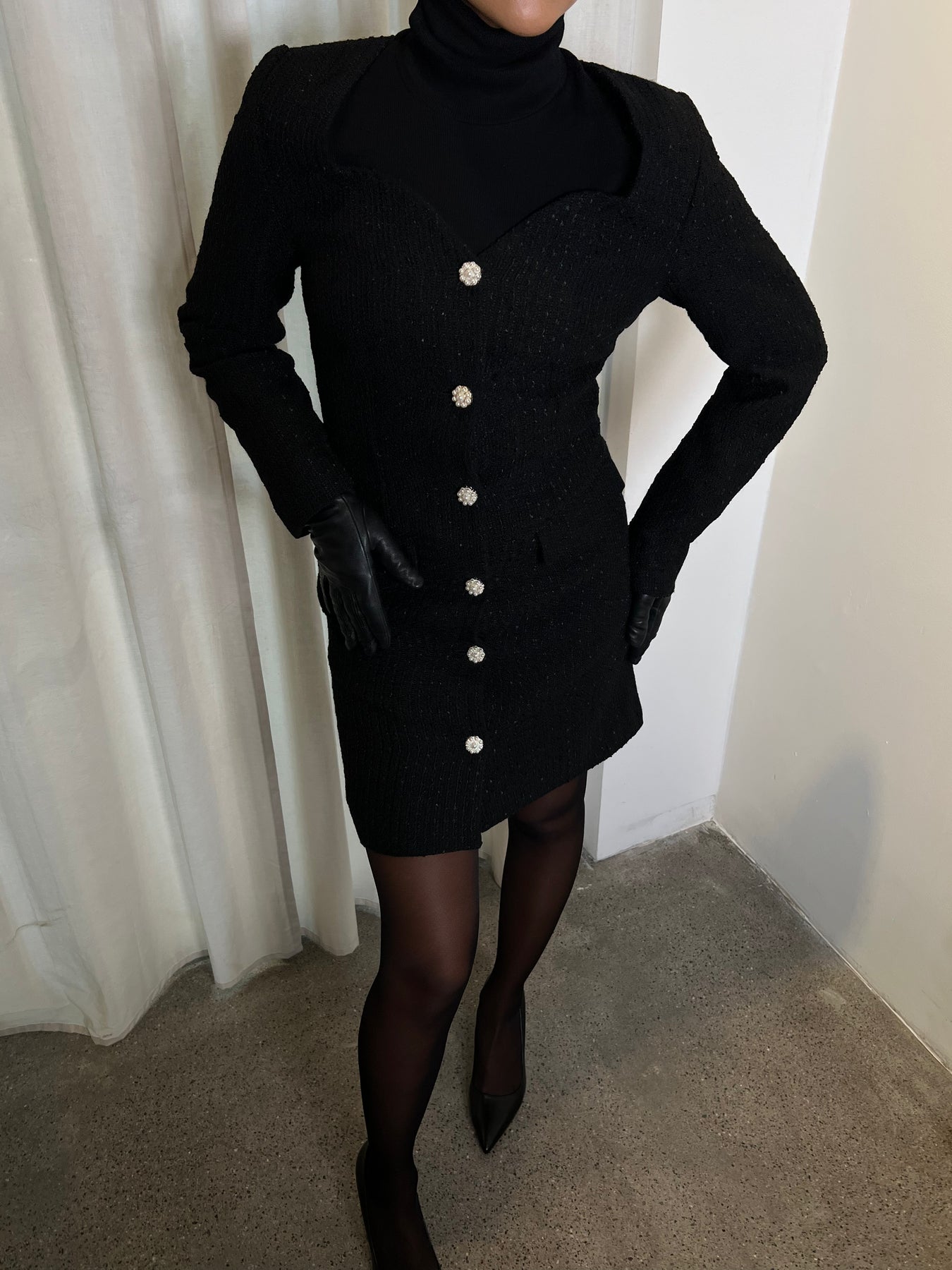 Lilo Mini Dress fra Love Lolina. En tidløs, sort minikjole i teksturert tweed med subtil glittertråd som gir et sofistikert skinn. Kjolen har en feminin hjerteformet utringning, lange ermer og markert midje som fremhever silhuetten. Perlebesatte knapper i front tilfører et luksuriøst preg, mens de dekorative lommene gir balanse mellom klassisk og moderne.